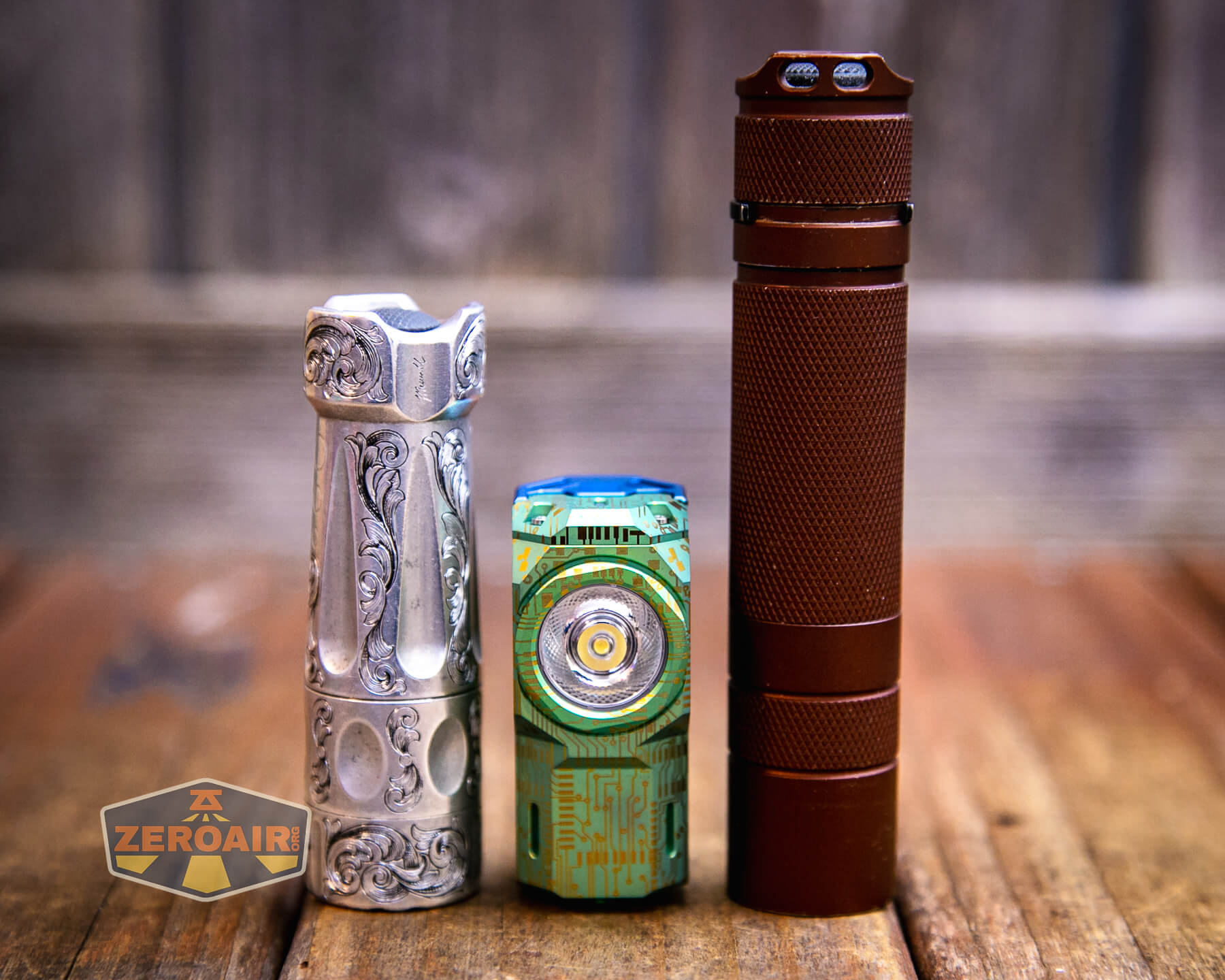 Also above is the light beside my custom-engraved TorchLAB BOSS 35, an 18350 light. I reviewed the aluminum version of that light in both 35 and 70 formats.