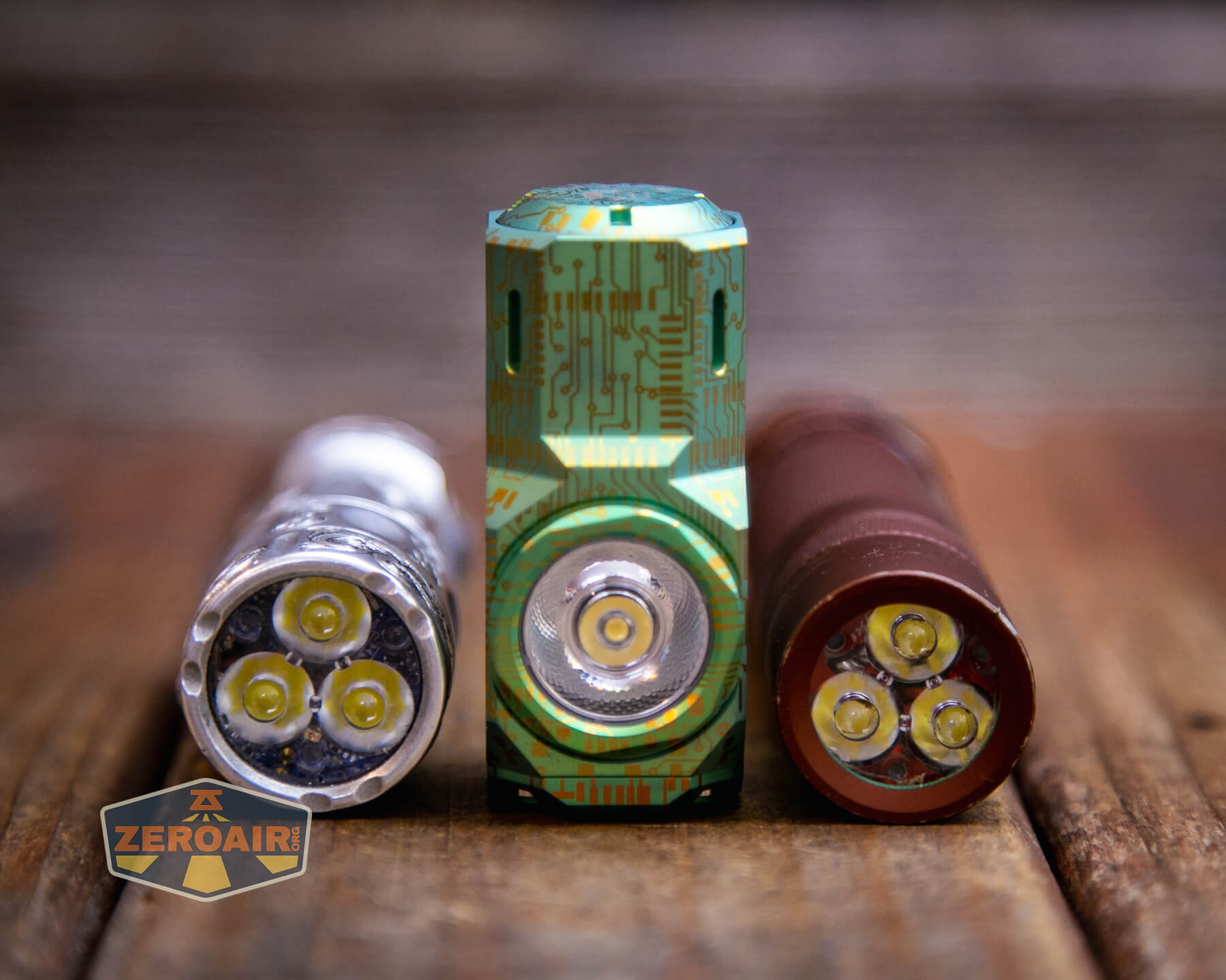 There are two emitter options, and they’re available in different body finishes. Both aluminum and titanium are available. Below, the white and black are aluminum, and green and grey are titanium. Here’s a stock photo by Wuben. The emitters are Osram P9 and Samsung LH351d – based on specs, I think this is the Samsung version. Obviously, after this stock photo, Wuben has added the brass version seen in a previous review, too.