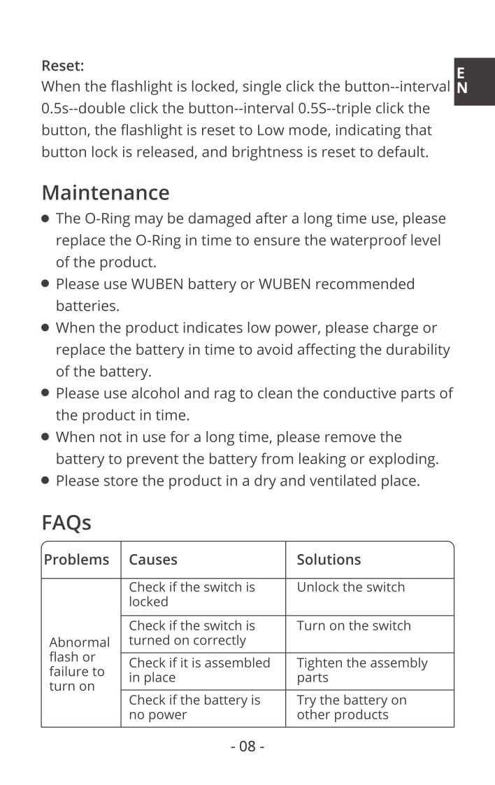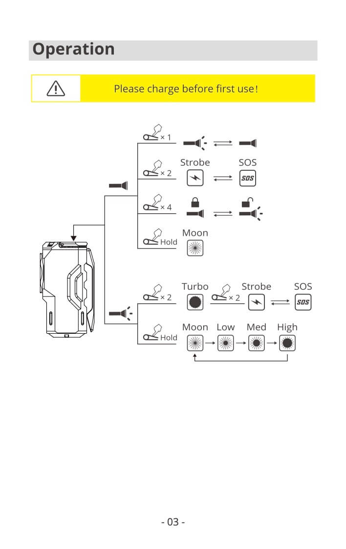 | Lockout | Click [wait], Double Click [wait], Triple Click | Resets light to default state. Light unlocks and turns on to Eco to confirm. |