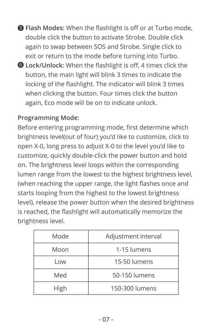 ^^ In programming mode, the output ramps up to the maximum possible for that level and blinks then begins ramping down to the lowest output possible for that mode and again blinks. When you release the switch, that mode is programmed