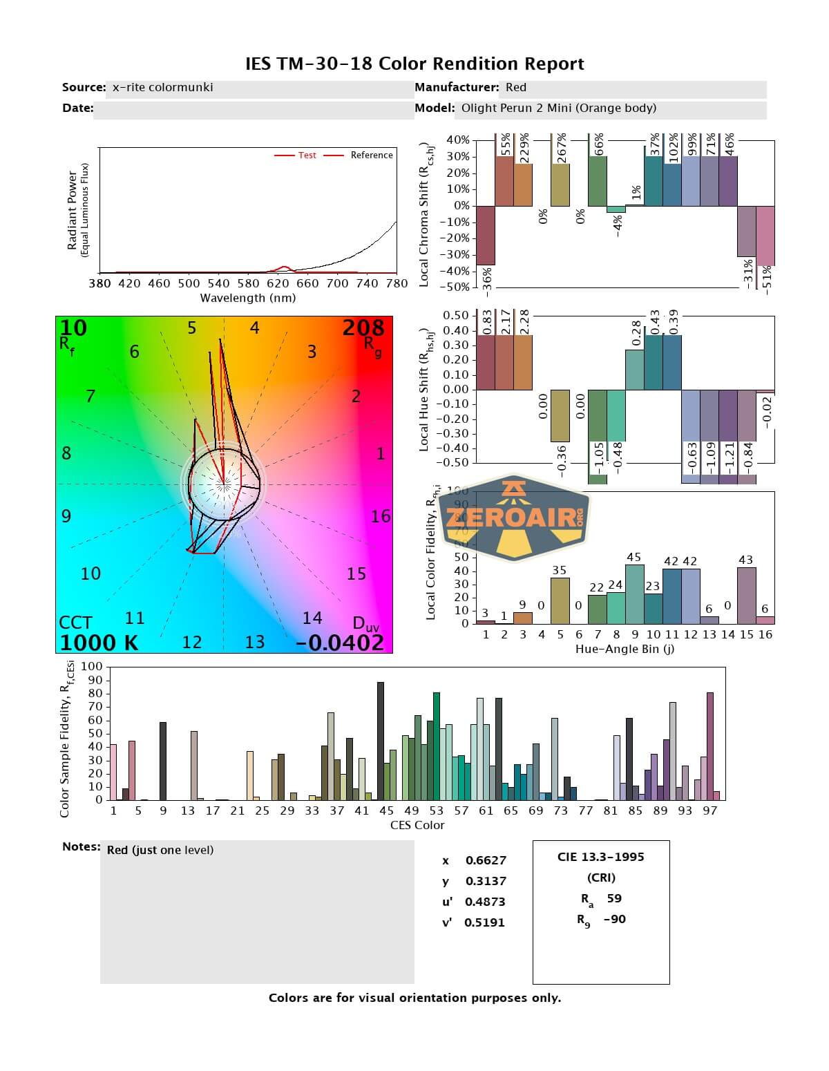 The Perun 2 Mini output is around 6000K and has low CRI. Red is very red!