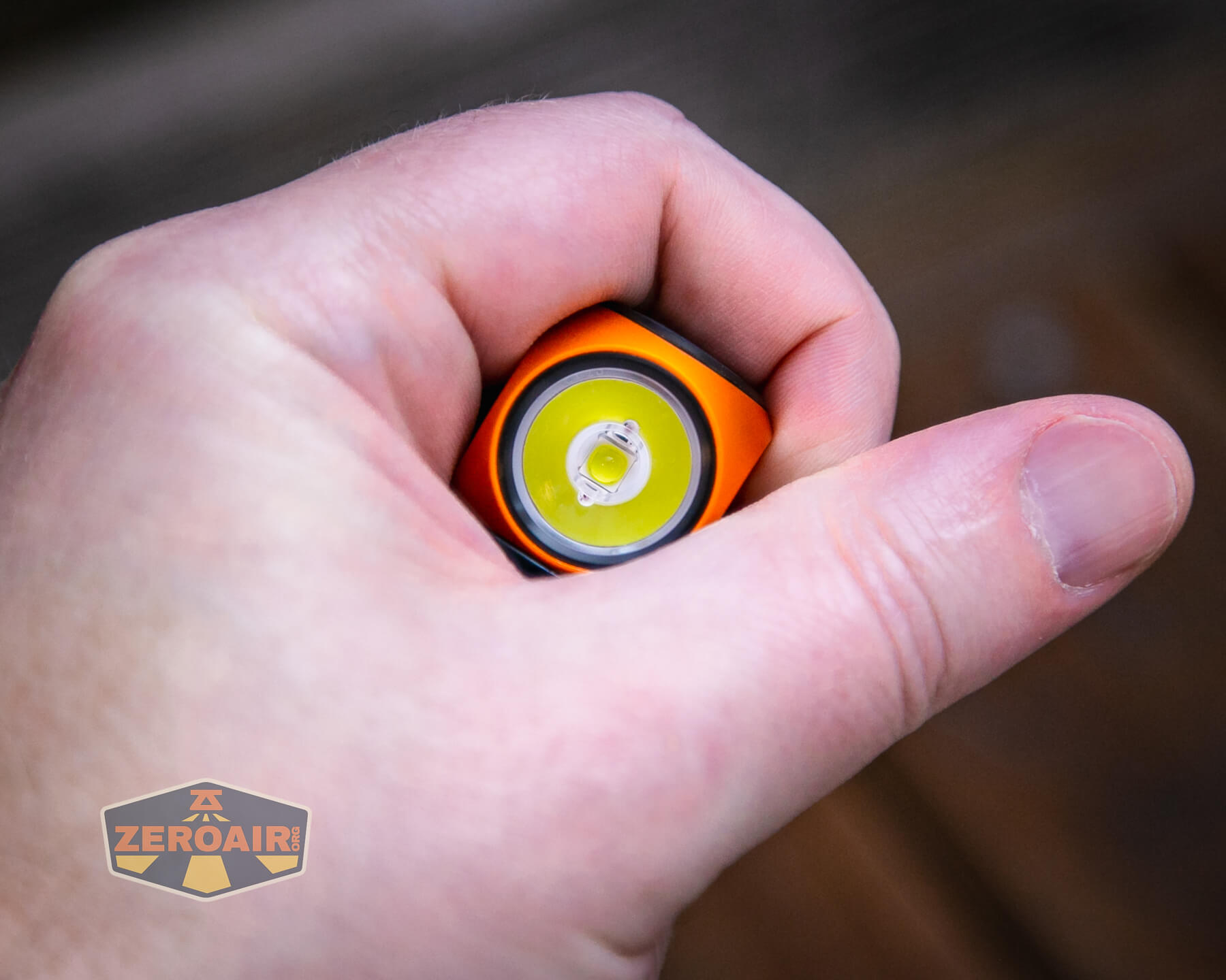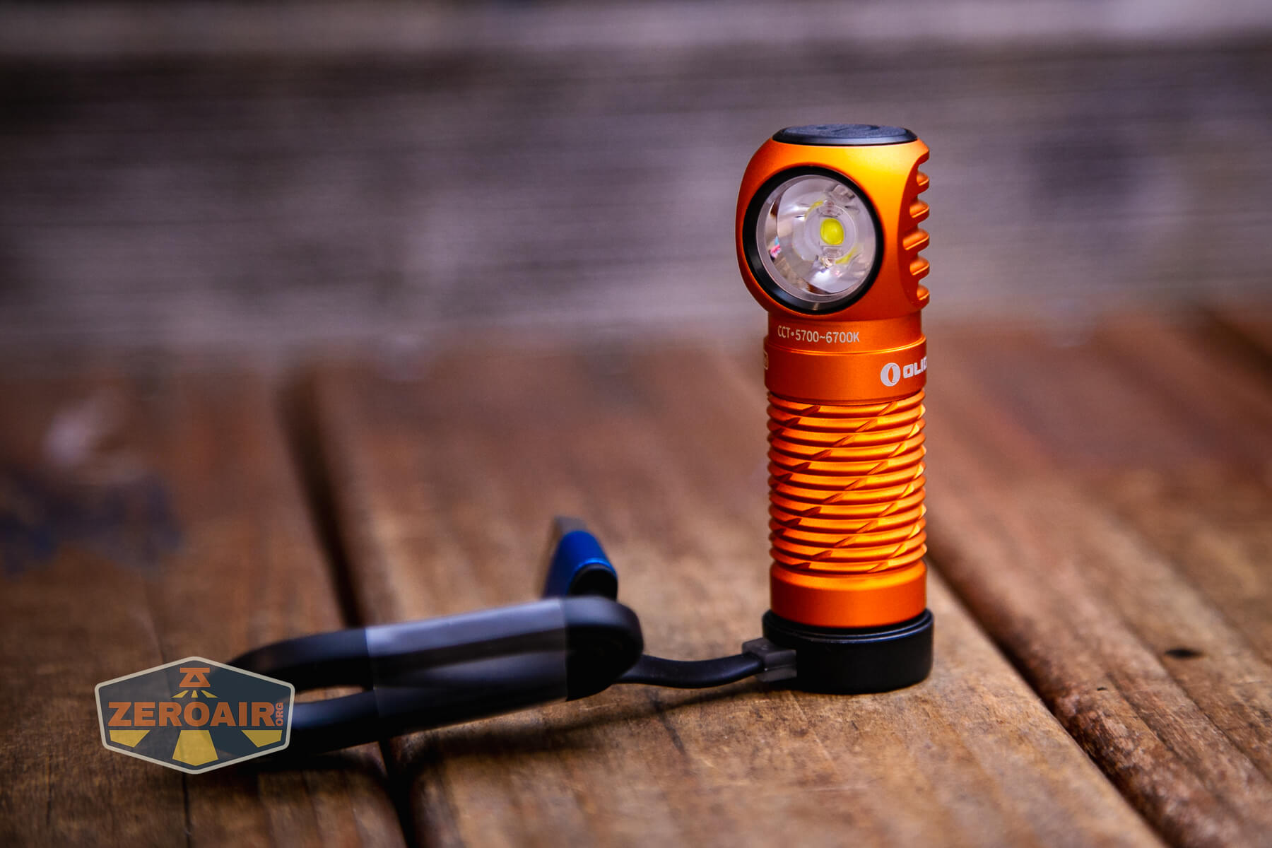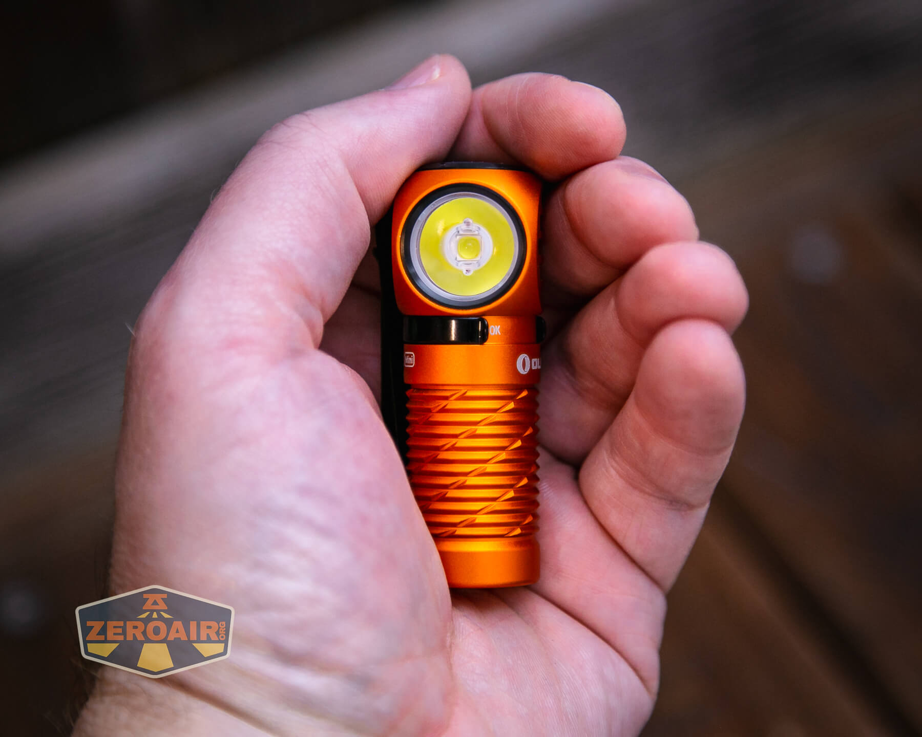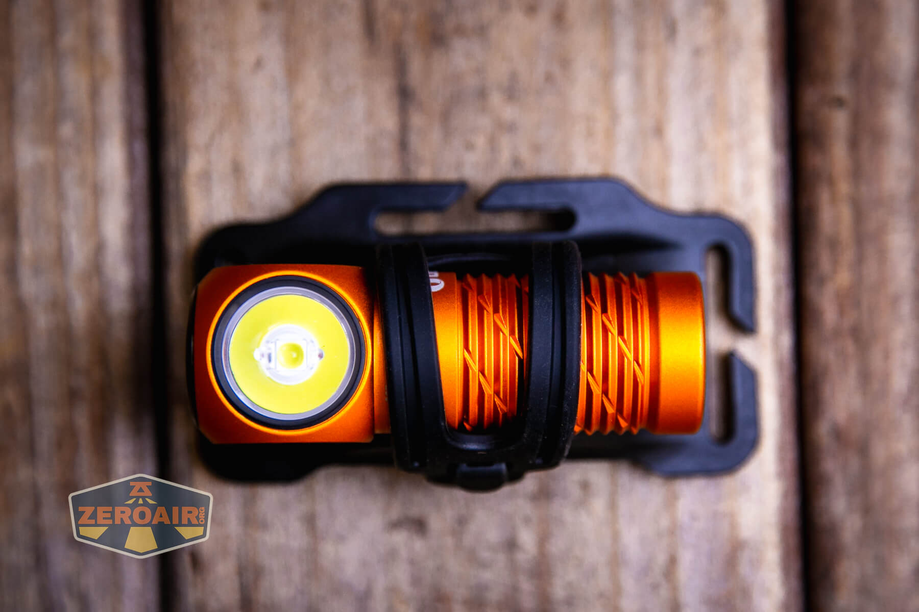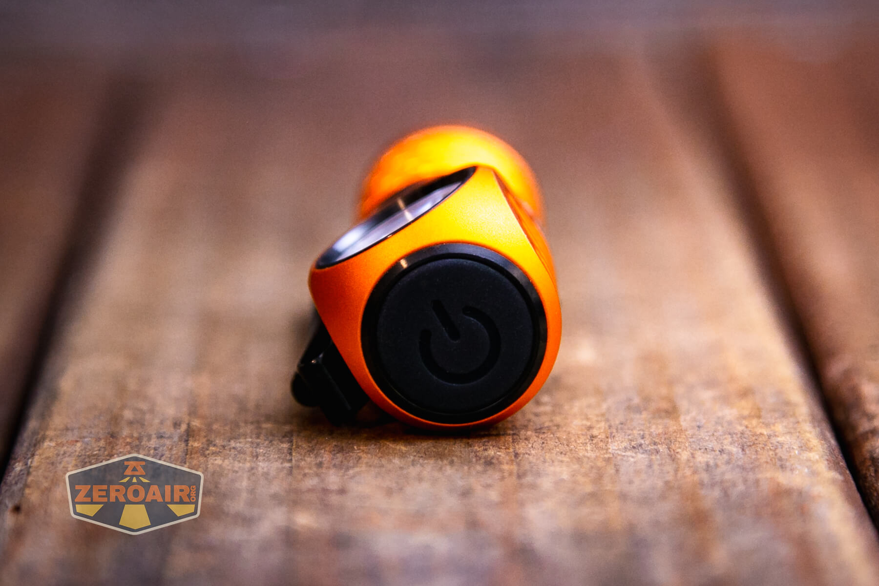 The Olight Perun 2 Mini headlamp uses a single e-switch on the head. It’s a big flat switch, and nice and soft. It is not the least bit proud, which allows the light to headstand. The Perun Mini is not quite perfectly vertical when headstanding, but works fine.