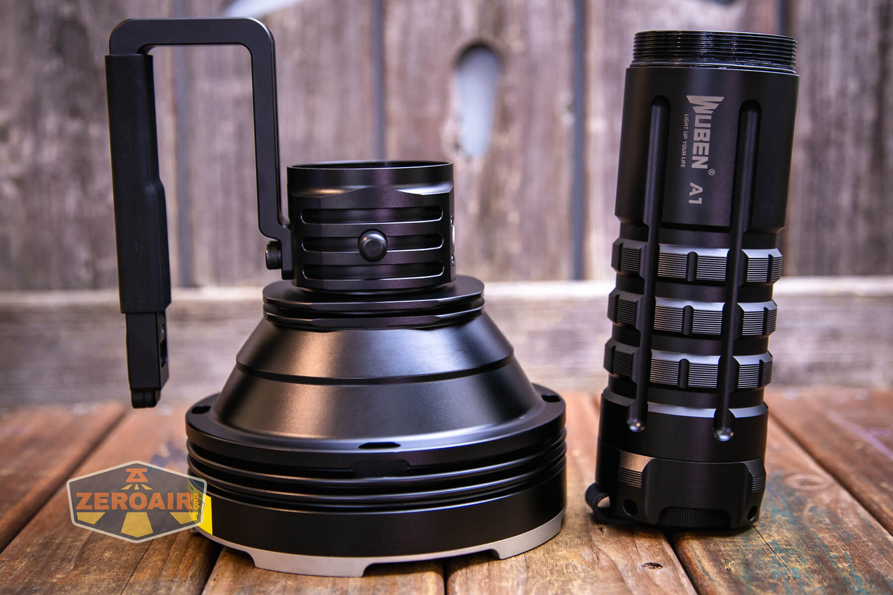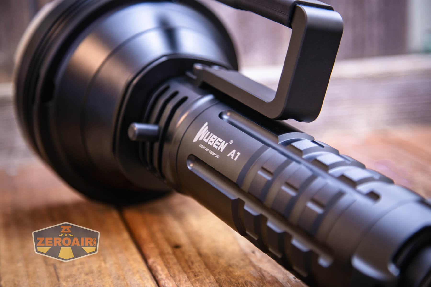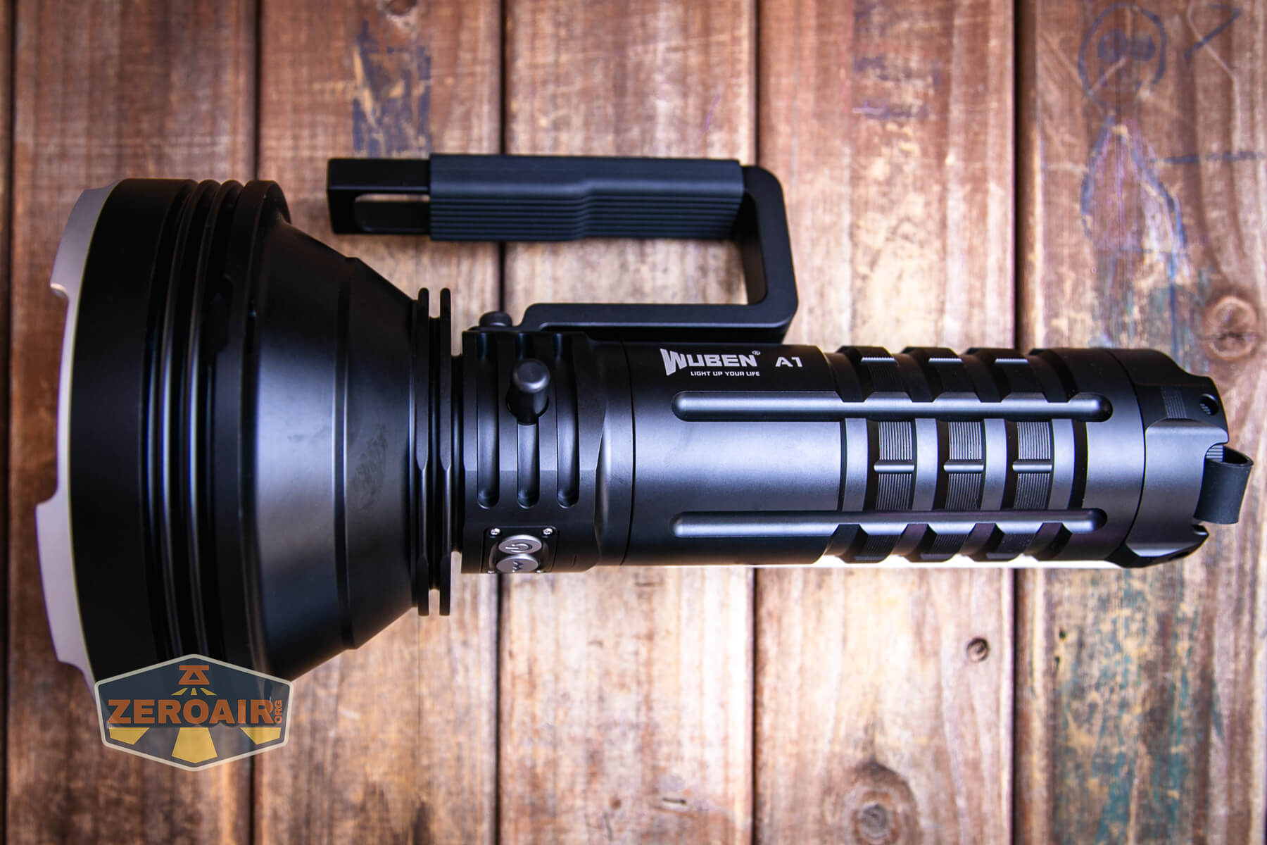 The Wuben A1 spotlight is remarkably large. (More on that later, relevant to the Power section.) It’s heavy and large, but there’s a point to all that – it throws!! The build quality is great though. For example, the handle is very secure, plenty grippy, and also well balanced. It’s a very nice setup.