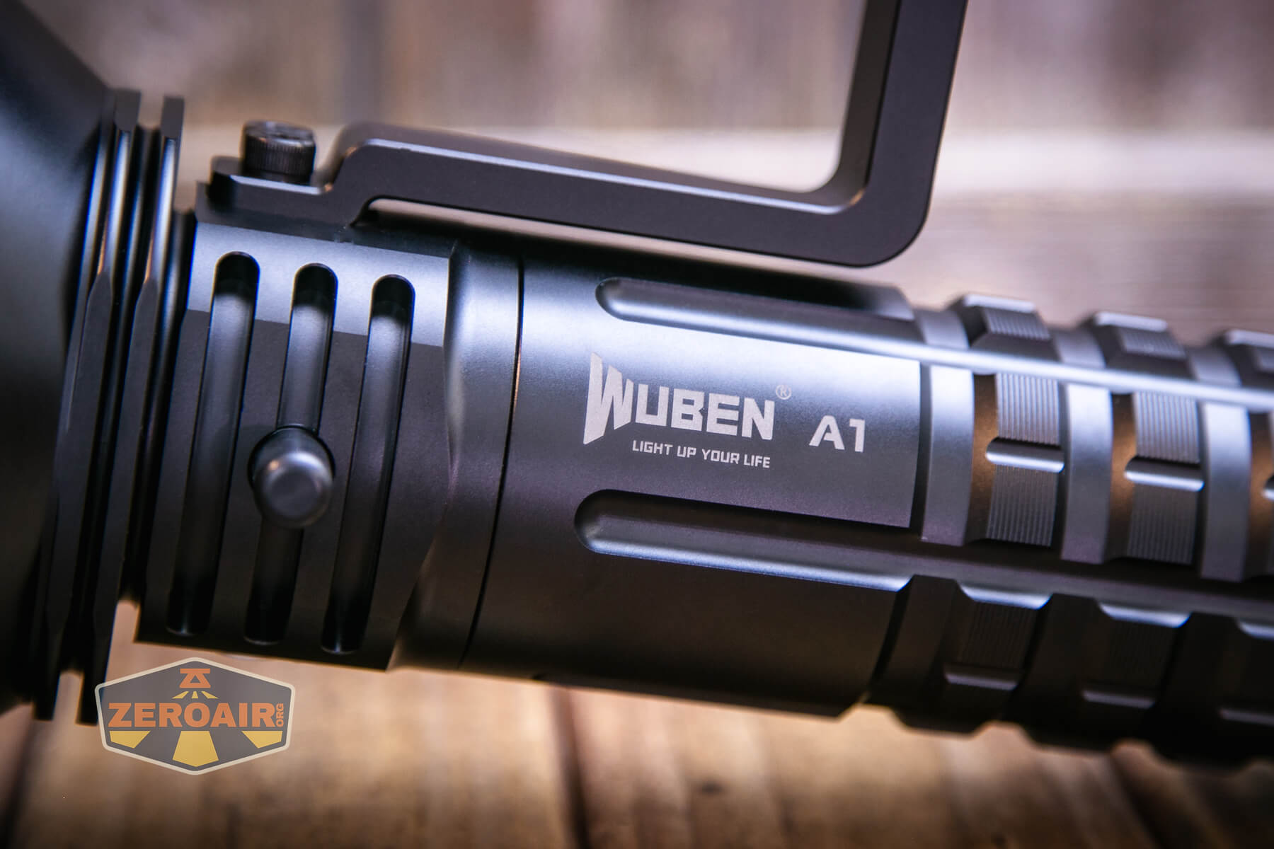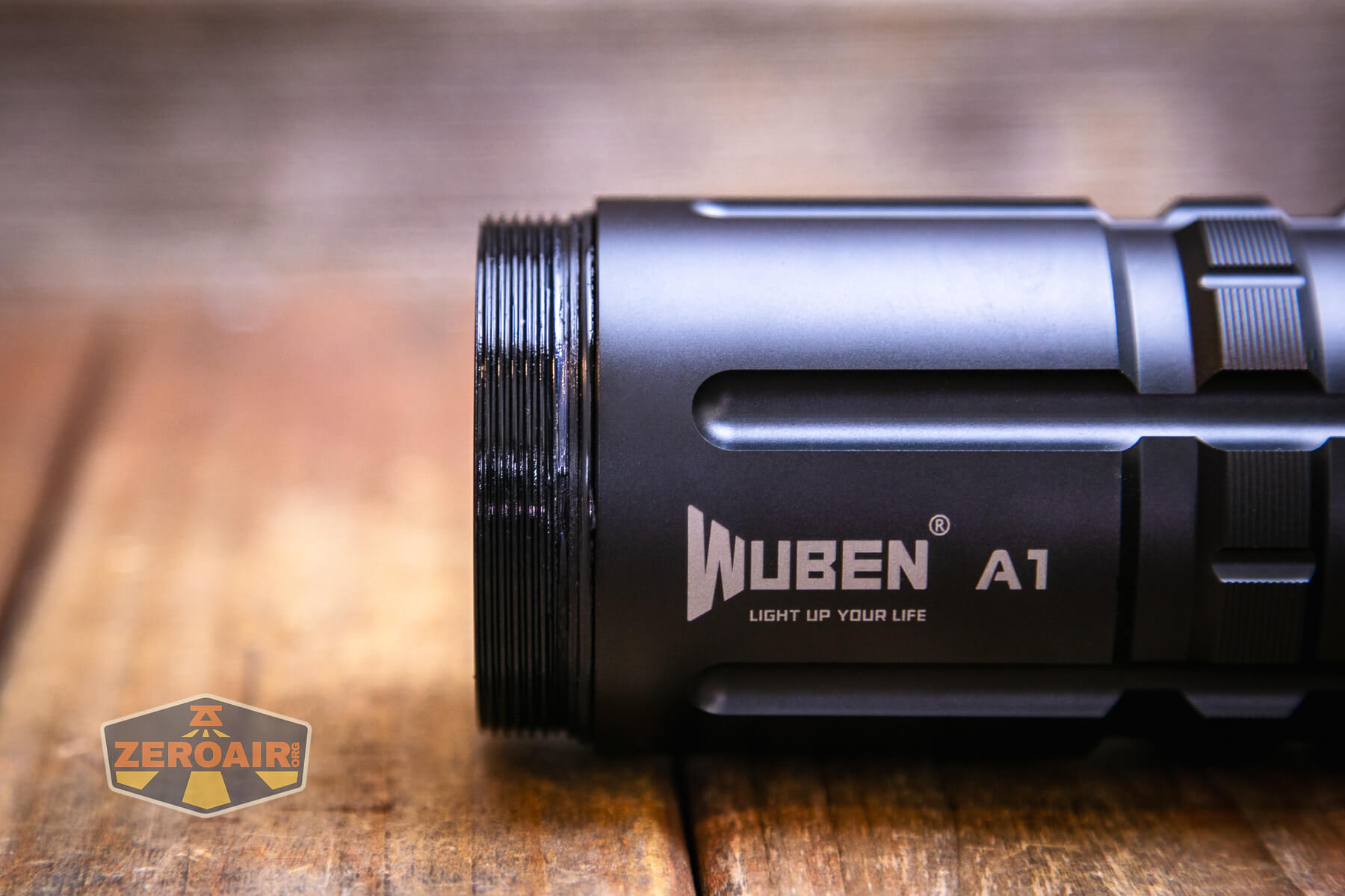 A large black Wuben A1 flashlight with a handle rests on a wooden surface. The flashlight features a grooved body and a reflective lens. A ZeroAir logo appears in the lower left corner.