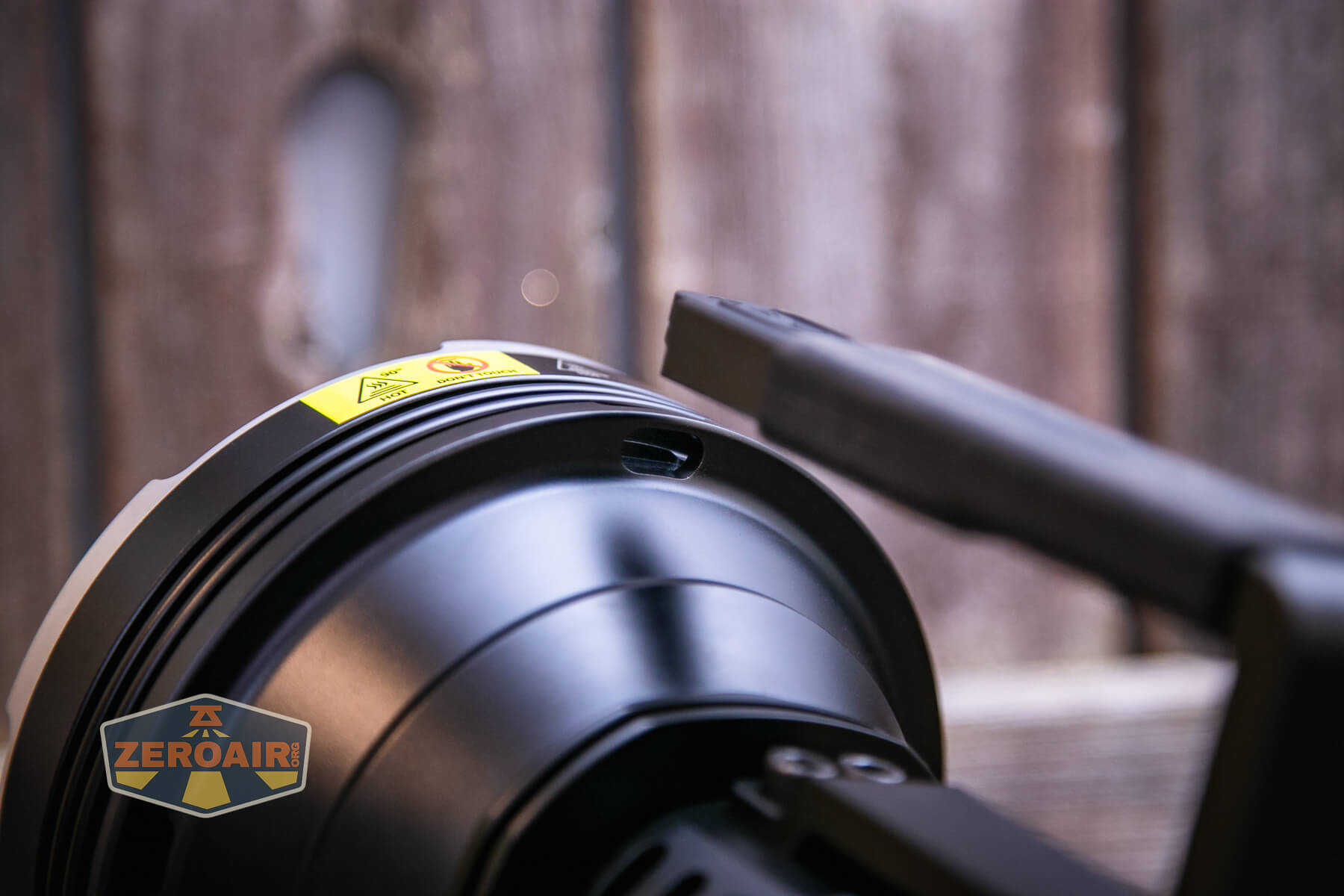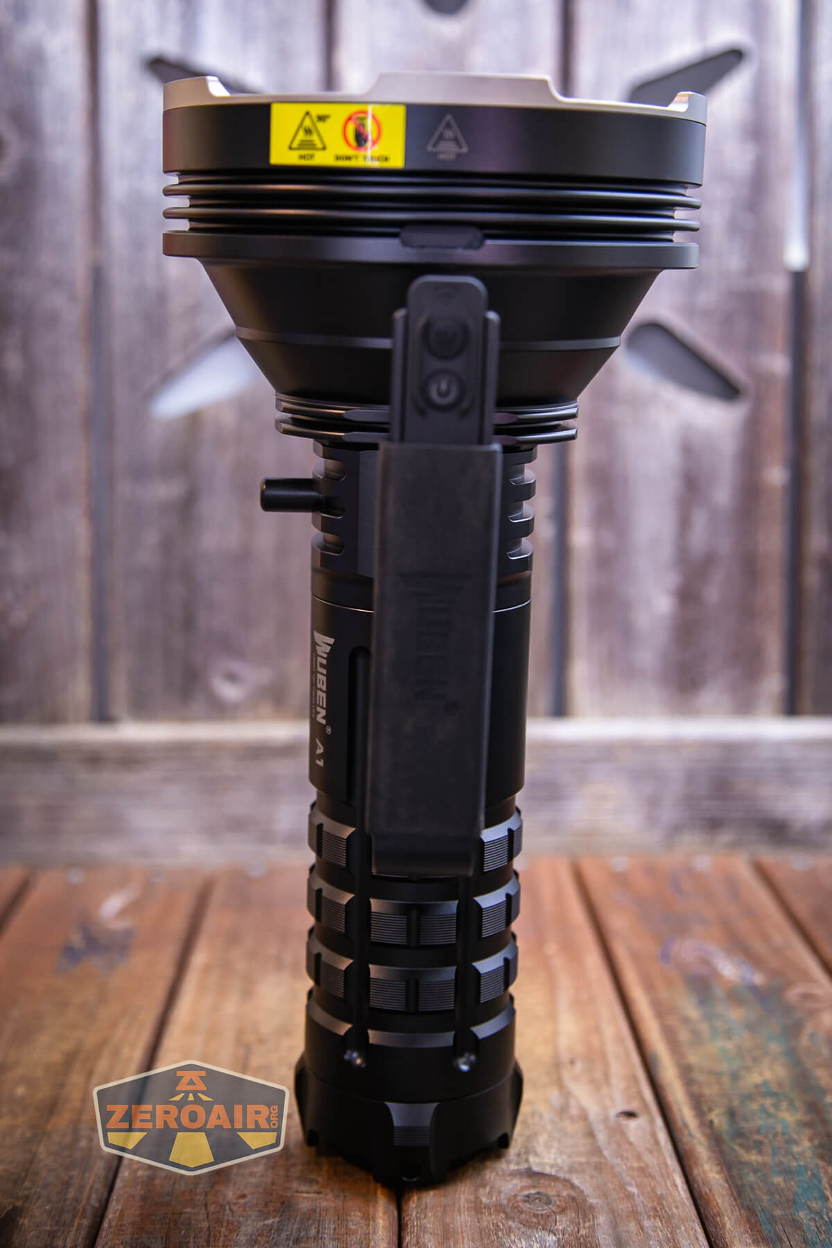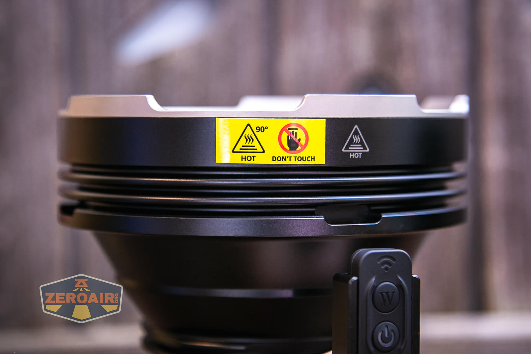 Check out the balance! The A1 rests on the handle very perfectly. Around the head and in the switch area you can see there are some cooling fins. You’ll also note the yellow sticker on the head indicating a temperature warning. That sticker says 90 degrees (doesn’t give a unit, but it’s definitely Celsius; you can see that information in testing below.) Take note of that warning… the light gets HOT!