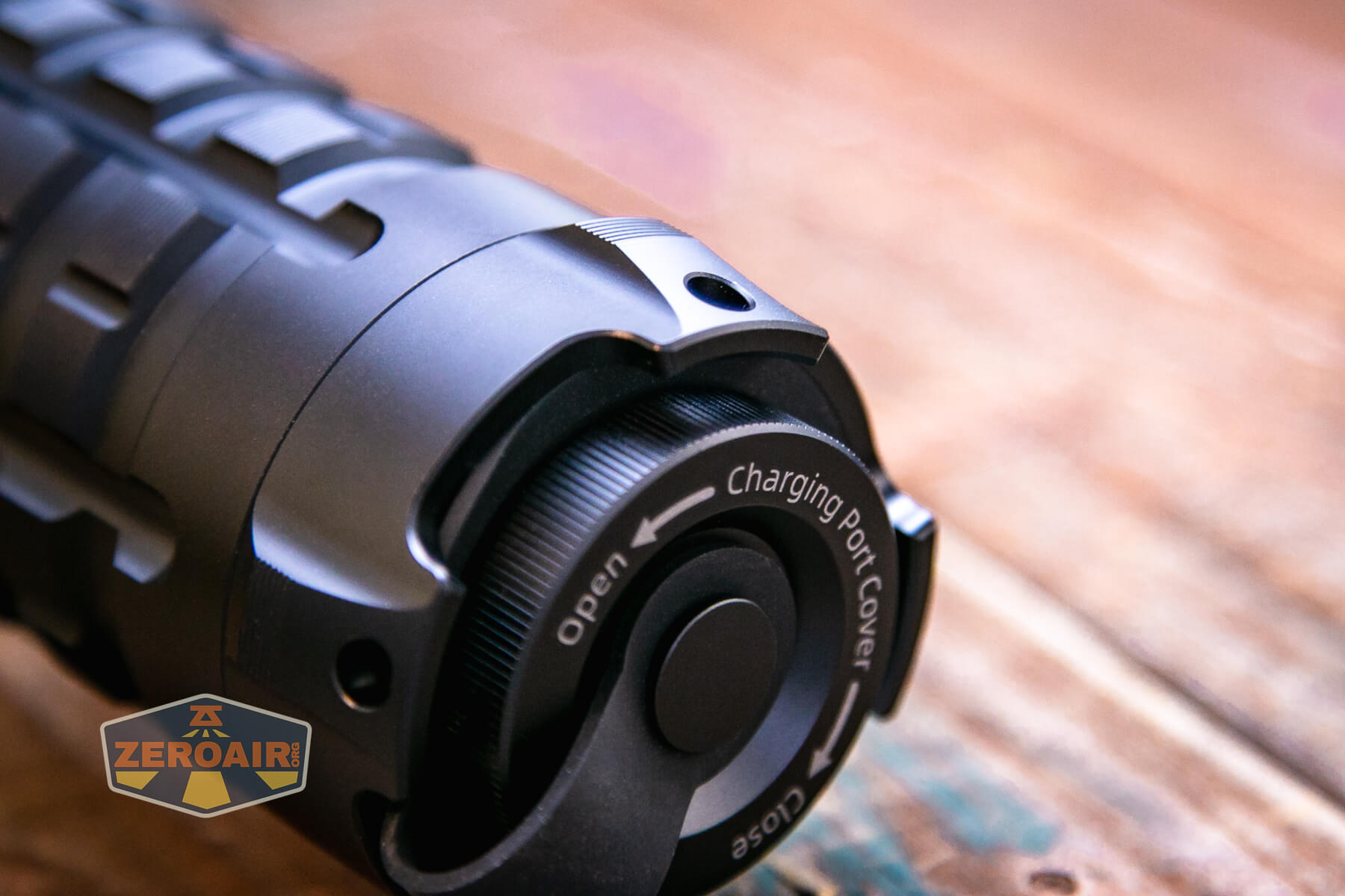 Along with the built in battery comes onboard charging. On the A1, this is by way of a DC barrel plug. The plug is accessed by this port on the tail. Here you can see the little soft flap that the tailcap is both attached to and screws down on to, and provides the watertightness of the tailcap.