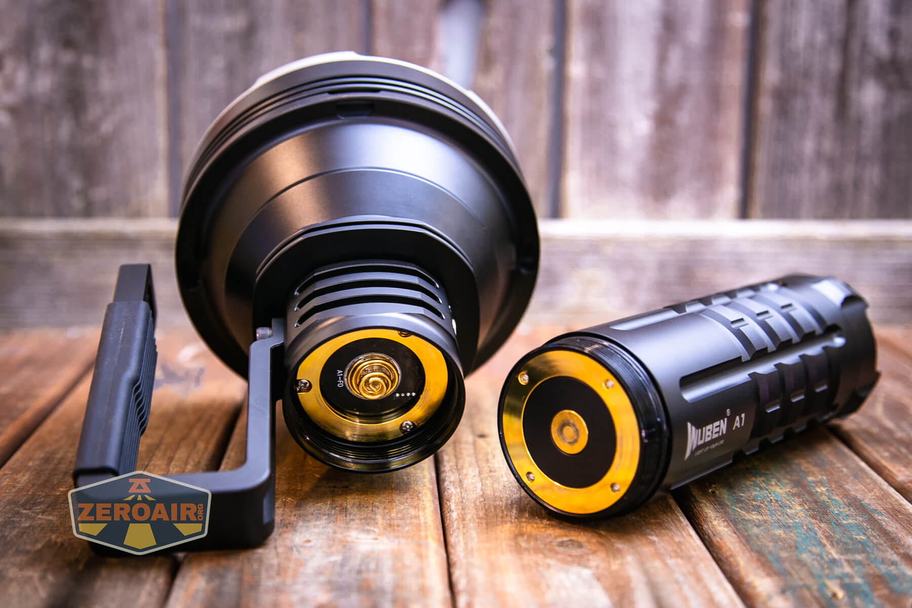 The Wuben A1 spotlight ships with the required battery. It’s a battery – one piece. But internally it’s eight 21700 cells that are probably soldered. They aren’t user serviceable, anyway.