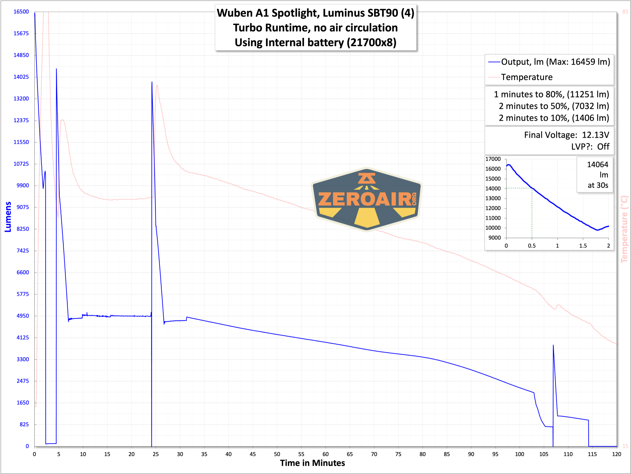You won’t see me say this often, but the temperature got hot enough on Turbo that I actually backed the light off… When I got over 90 degrees C, I stepped the light down (to low, I believe) so that the temperature could come down. It did, and I reset the light to turbo a few more times. Each time, the max output dropped a little.  and by the end (around 106 minutes), Turbo was much diminished.