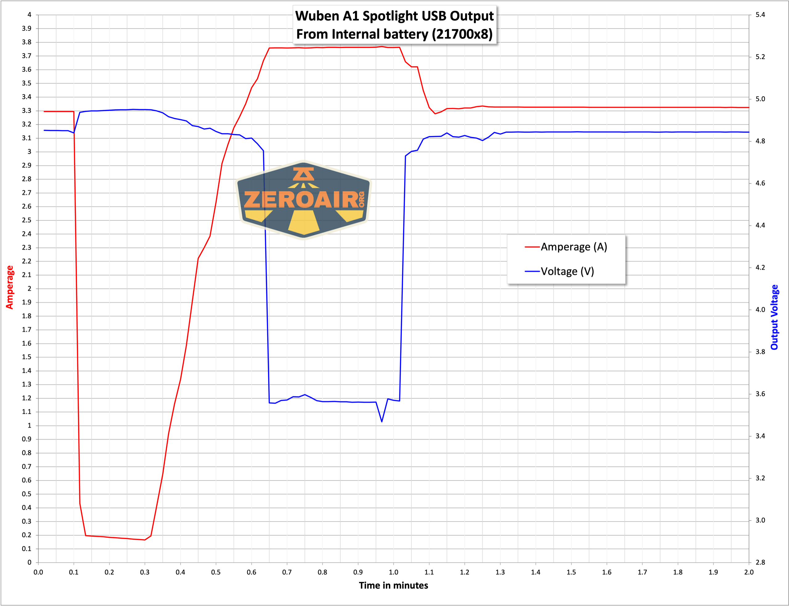 One thing to note on this output (and this is the point I mentioned in The Big Table that you should read.) My calibrated setup isn’t suited for a light with a head as big as this Wuben A1. So this isn’t strictly a calibrated test – some light was spilling out the side. however, it’s pretty close because the light is so throwy; despite being bigger than my tube, most of the light did get to the meter. In any case, the total output is definitely somewhat higher than what’s displayed in the graph.