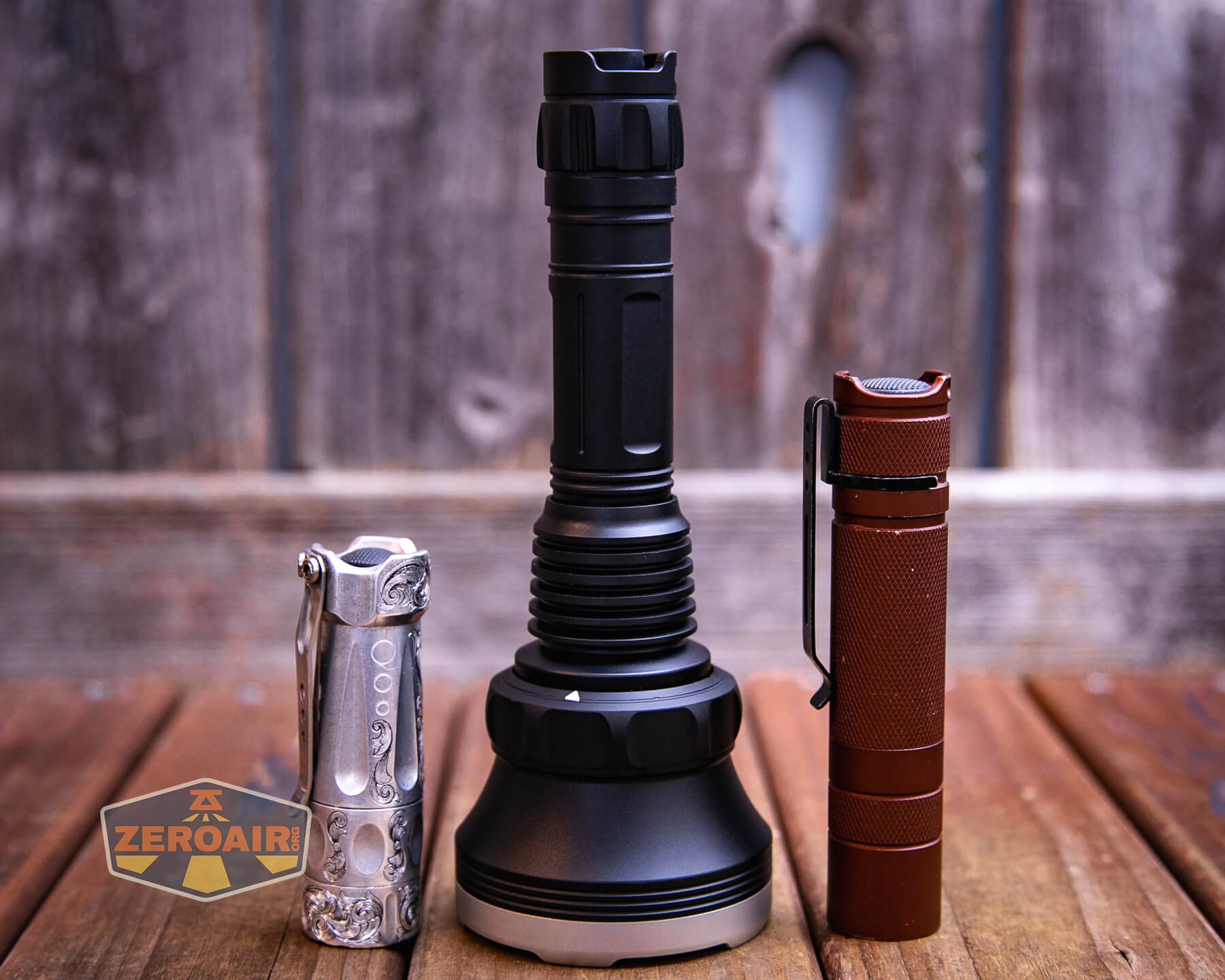 Here’s the test light with the venerable Convoy S2+. Mine’s a custom “baked” edition Nichia 219b triple. A very nice 18650 light.