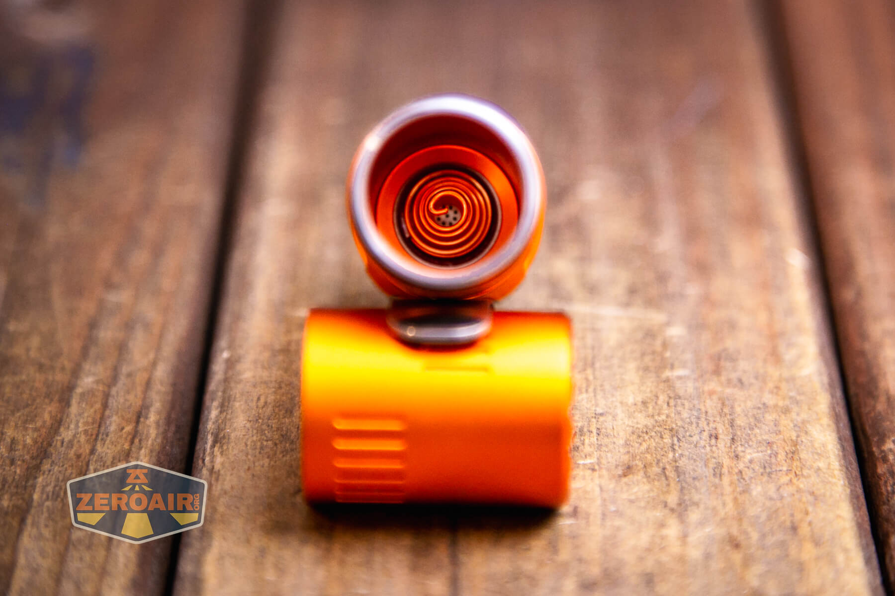Below you can see inside the head – there’s a spring (I’d call it a “q-lite spring” but maybe that’s just me.) There’s also a retaining ring for the driver. The pill appears to be screwed in and is copper. Note the threads, too. They’re unanodized, fine, and moderately long.