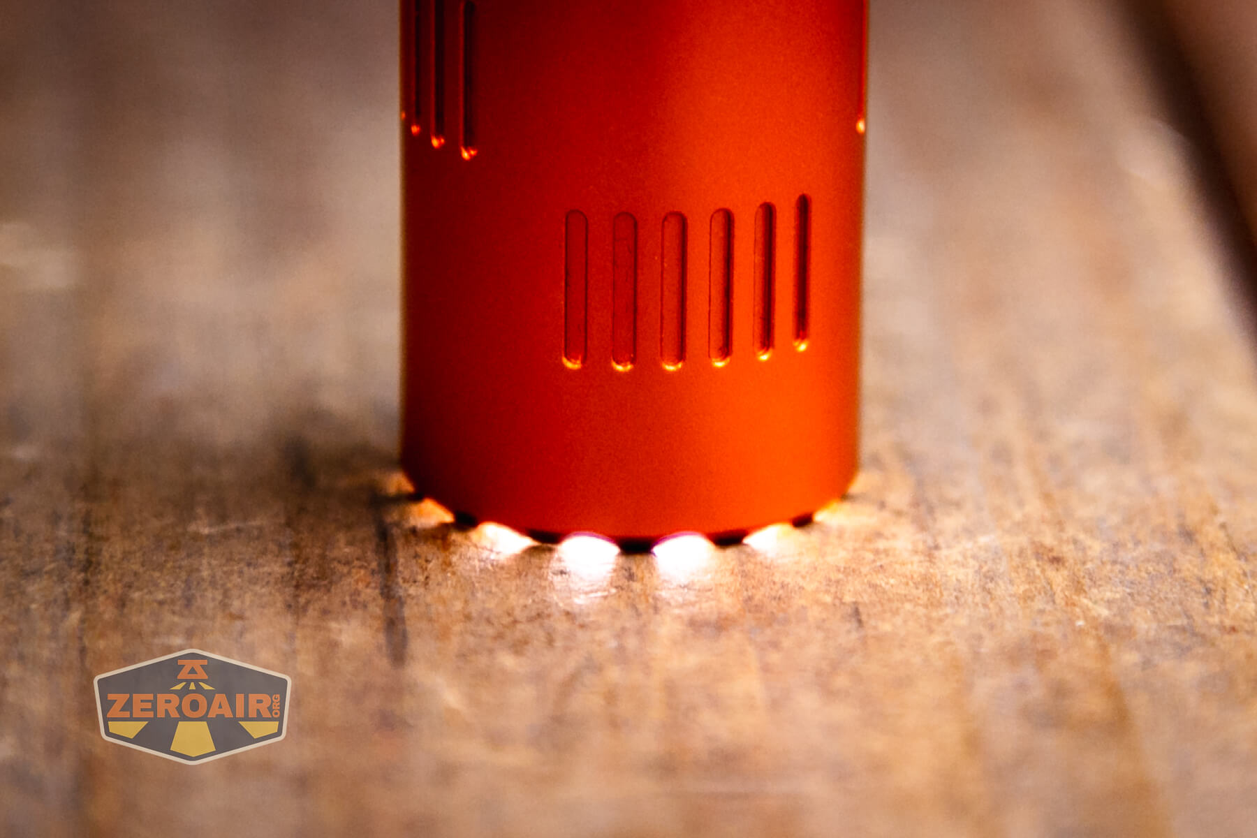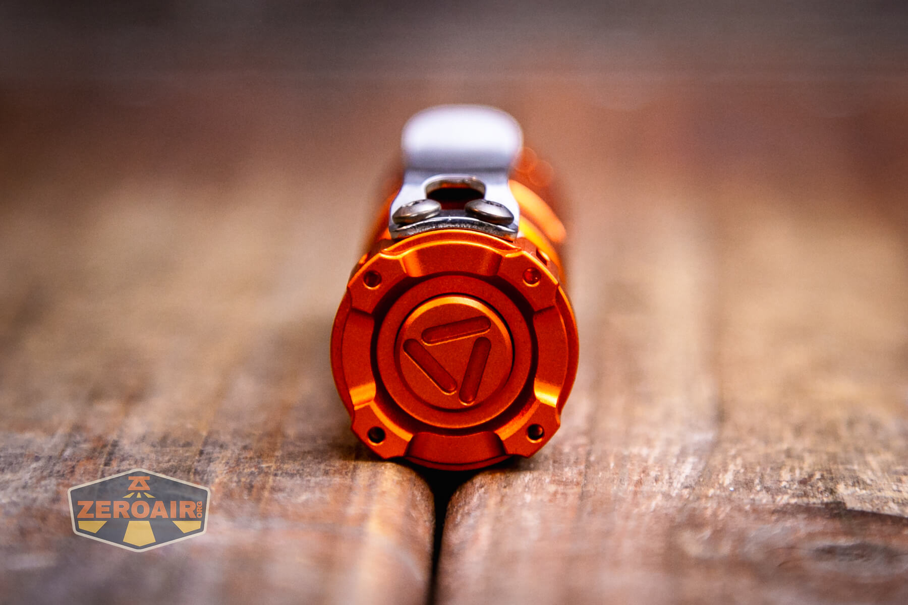 One interesting feature of the Vosteed ReyLight Rook warm white flashlight is the many (7) tritium slots. There are four around the tail.