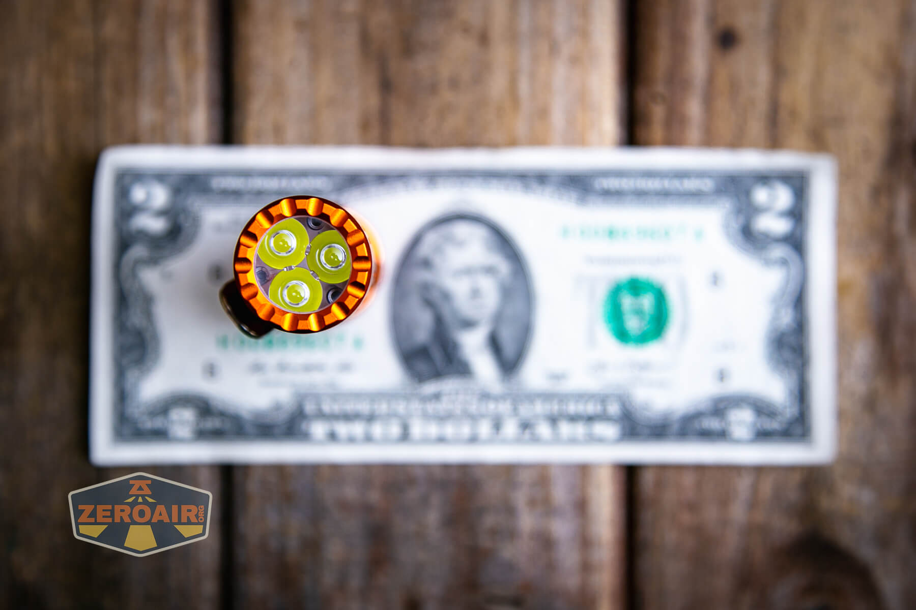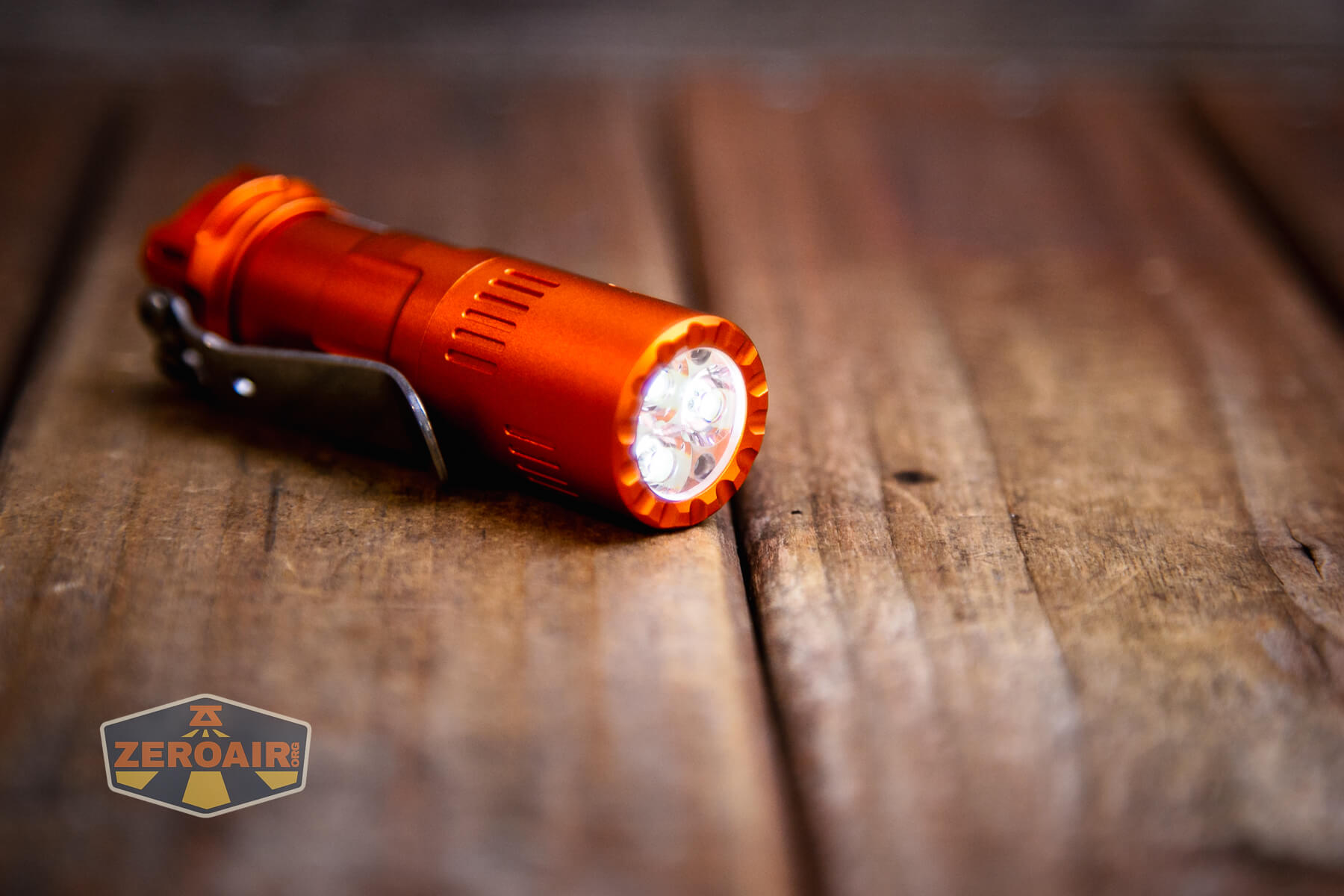 A couple of options are available (at least for the orange body, and at least at some times when they’re in stock). A Cree XP-L HI option is available and commands a $5 premium. Cree is the higher output option and also has a much tighter beam. A Nichia 519a option is also available, and that’s what’s tested here.