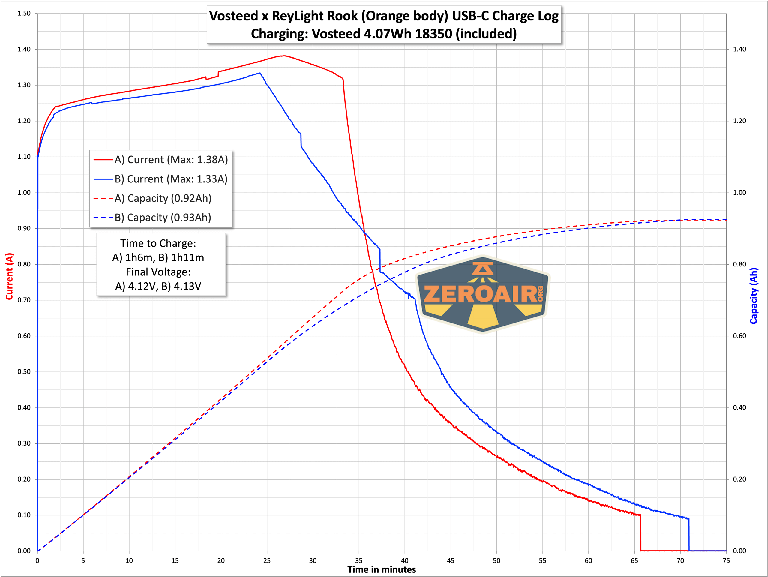 The cell seems to stop charging at around 4.12V – 4.13V. Both USB and USB-C (C to C) charging work fine.