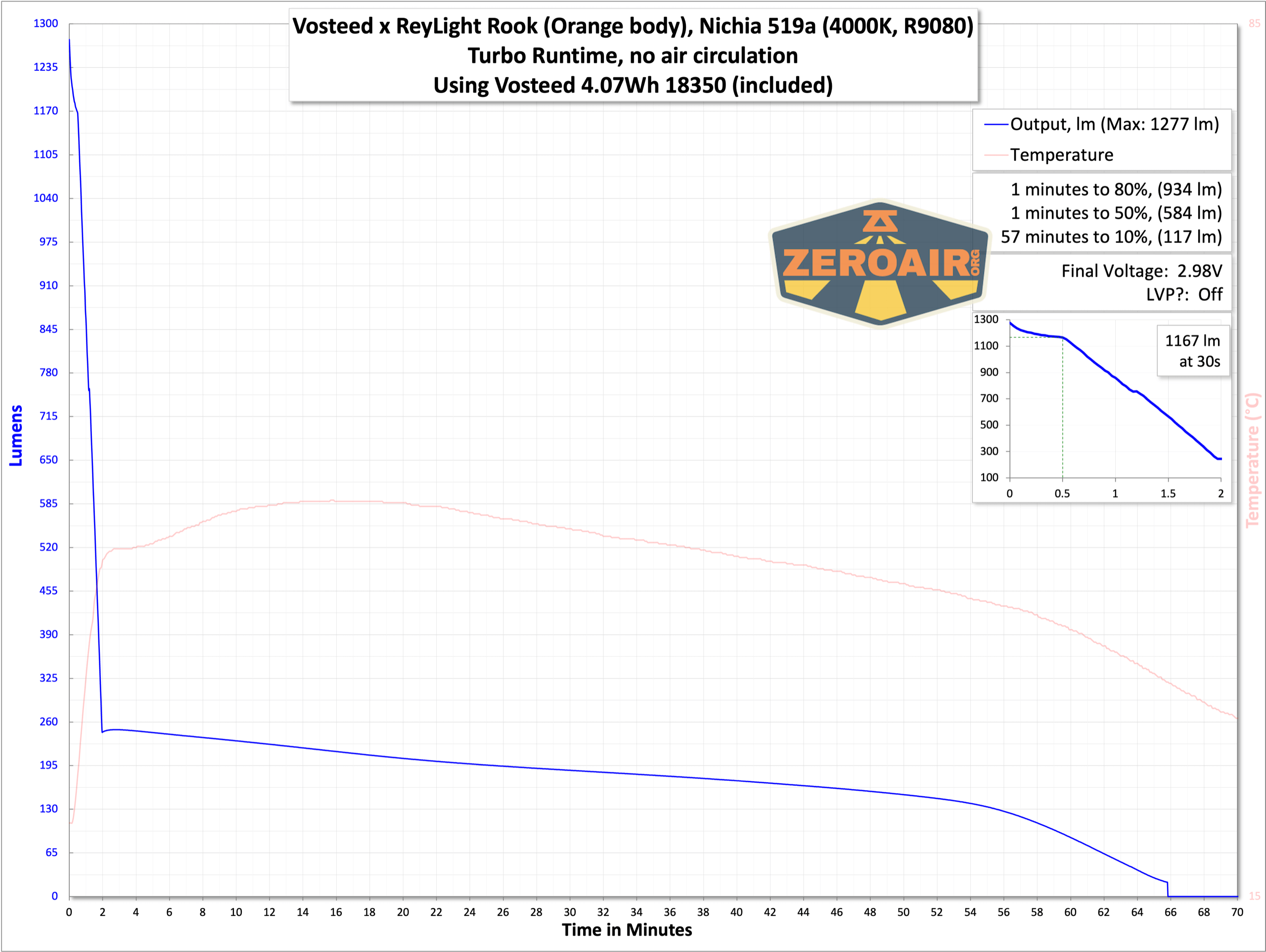 Here are a couple of runtime tests. I didn’t observe the claimed 1800 lumens, and the stepdown begins in earnest at around 30 seconds. I tested the default modes, but the mode groups are such that you don’t always get all the highest modes on any one group. That’s ok, but it’s not my favorite feature.