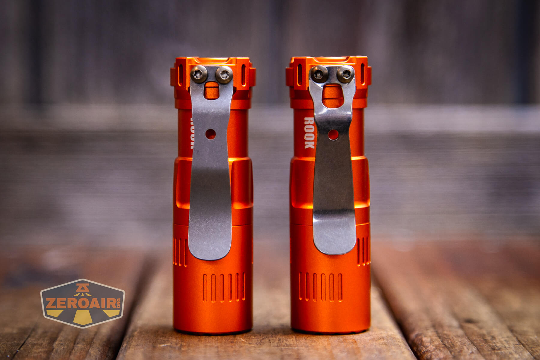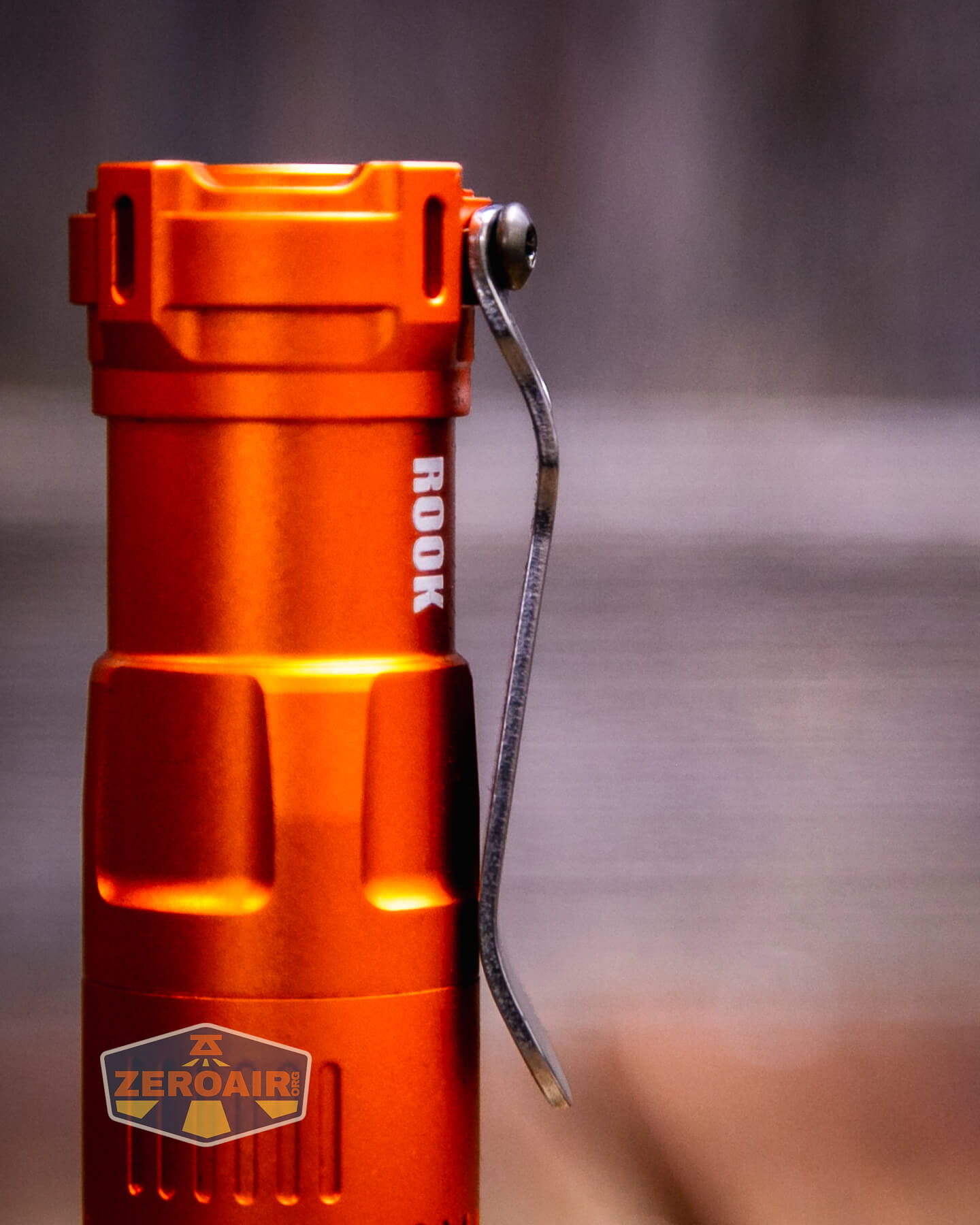 A pocket clip is included and attached to the Vosteed ReyLight Rook flashlight. First let’s talk about the clip you see below.