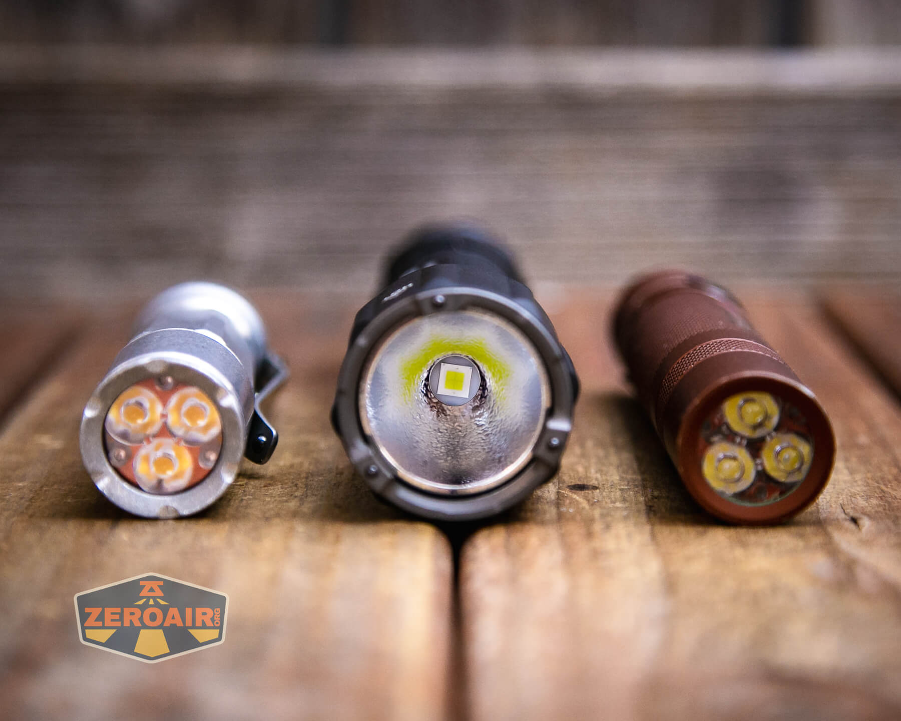 Also above on the left is a new feature light!! Laulima Metal Craft sent this Todai in tumbled aluminum for some size comparison photos like the ones above. Laulima has a bunch of incredible items. I’ve tested one (the Laulima Metal Craft Hoku) (the official site for Hoku is here) that was a Friend Fund Friday review. I was impressed enough by that Hoku that I bought a Laulima Metal Craft Diamond Slim (also in tumbled aluminum) (review is upcoming!) These lights by Laulima have impeccable build quality and not only that, they’re quite configurable. There are some (great, actually) default configurations, but Joshua Dawson (of Laulima Metal Craft) is open to ideas and emitter options and the like. I haven’t reviewed this Todai, but I have to say, it feels absolutely fantastic and I love it thus far. (Notably, I love how warm and eggy those emitters look through the TIR.)