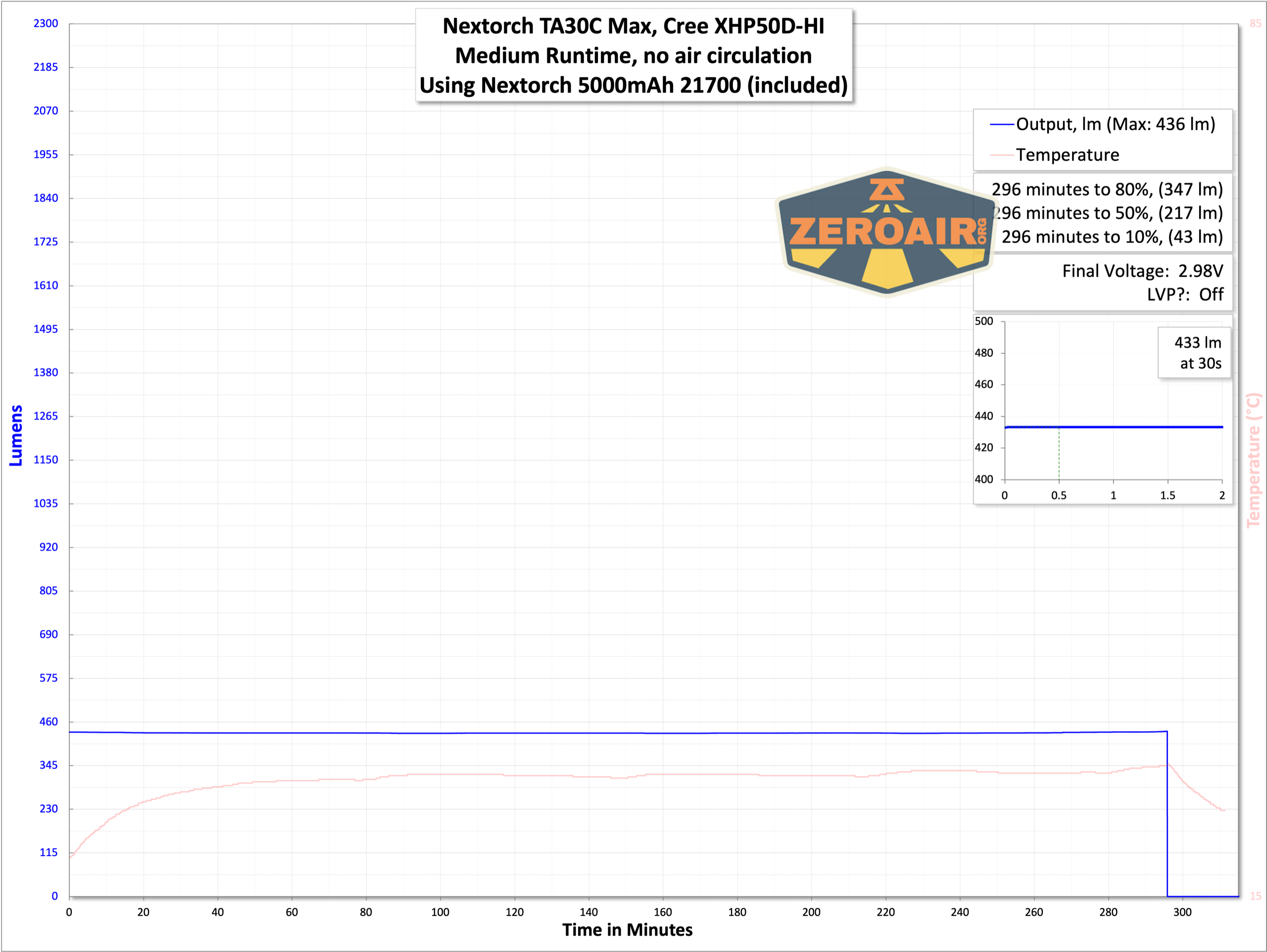 Below are a couple of runtime tests. I’m not observing the claimed 3000 lumens, but I’d have been surprised if that was achieved anyway. What we do see is a fairly quick (but not “abusive”) stepdown. By “not abusive,” I mean it doesn’t seem like Nextorch is gaming the claim system. 1 minute at the very bright output is respectable. I’ve labeled the emitter in this chart “XHP50D-HI” just like Nextorch does – I think this is the same as the Cree XHP50.3 HI (so I’ve also named it that in other places.)