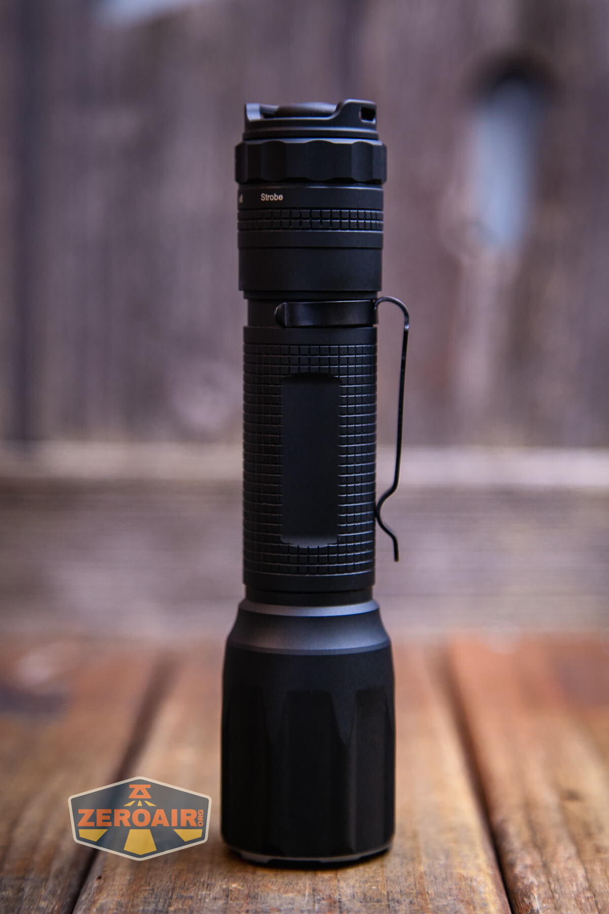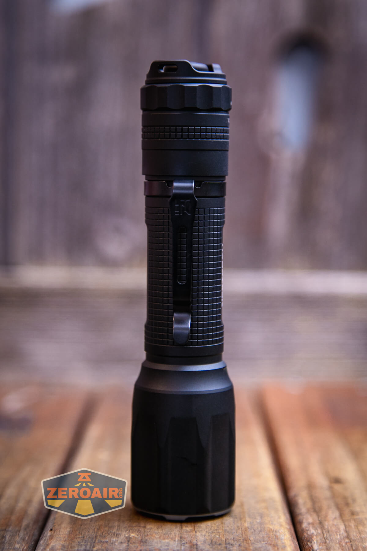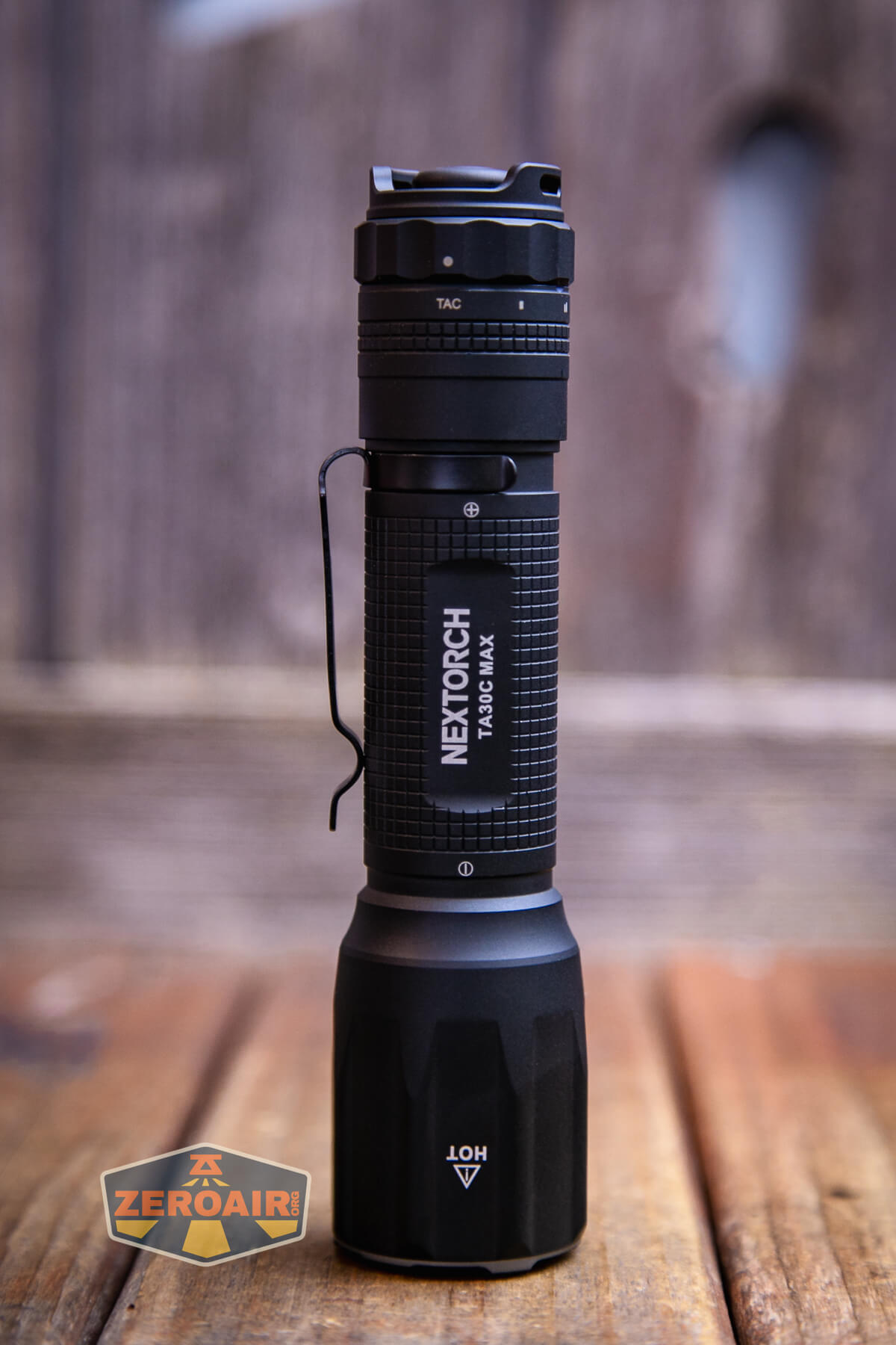 The Nextorch TA30C Max tactical flashlight has a nice friction-fit pocket clip that attaches only to the tail end. This clip isn’t designed as a “deep-carry” clip but due to the length of the light, it does function that way.