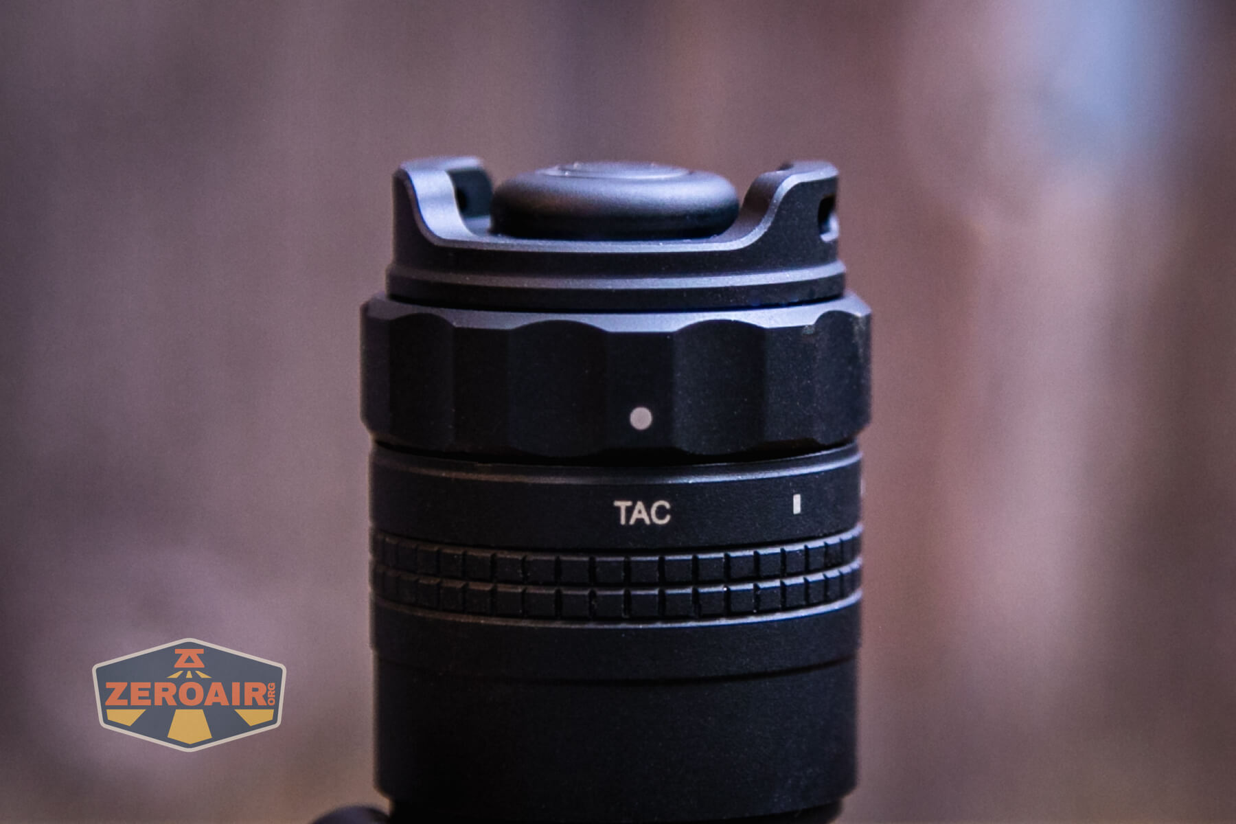 Aside from that actual switch, there’s a rotary control. This rotary control can be put in five positions. “Tac” (seen first below) is the “most off” position – in this setting, strobe is the response when the switch is pressed. This is “one-step strobe.”