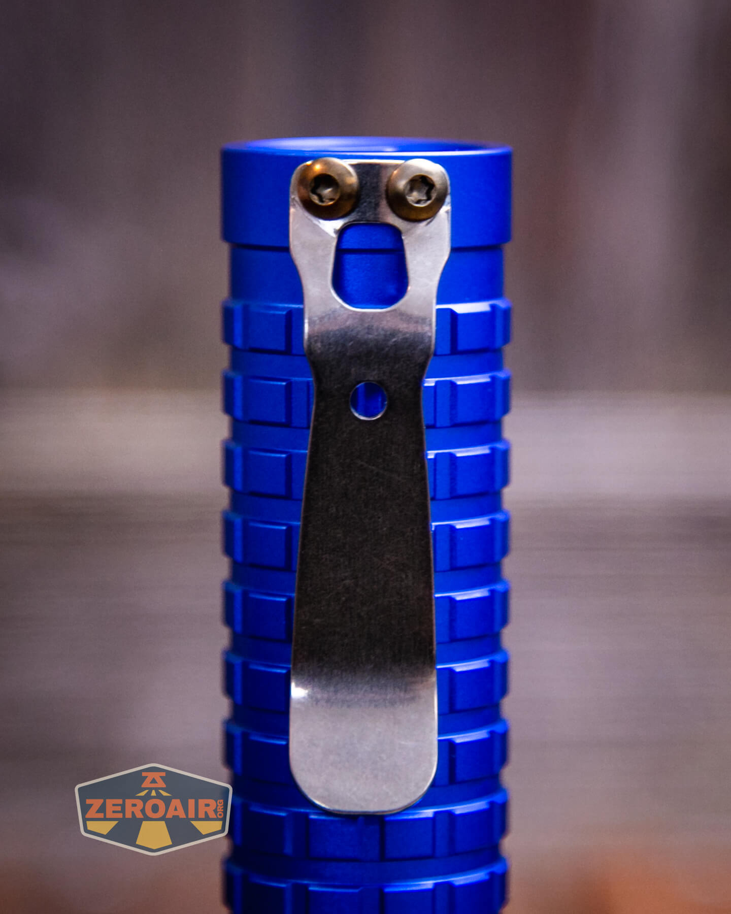 A pocket clip is included and attached to the ReyLight Dawn Aluminum 18650 flashlight.