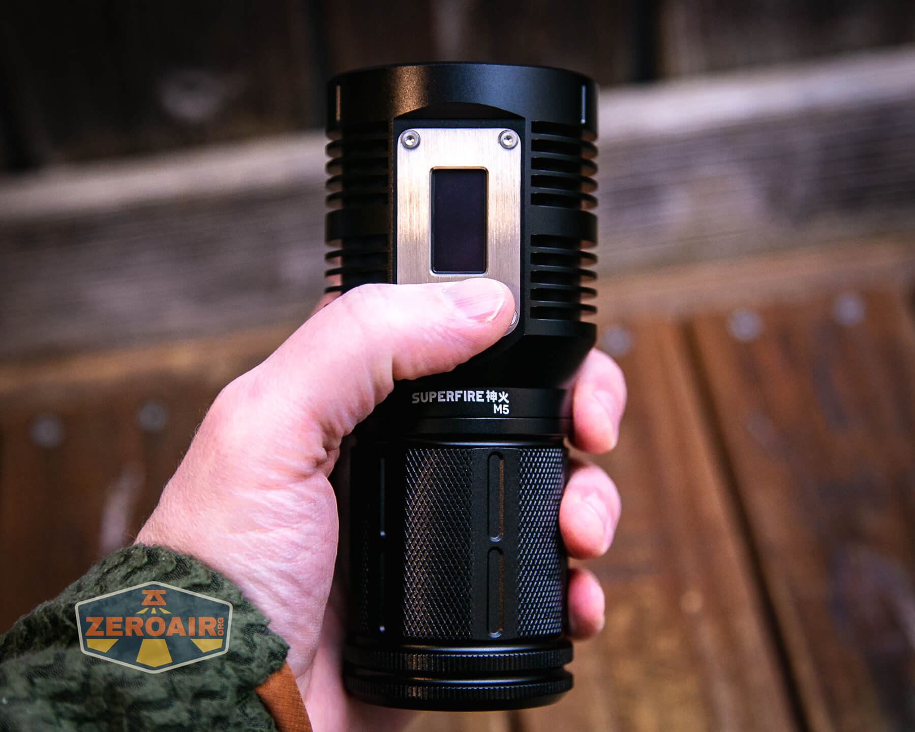 A single e-switch controls all operation of the Superfire M5 rechargeable flashlight. It’s a nice switch, too – a flat button on the side of the M5 near the LED display.