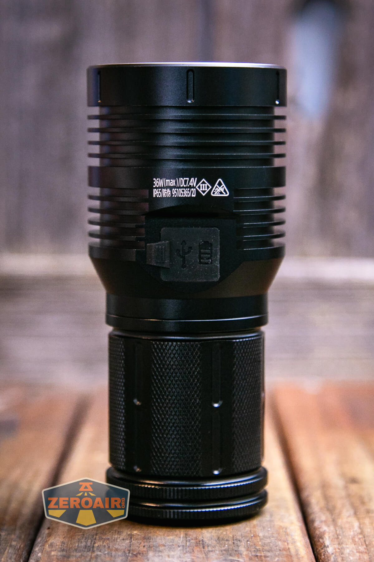 As stated above, the M5 runs on an internal battery. This internal battery is made up of four 18650 cells, and Superfire does describe them: 2600mAh. This probably means they’re fairly high current cells, which is good. The body also has the text below, stating that the light has a max of 36W output and runs at 7.4V. Thus, the four 18650 cells are in a 2s2p configuration.