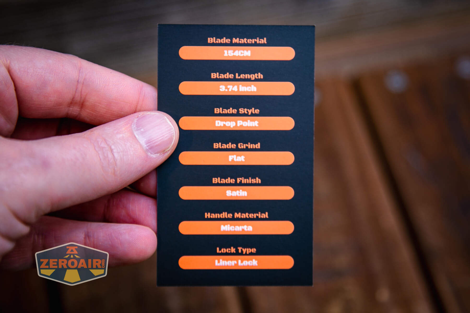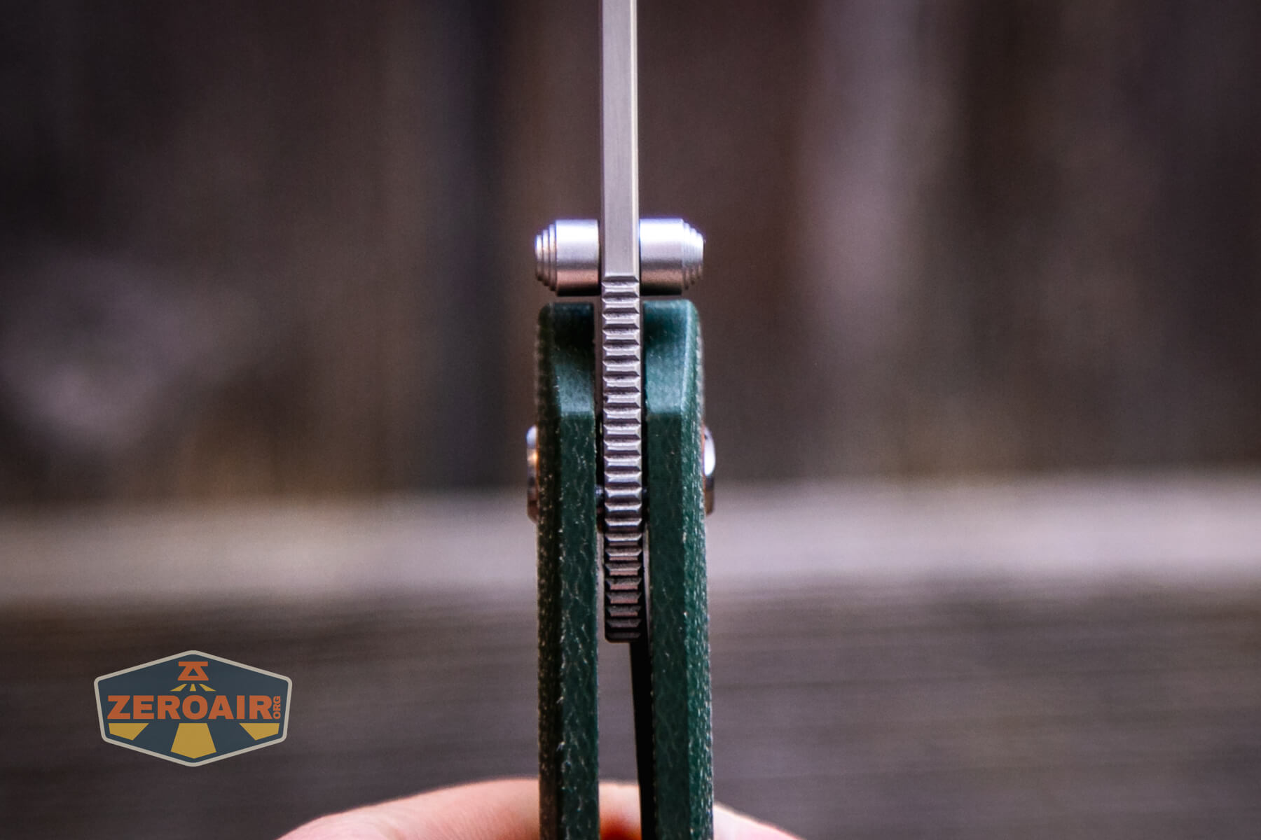The blade shape is “full flat grind” and one of my favorites. It’s prone to collecting fingerprints (or fingers, if you use the “top” flipper, as mentioned above.)