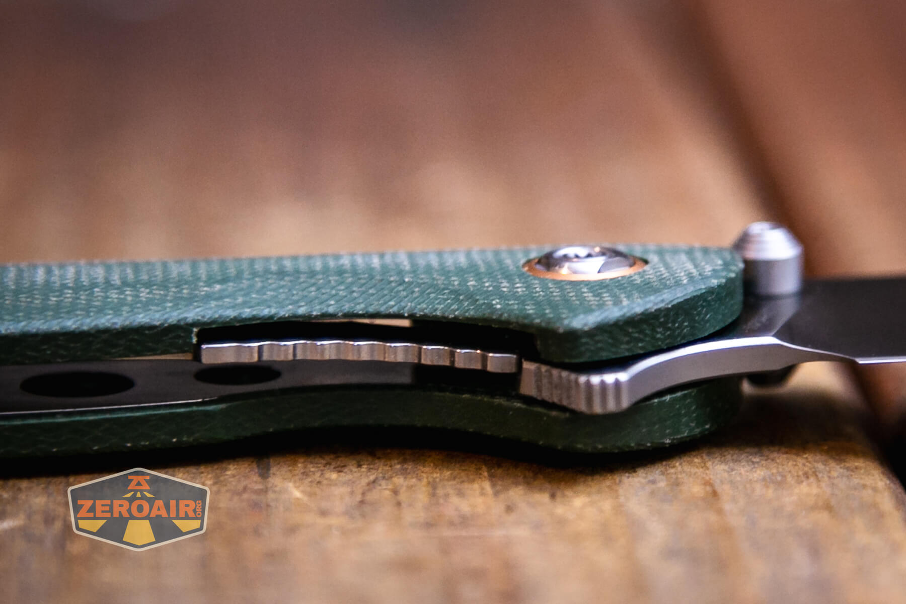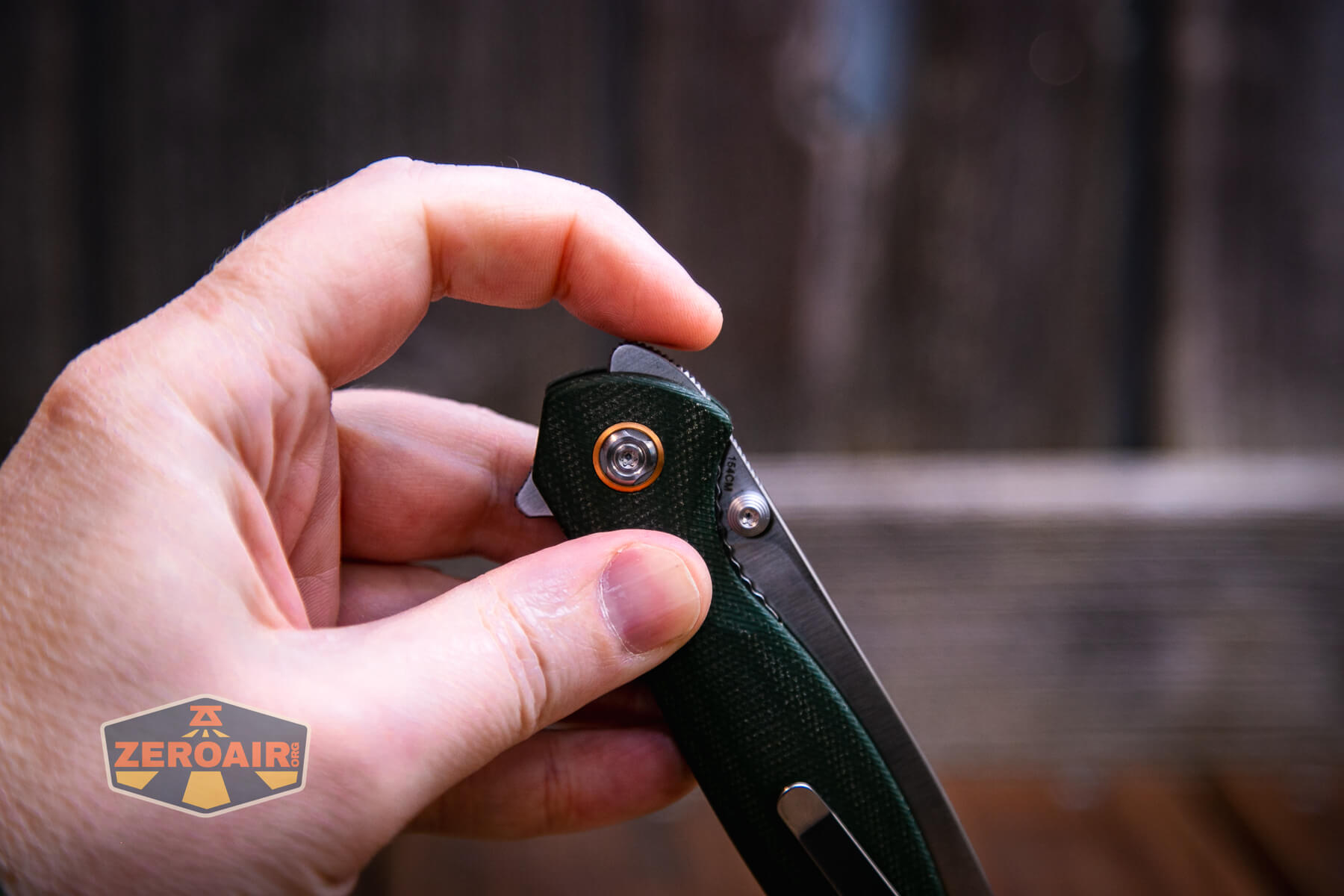 A thumbstud is used to open the Vosteed Labrador micarta knife. Vosteed made the Labrador to be ambidextrous; there’s a thumbstud on both sides of the blade. Or you can use one of the two flippers! Primarily, there’s this one below.
