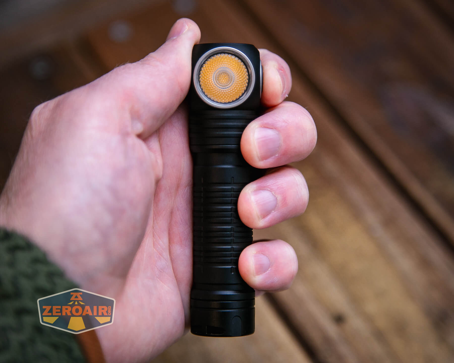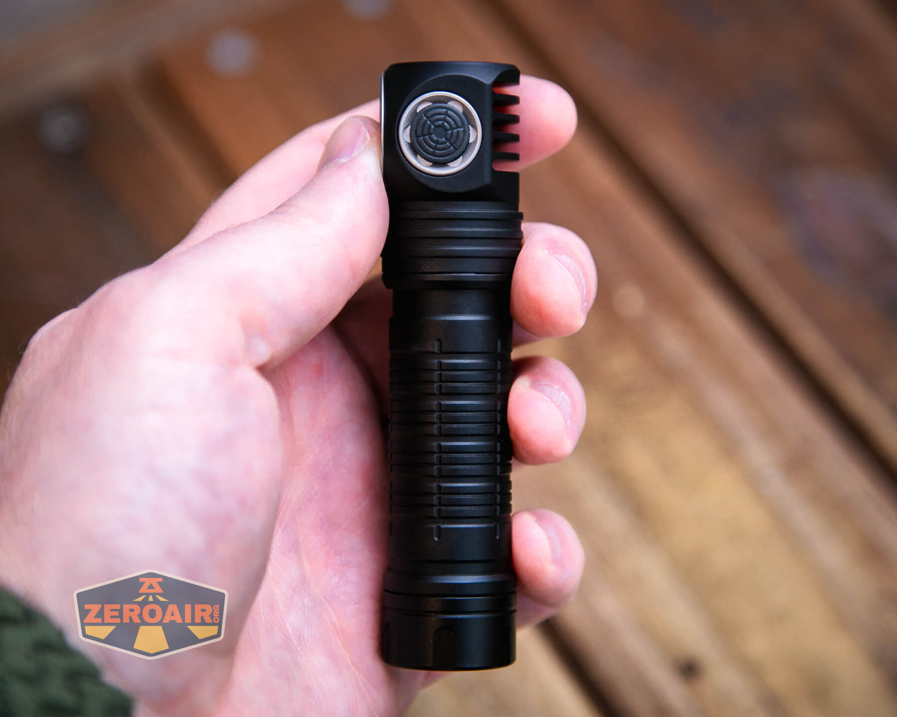 The Skilhunt H300 is operated by a single switch. It’s an indicating e-switch on the head. The switch has a silicone cover and is black but still translucent. It requires minimal force and has a positive, quiet actuation. If you’ve had other Skilhunt headlamps, you’ll be very comfortable with this switch.