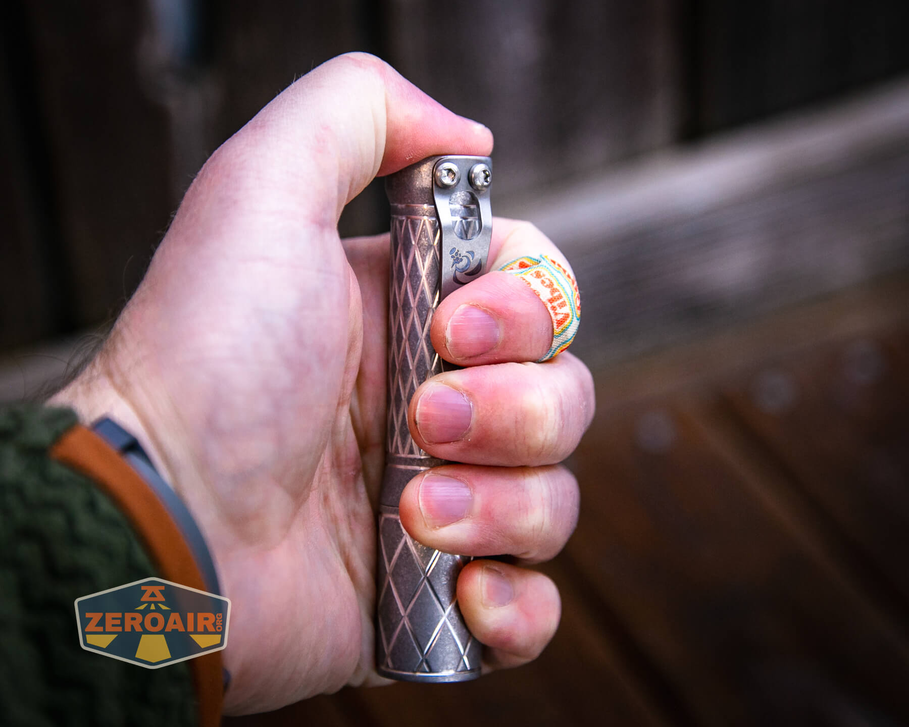 love the 14500-size lights. It’s a size that because of how slender it is, sort of disappears in a pocket. These make great backup lights, but can be powerful enough to also be primary lights. Aside from all that, this Diamond Slim specifically is absolutely fantastic. I love the tumbled finish. The tumbled parts are aging very nicely, too. Aluminum doesn’t usually get what anyone would consider a patina, but it does age, and this type ages perfectly. The shiny grooves really set it off, too. Output is great and I’m a very huge fan of the driver used (but more on that below). All in all, the Laulima Diamond Slim is a fantastic flashlight, if slightly on the higher side on price.