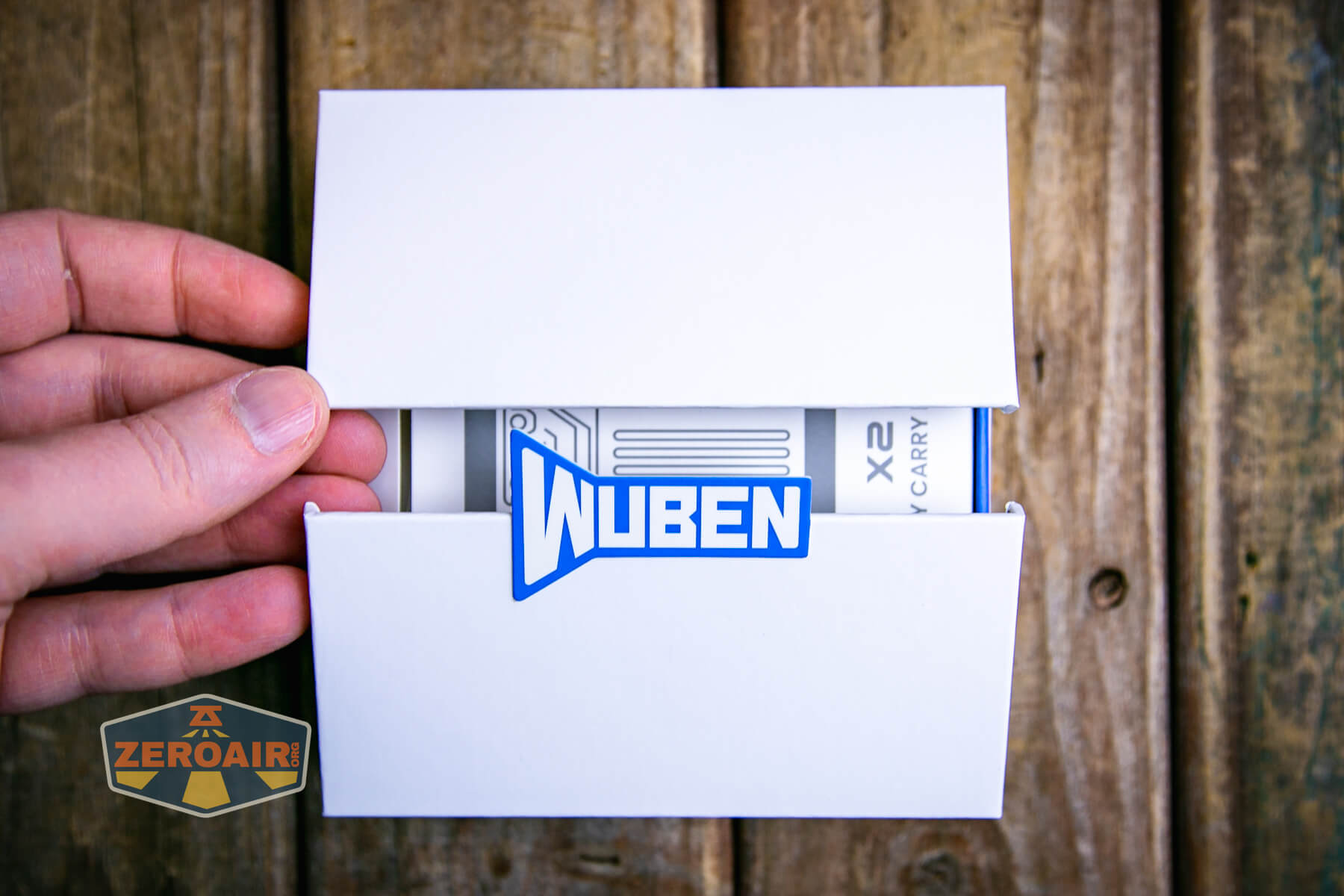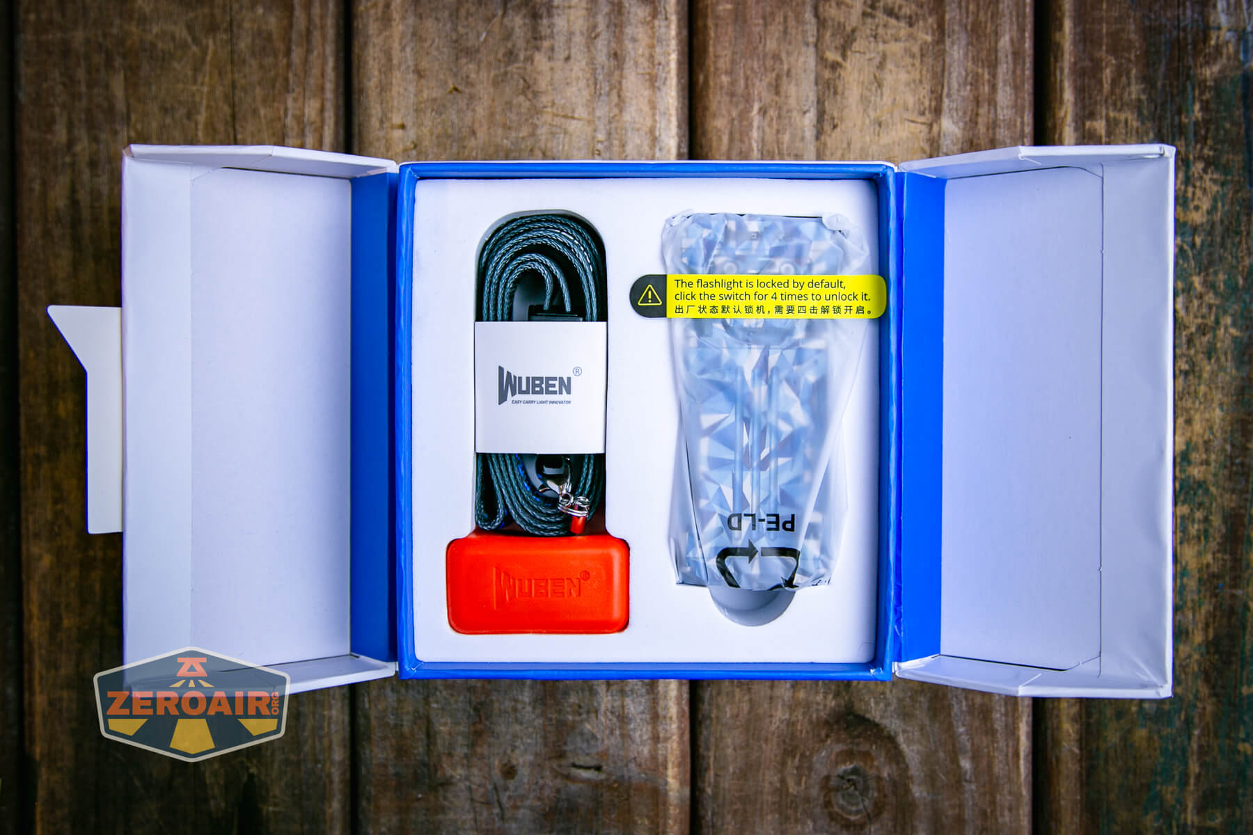 Wuben X-2 Owl Titanium flashlight package folded open