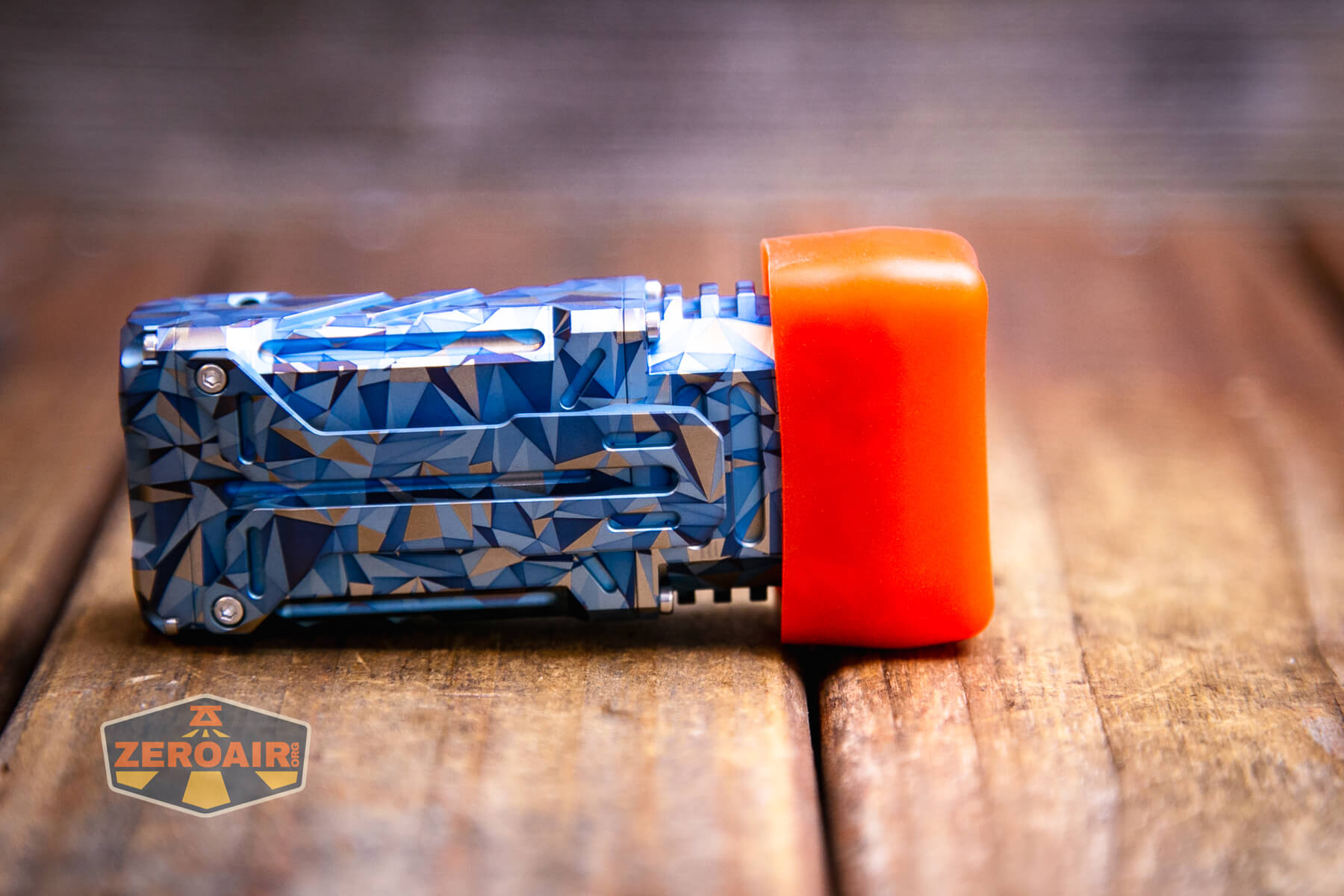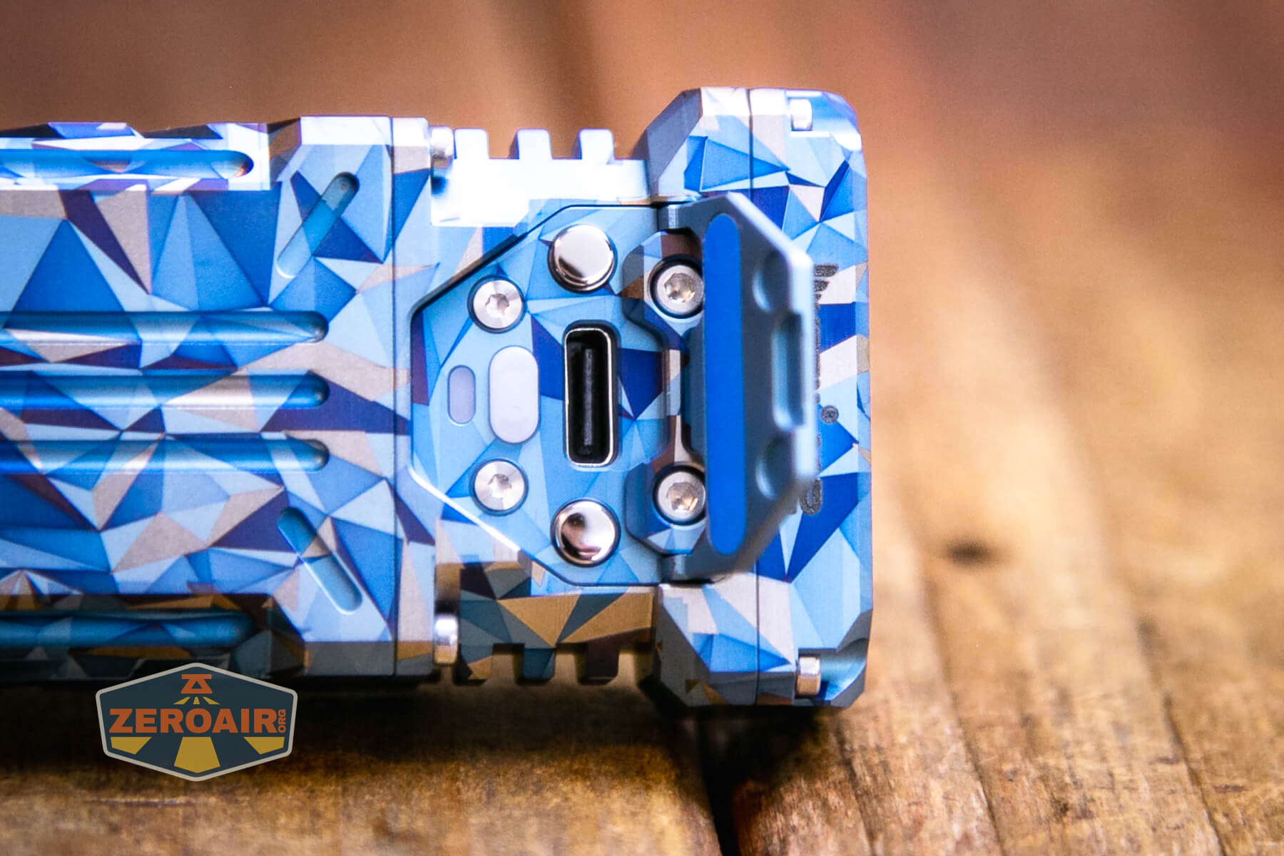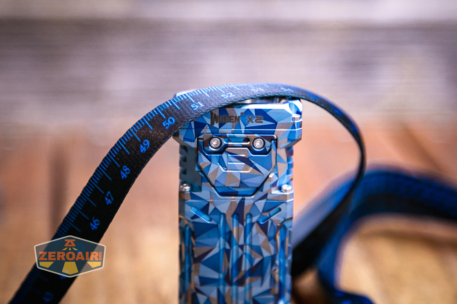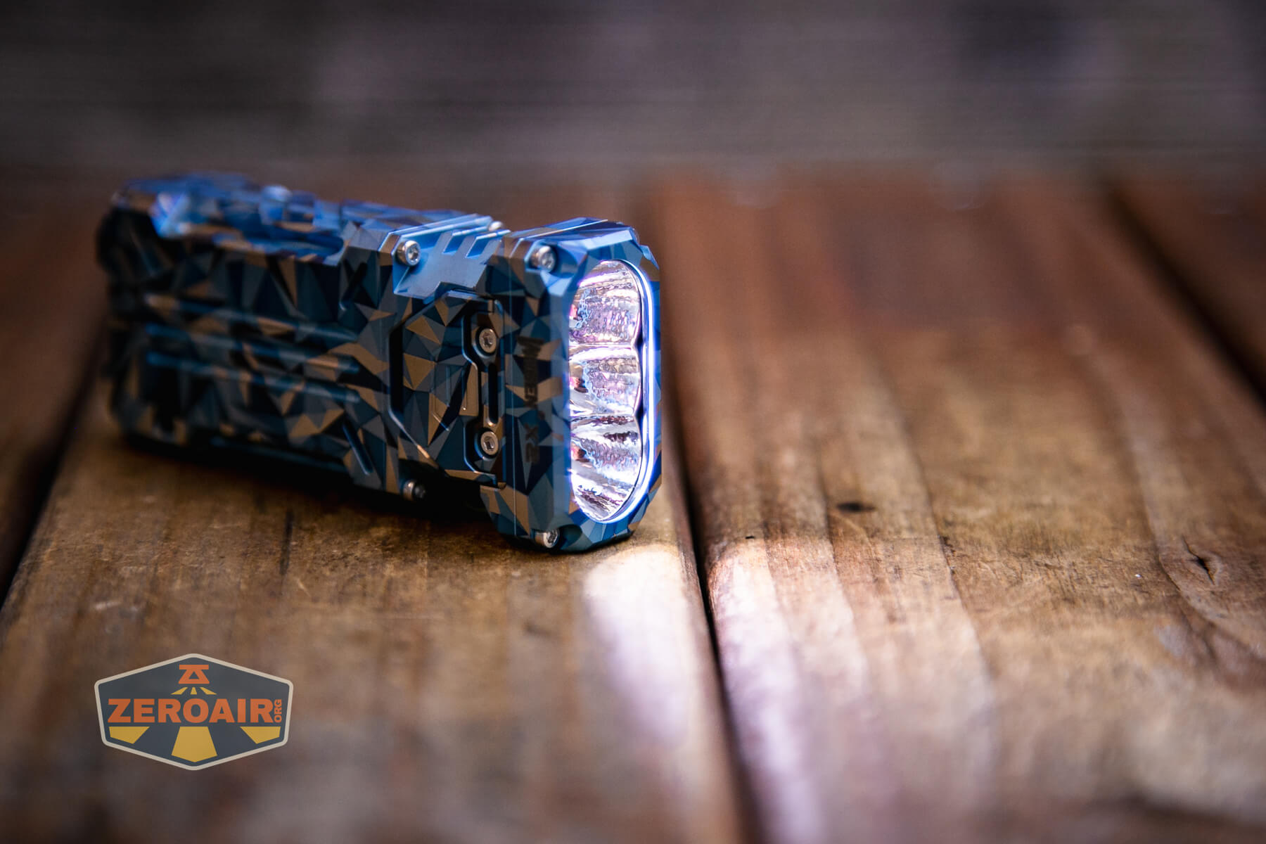 A blue and grey geometric-patterned flashlight lies on its side on a wooden surface, with a ZeroAir logo in the bottom left corner of the image.