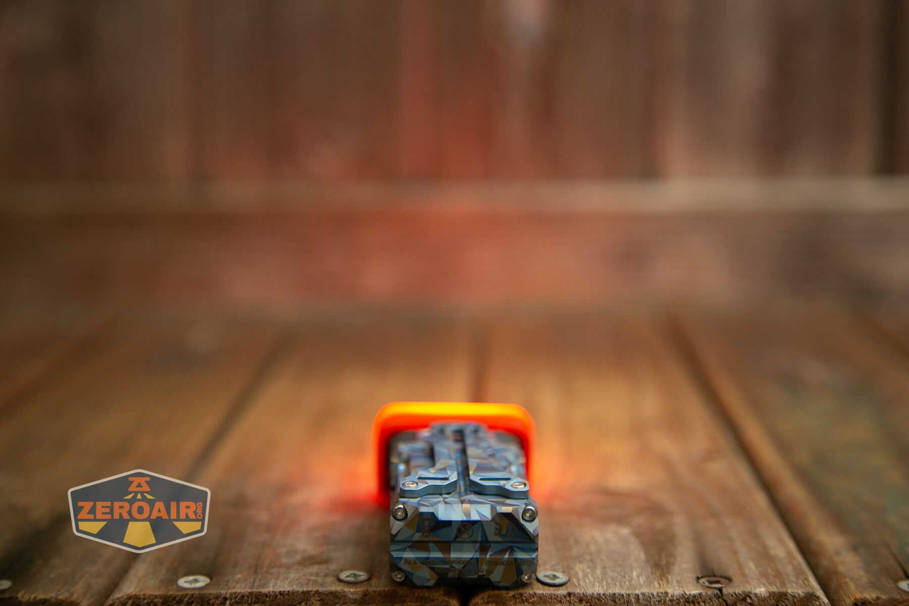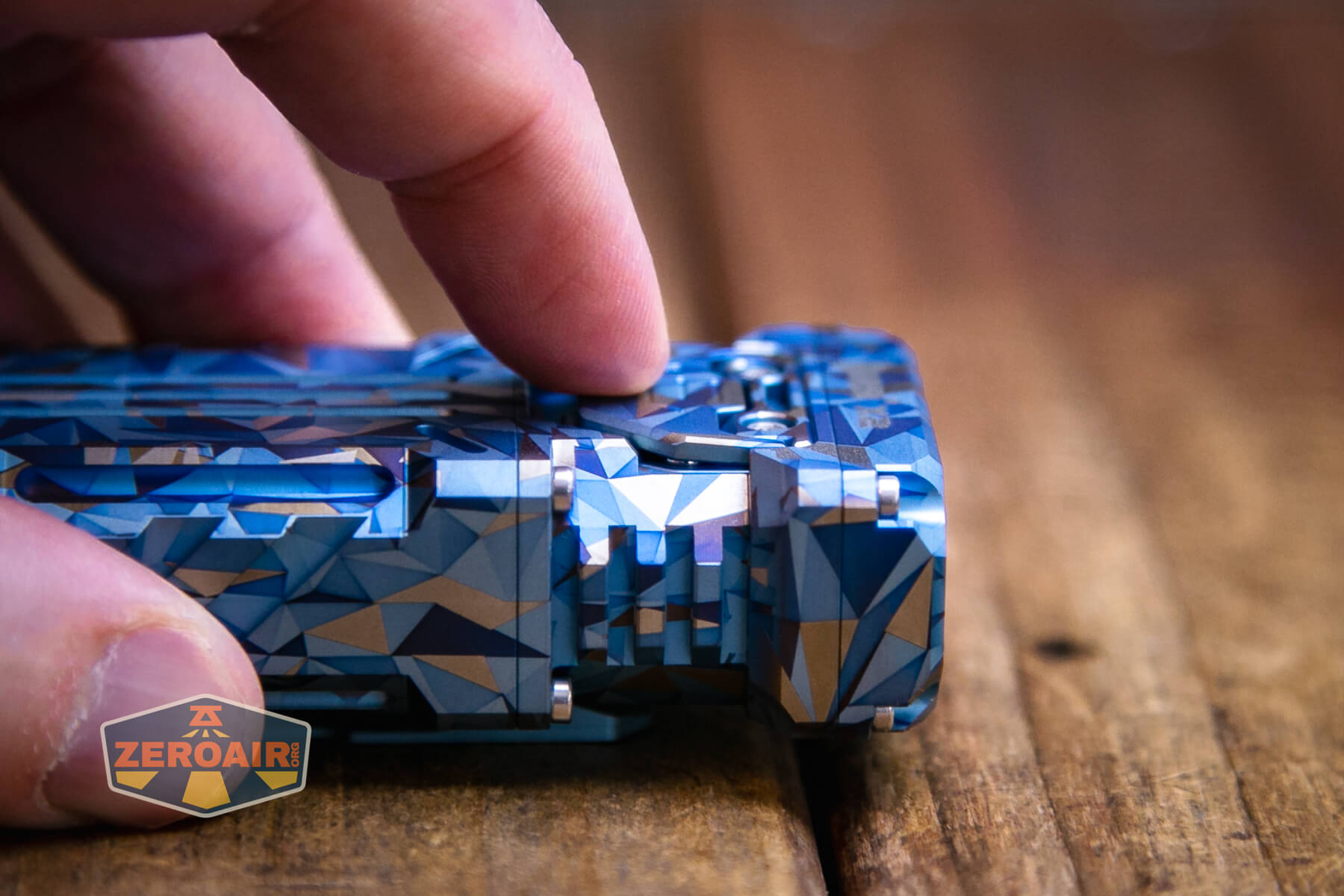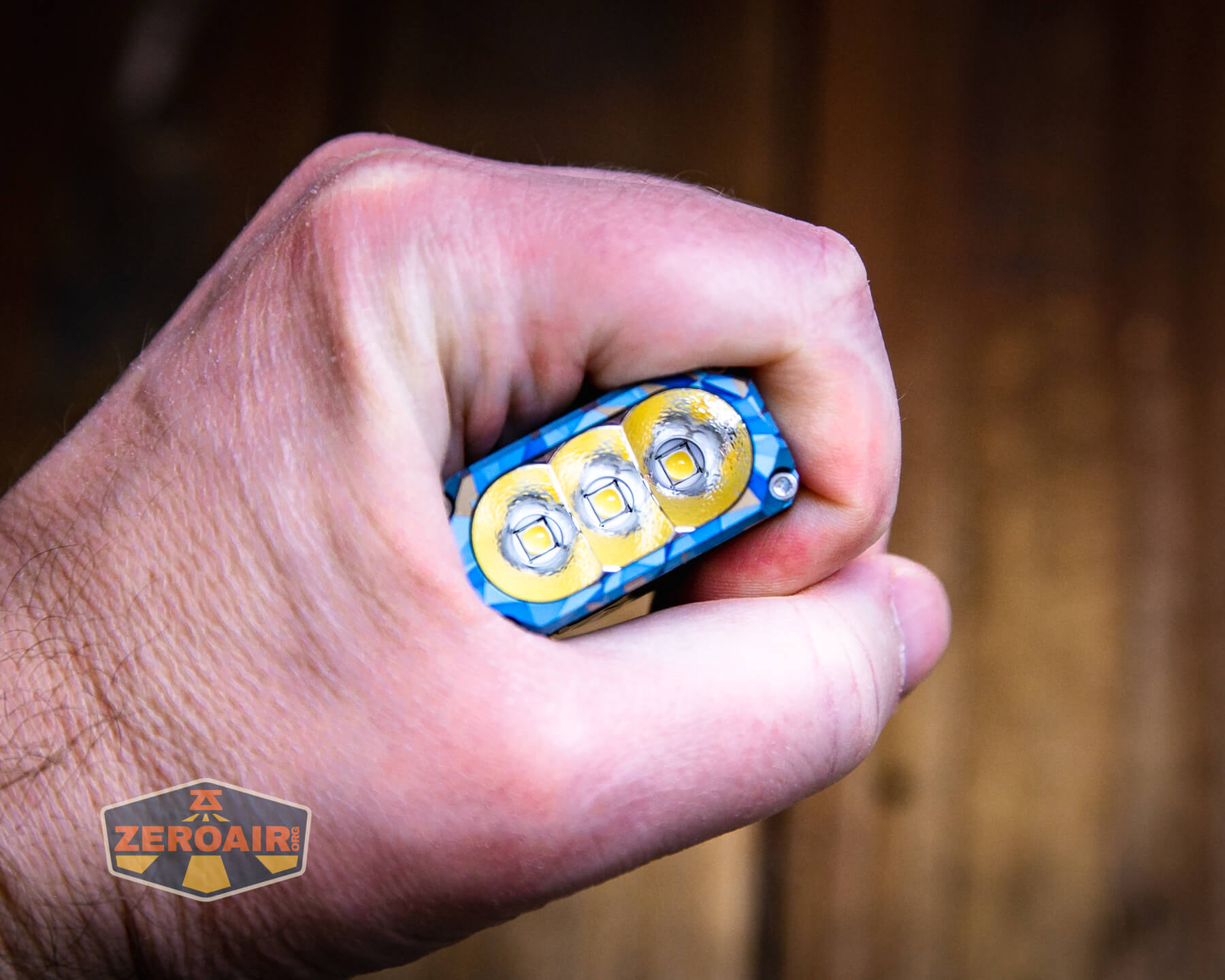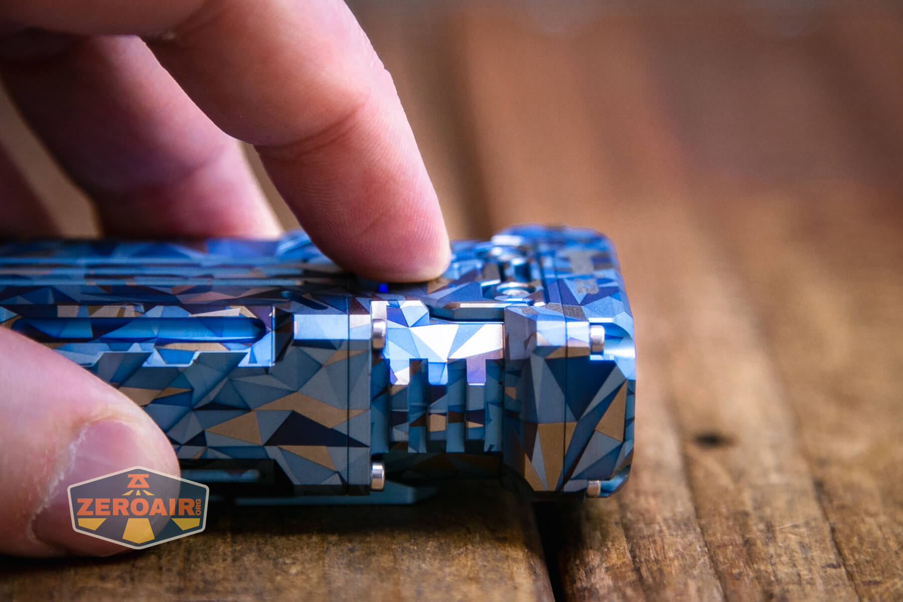 A blue and grey geometric-patterned flashlight lies on its side on a wooden surface, with a ZeroAir logo in the bottom left corner of the image.
