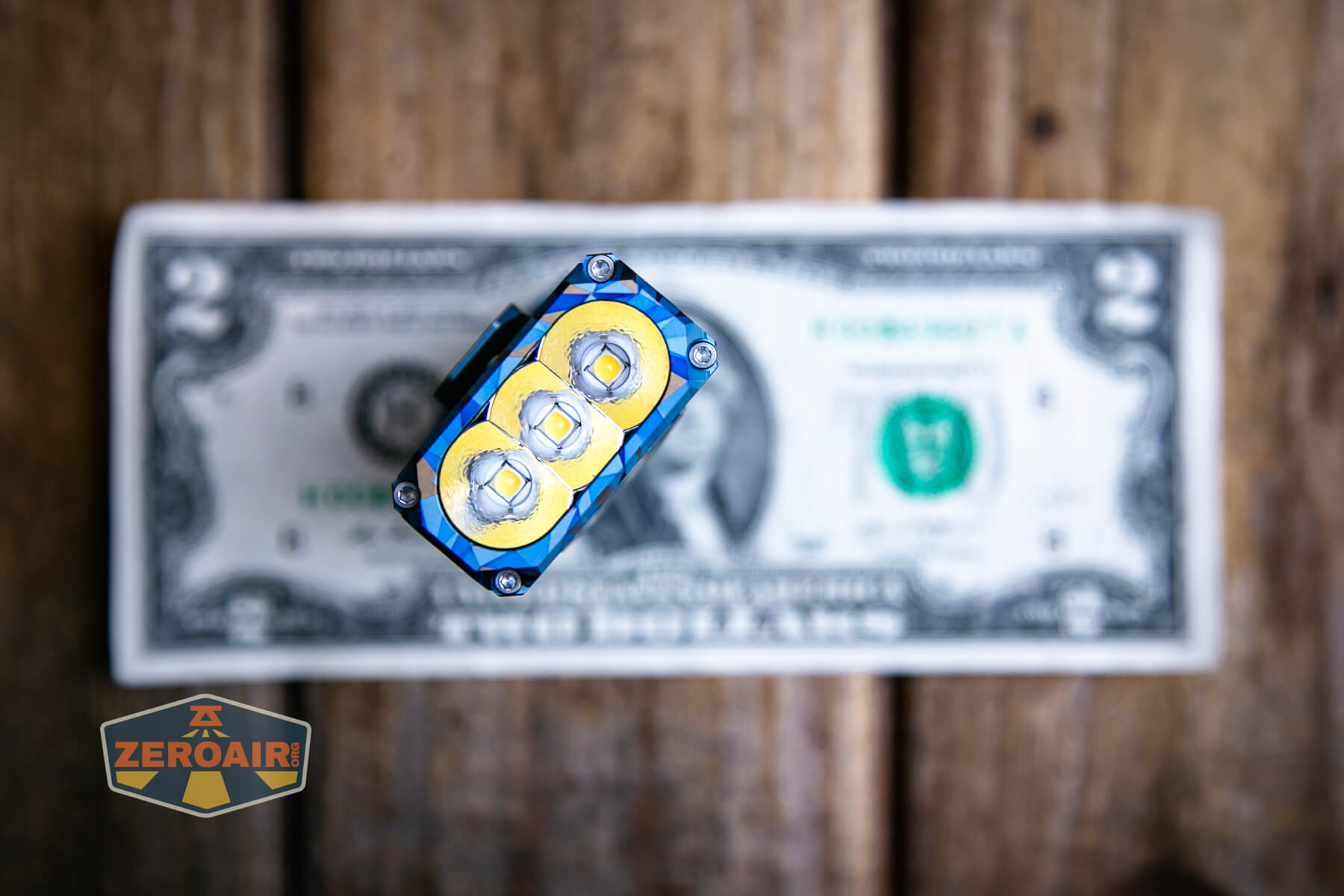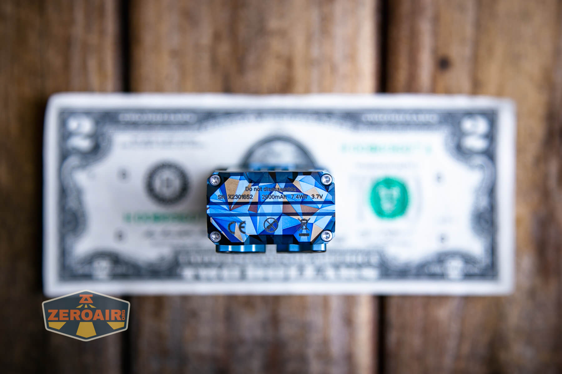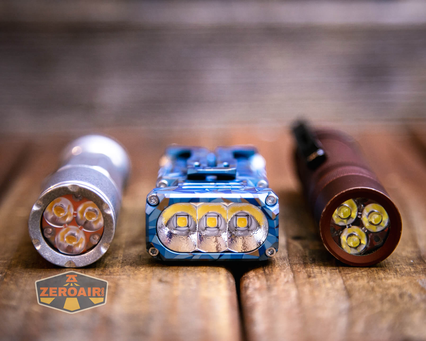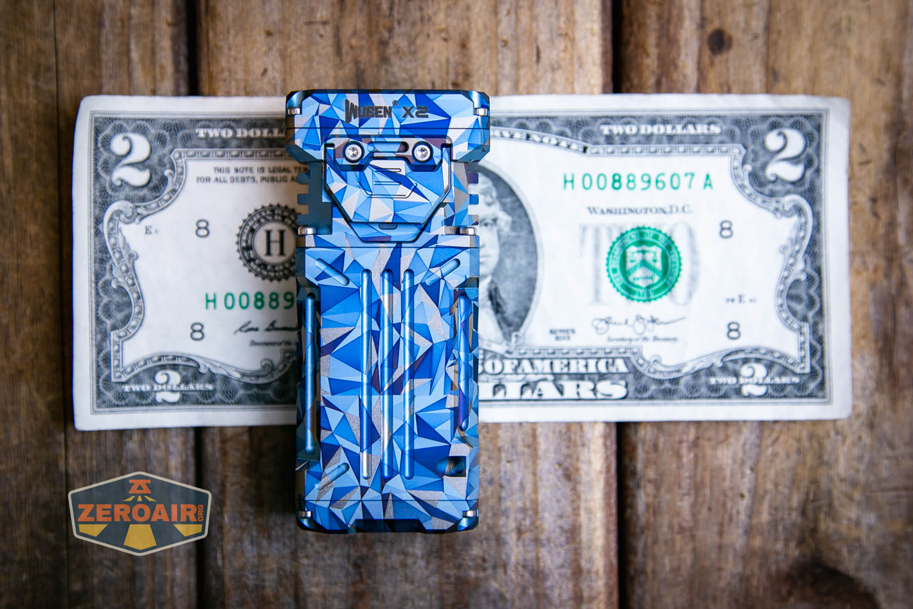 A blue and grey geometric-patterned flashlight lies on its side on a wooden surface, with a ZeroAir logo in the bottom left corner of the image.