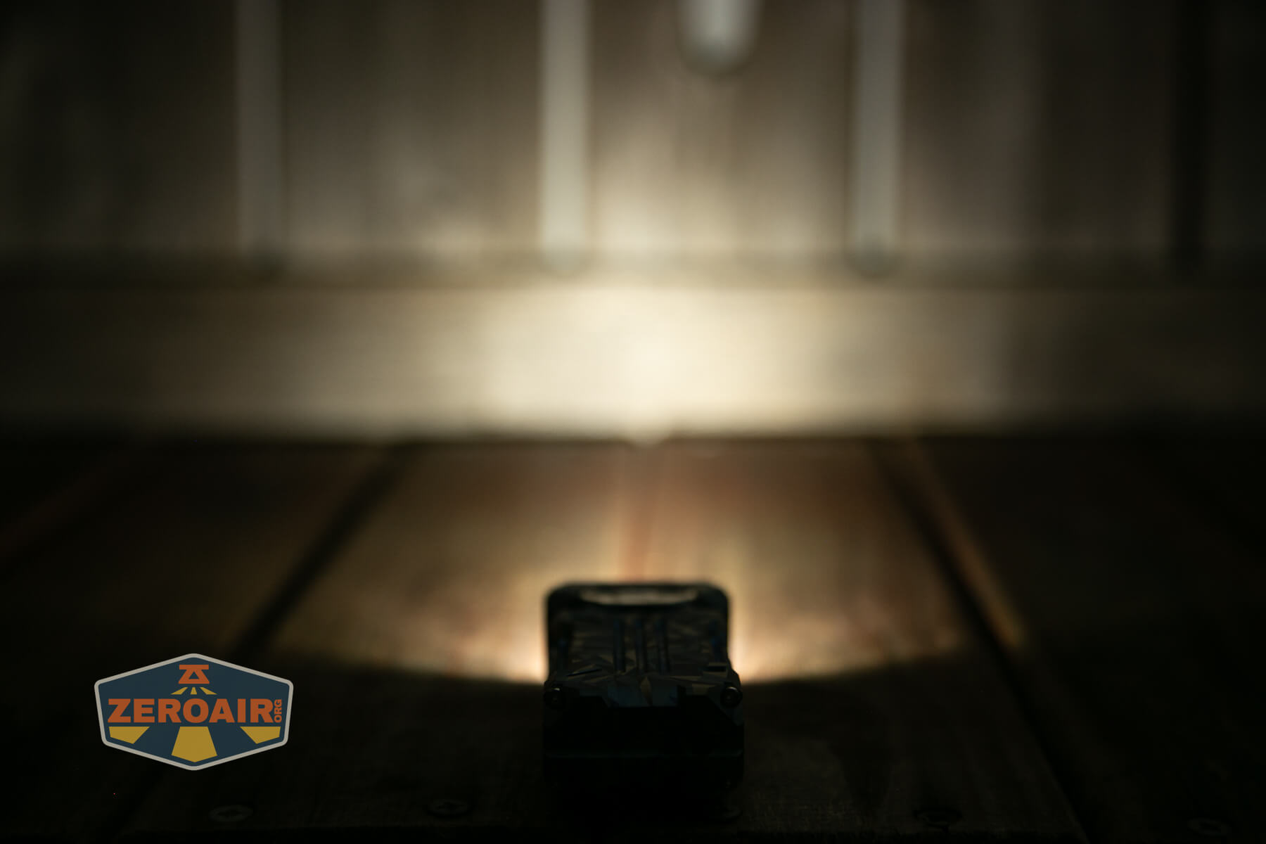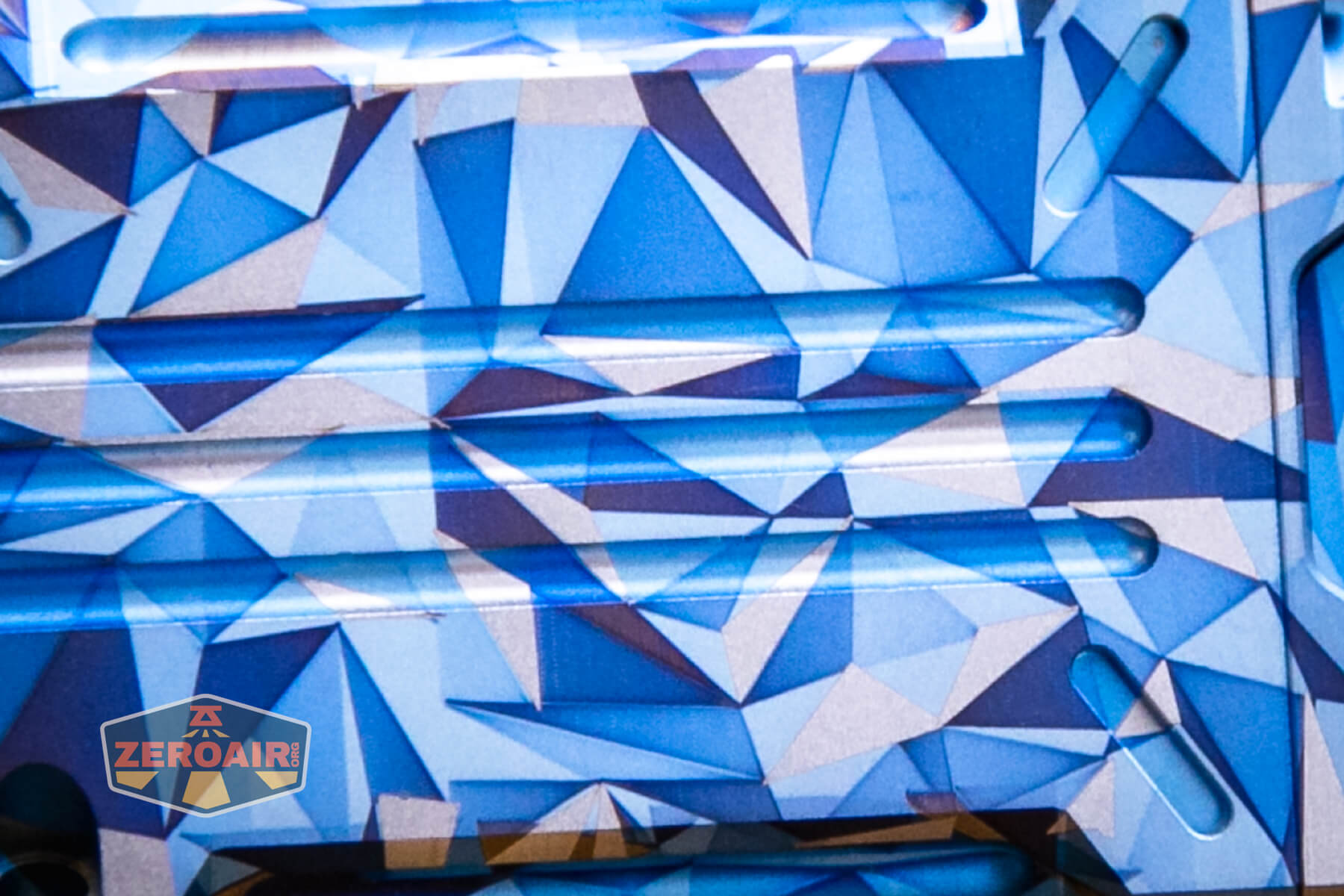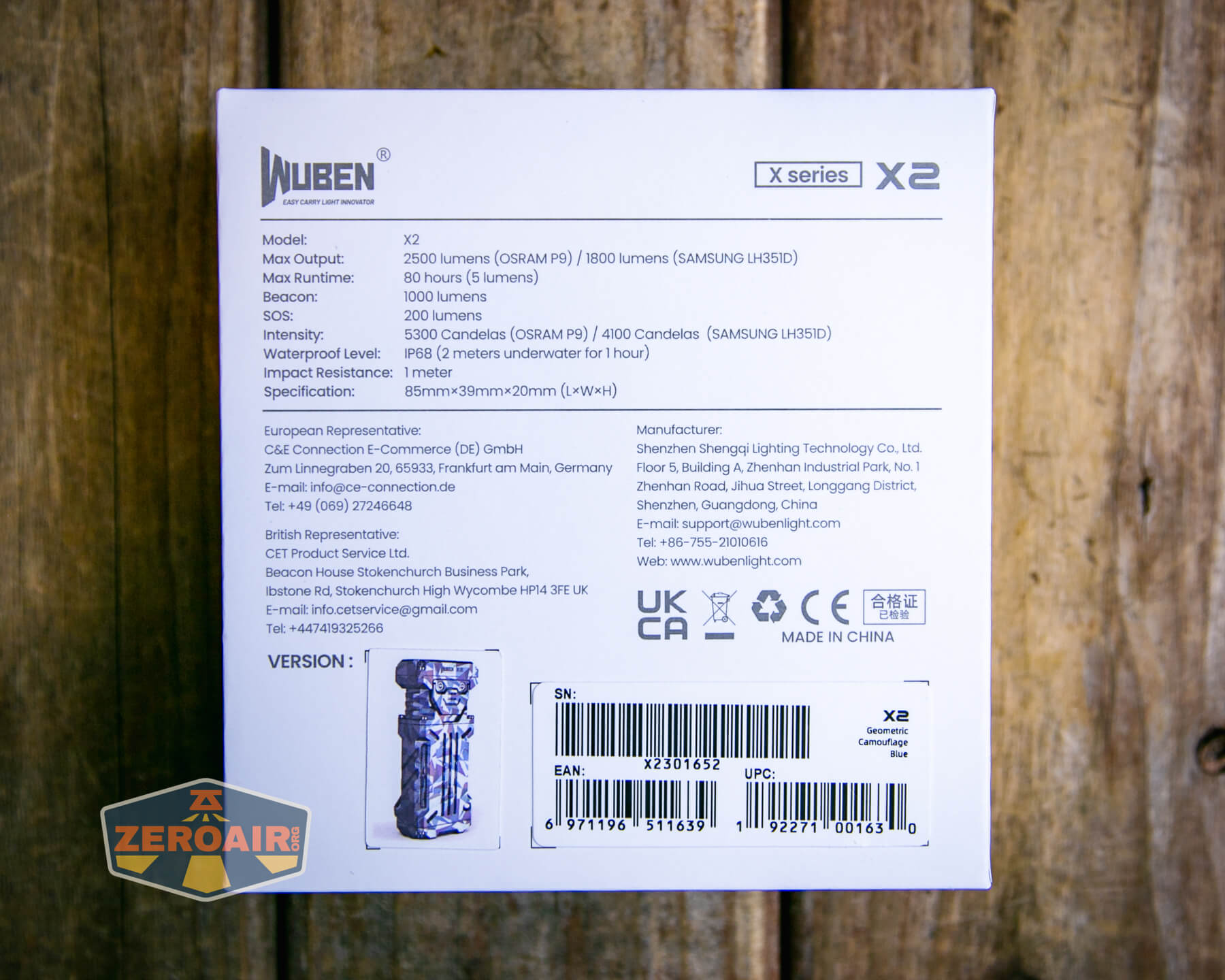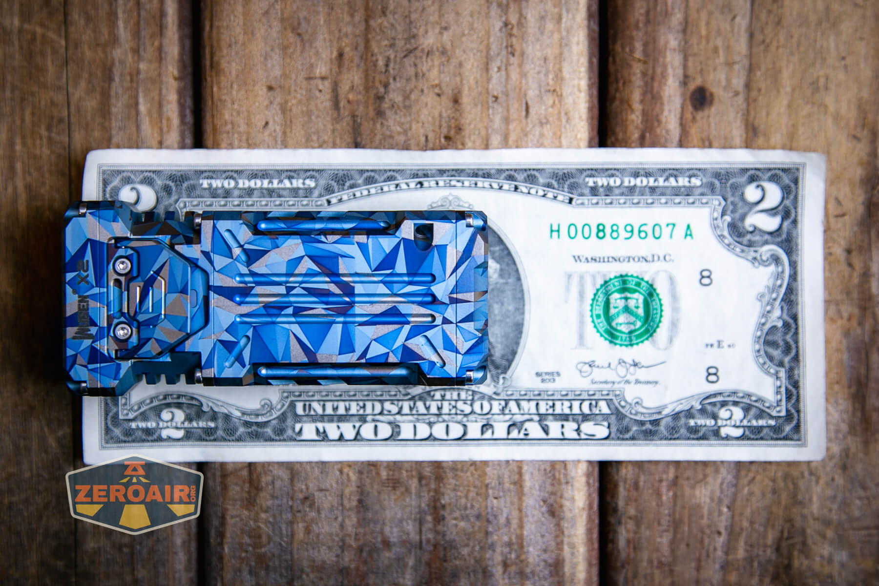 A blue and grey geometric-patterned flashlight lies on its side on a wooden surface, with a ZeroAir logo in the bottom left corner of the image.