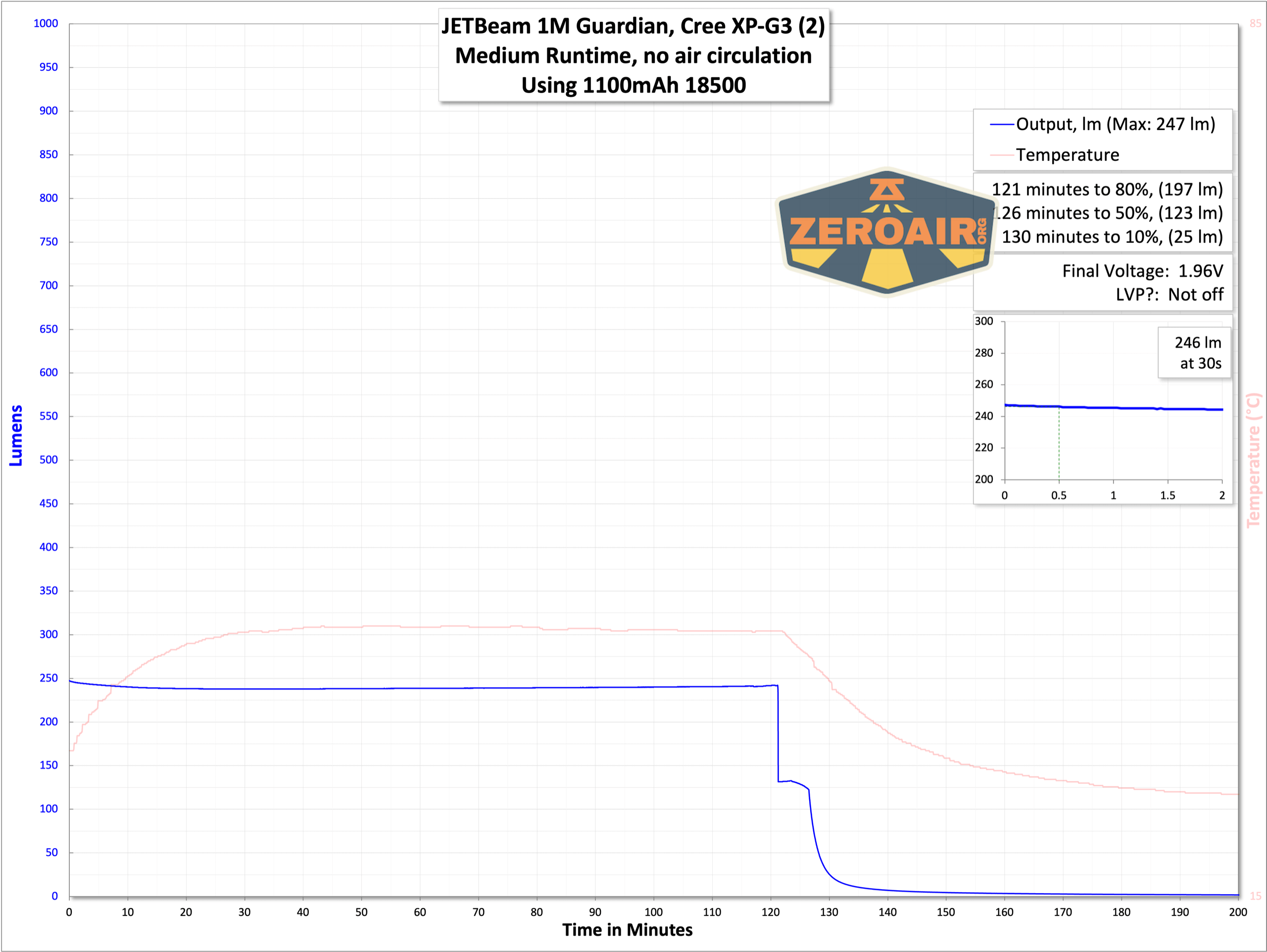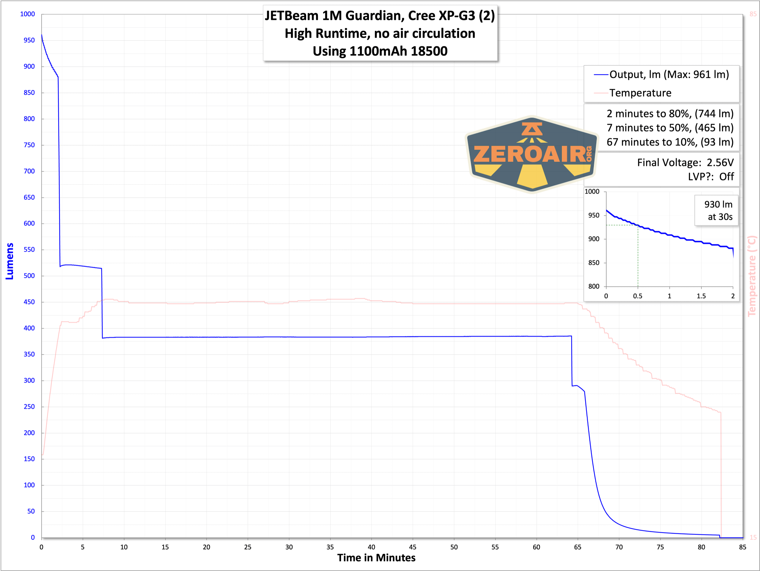 Here are runtimes for the top two modes, but for 18650 and 18500 both. Output for both is the same since a 18500 cell is generally just as capable as a 18650 cell. One thing that doesn’t please me all that much is that science (or technology, or whatever) hasn’t really focused on 18500 cells. As such, what we have is a fairly low energy-to-volume cell. For example, the one I tested with is around 1100mAh. A much smaller 18350 cell (15mm smaller, to be exact) is available in much higher capacities – at least up to 1400mAh. In very rough math, a 1400mAh 18350 offers 40mAh per mm, while this 1100mAh 18500 offers just 22mAh per mm. At comparable energy density, a high capacity 18500 might offer in the 2000mAh range. And at that capacity, it’d be worthwhile to consider, because you’d have better runtimes. According to a quick search, there are 2300mAh 18500 cells, so as long as you’re using one of those, this 18500 light makes perfect sense!