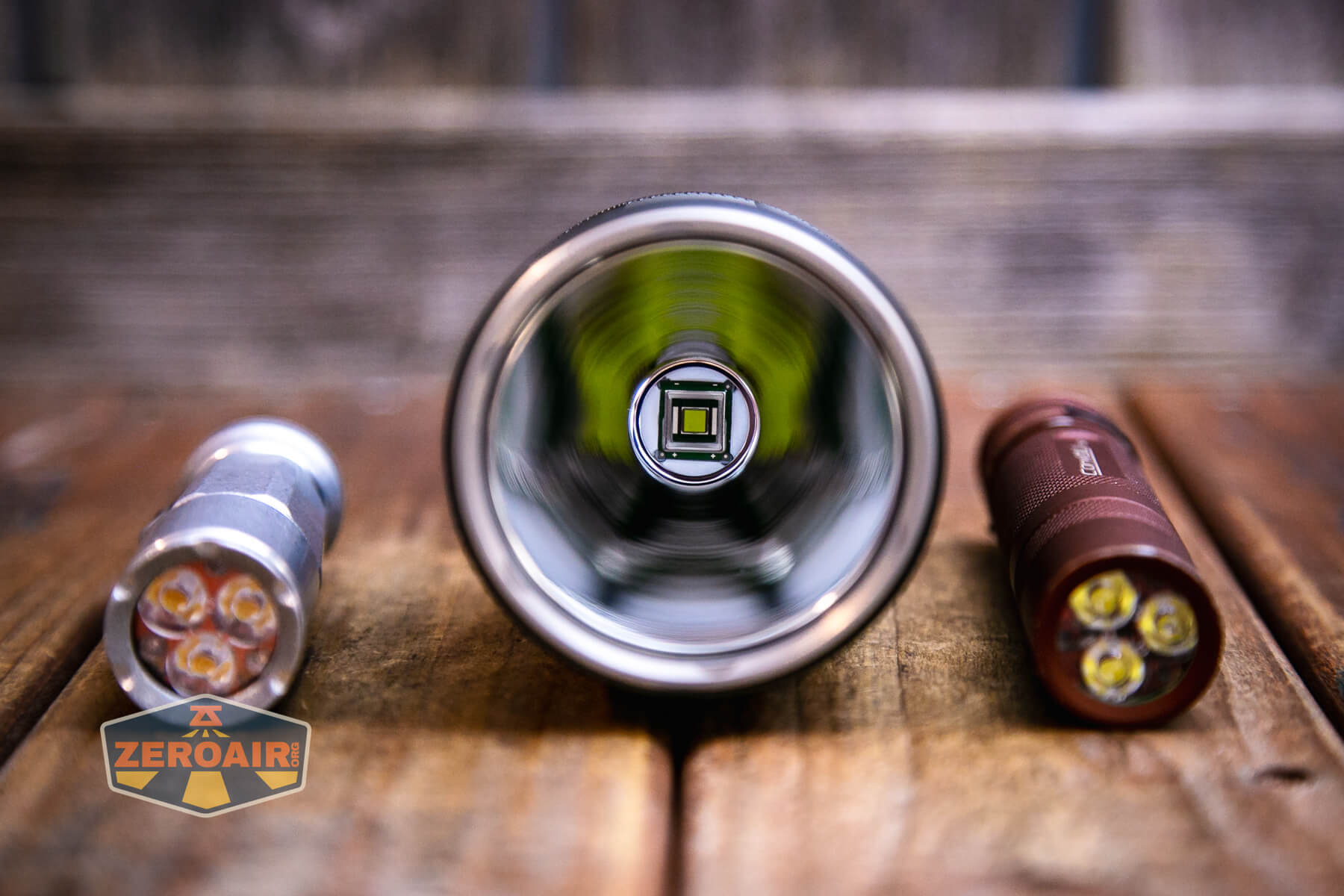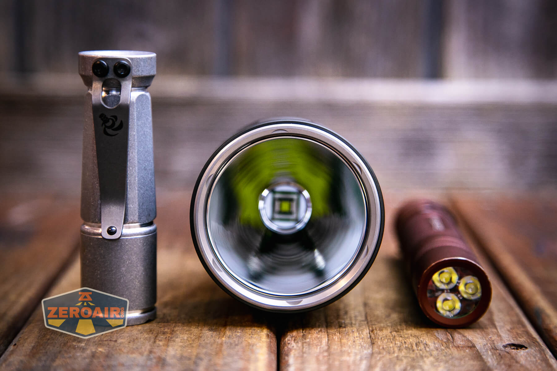 Also above on the left is a new feature light!! Laulima Metal Craft sent this Todai in tumbled aluminum for some size comparison photos like the ones above. Laulima has a bunch of incredible items. I’ve tested one (the Laulima Metal Craft Hoku) (the official site for Hoku is here) that was a Friend Fund Friday review. I was impressed enough by that Hoku that I bought a Laulima Metal Craft Diamond Slim (also in tumbled aluminum) (review is upcoming!) These lights by Laulima have impeccable build quality and not only that, they’re quite configurable. There are some (great, actually) default configurations, but Joshua Dawson (of Laulima Metal Craft) is open to ideas and emitter options and the like. I haven’t reviewed this Todai, but I have to say, it feels absolutely fantastic and I love it thus far. (Notably, I love how warm and eggy those emitters look through the TIR.)