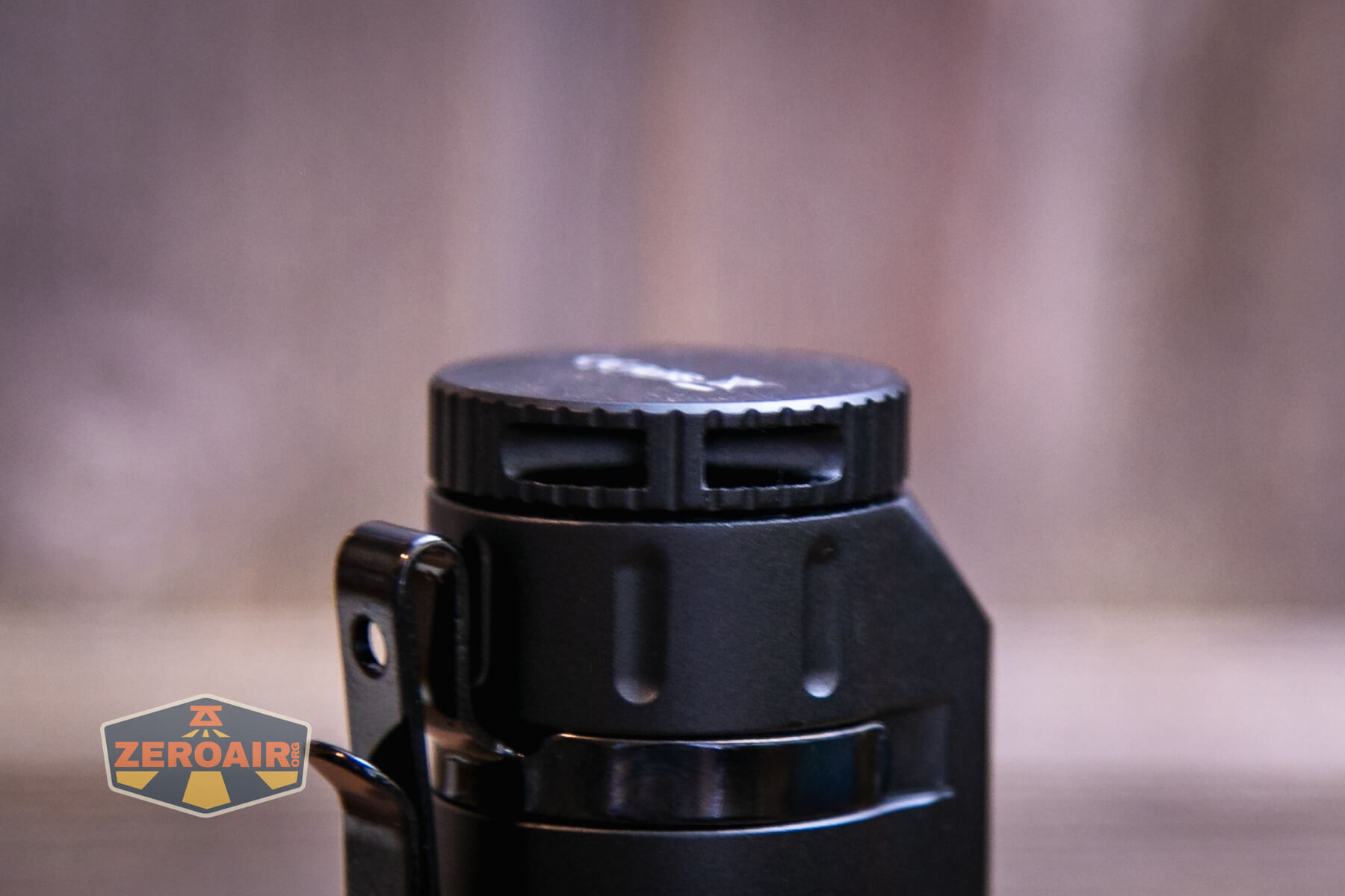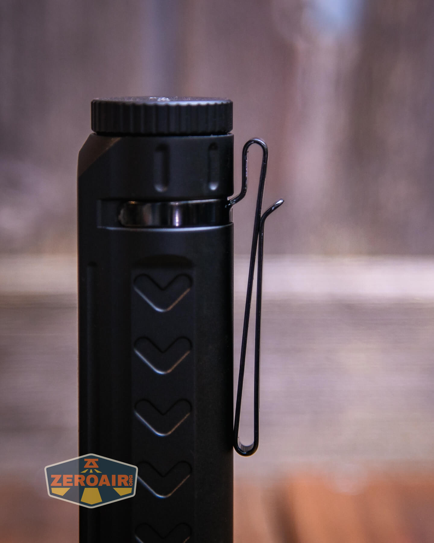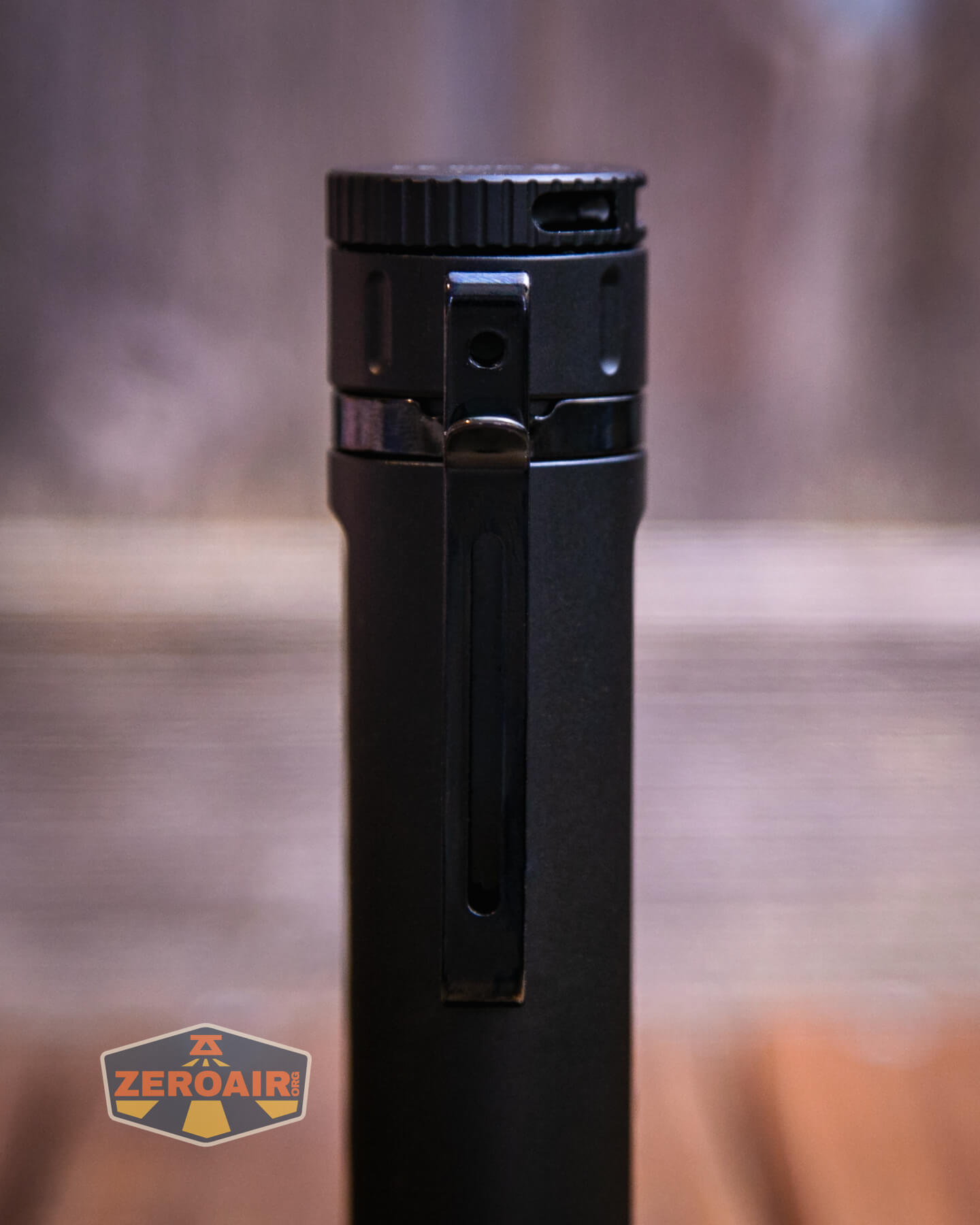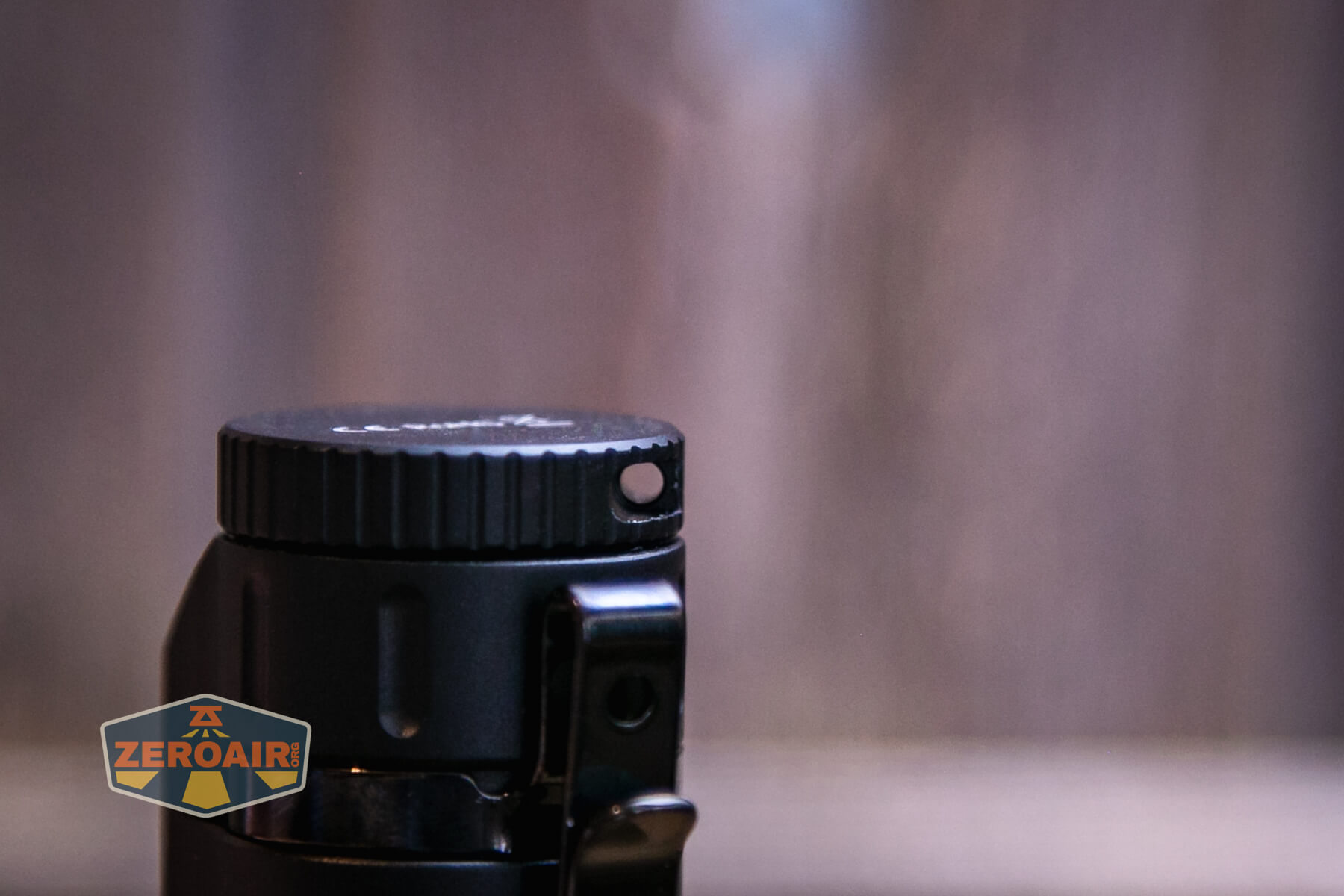Also included is a lanyard, which attaches through this hole in the tailcap. It could also attach through the hole in the shoulder of the pocket clip. Since it’s a friction-fit pocket clip, that’s a much less secure attachment, though.