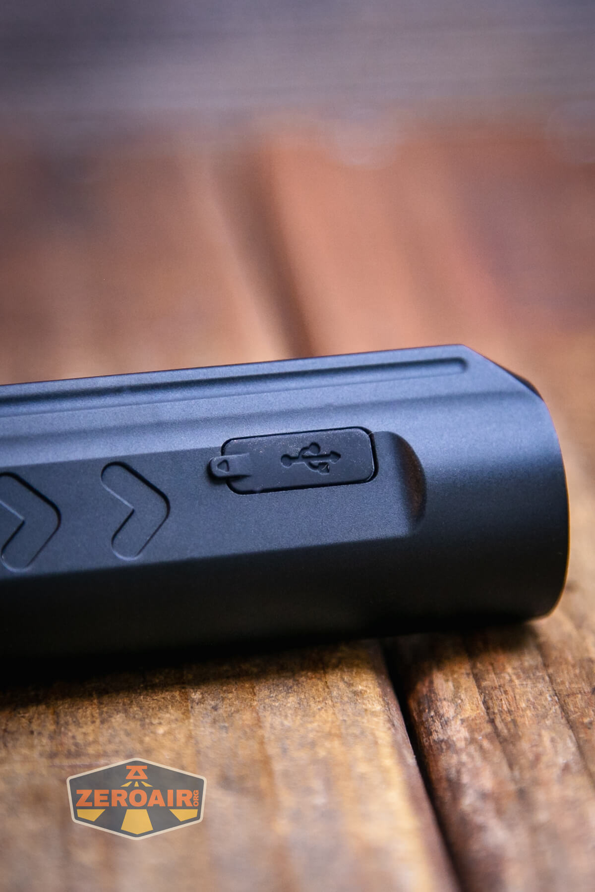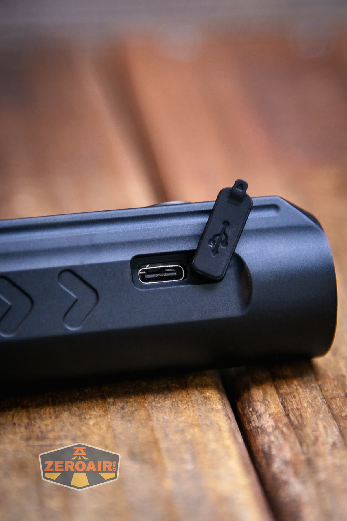 The Sofirn IF23 Mini RGB flashlight sports USB-C charging and the charging port is on the side. It’s covered with a press-in rubber cover.