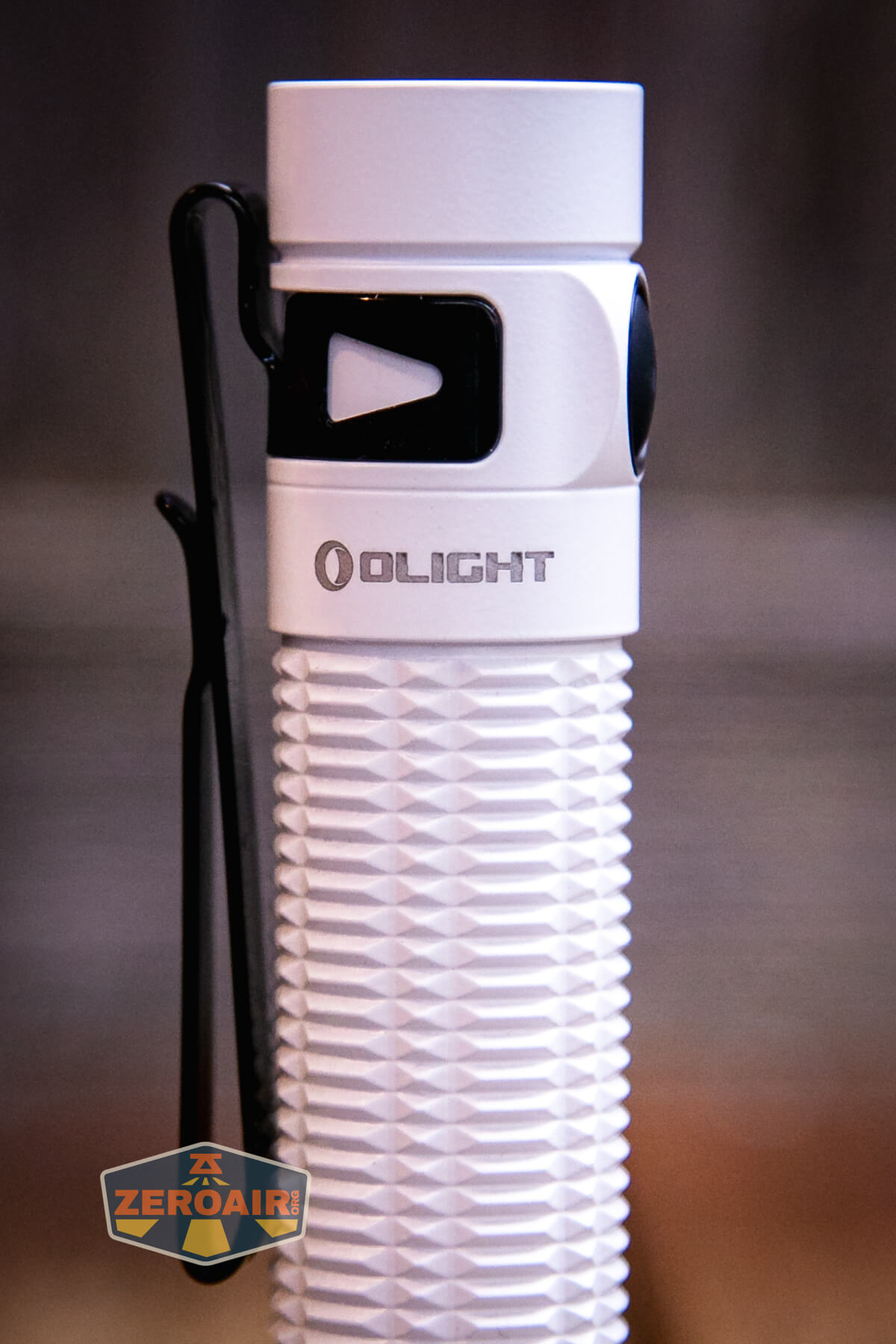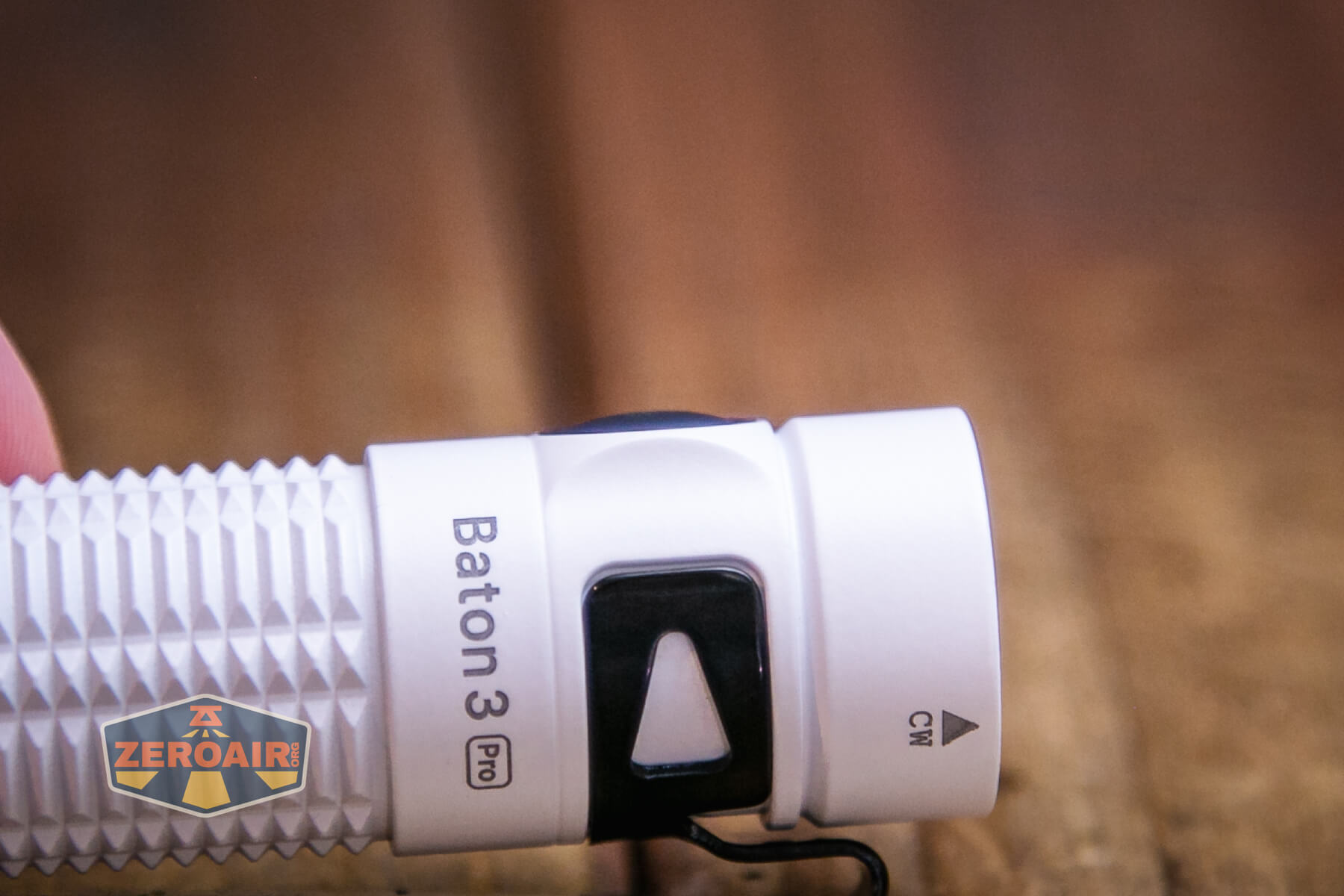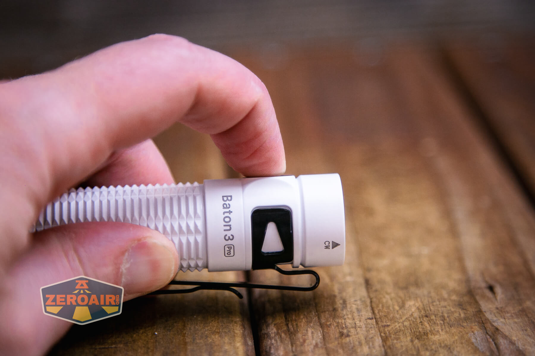 The Olight Baton 3 Pro rechargeable flashlight has an e-switch on the head end of the side of the body. The switch cover has a bit of texture and is proud enough that it’s easy to find. It’s also not so proud or soft that it will easily activate accidentally.