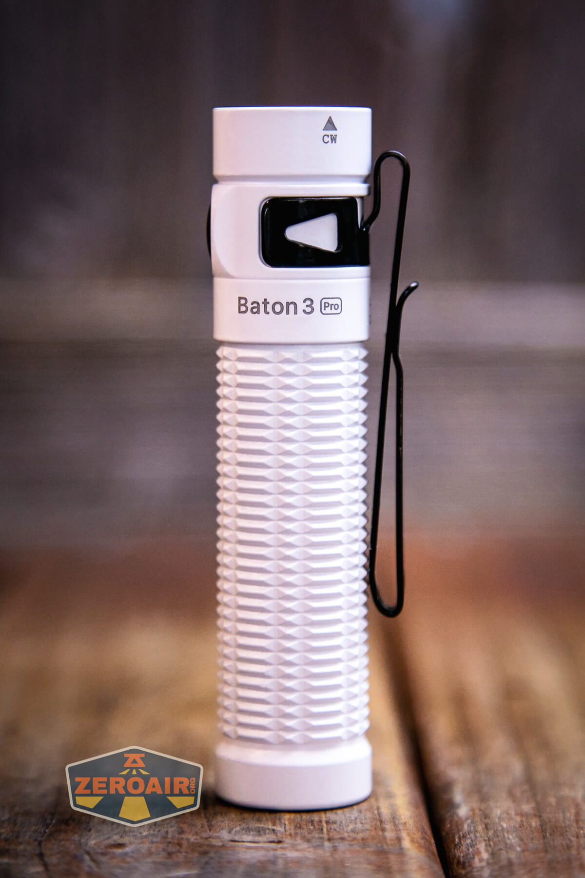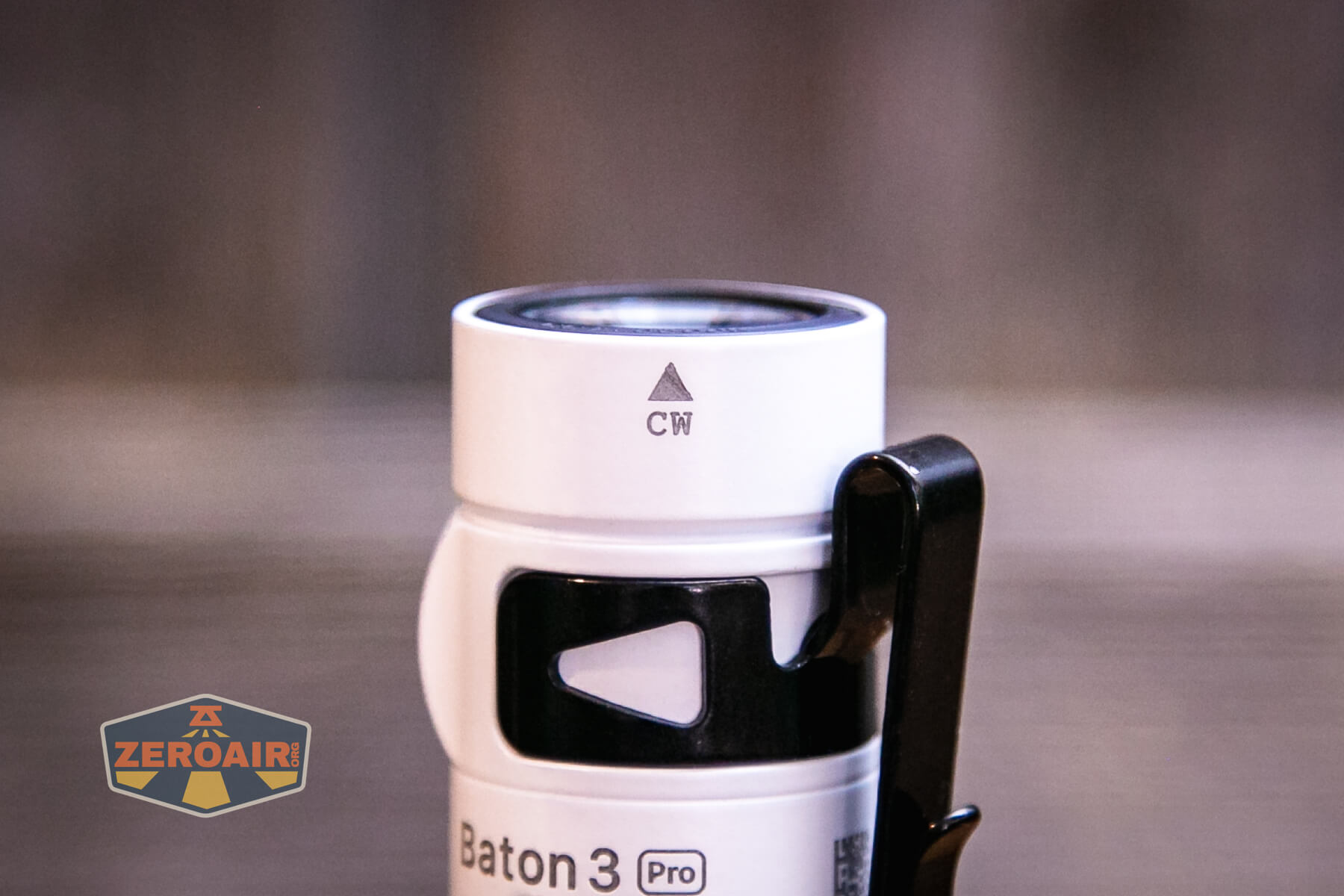 My white copy of the Olight Baton 3 Pro rechargeable flashlight is labeled as CW for “Cool White.”