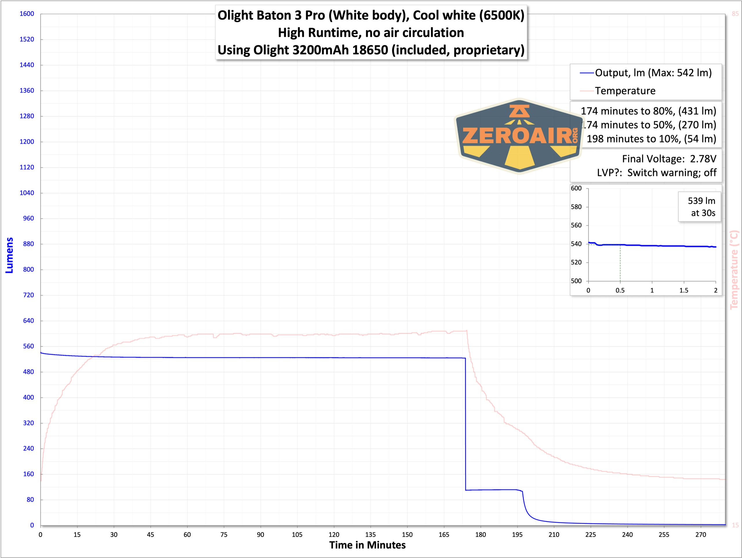 I say “doesn’t necessarily” seem to shut off but it’s very warning-ey. The light steps down to such a low output that you can’t not notice. If the light is unattended, this could be a problem, but if you’re using the light, you’ll certainly notice the low voltage.