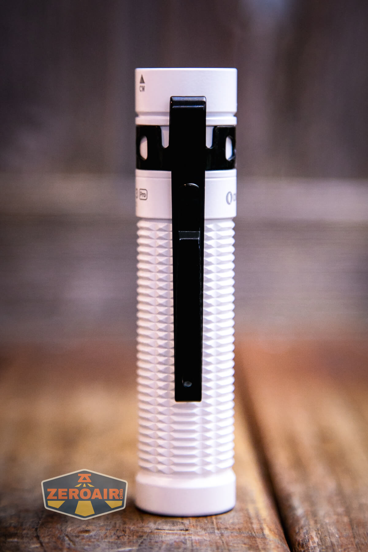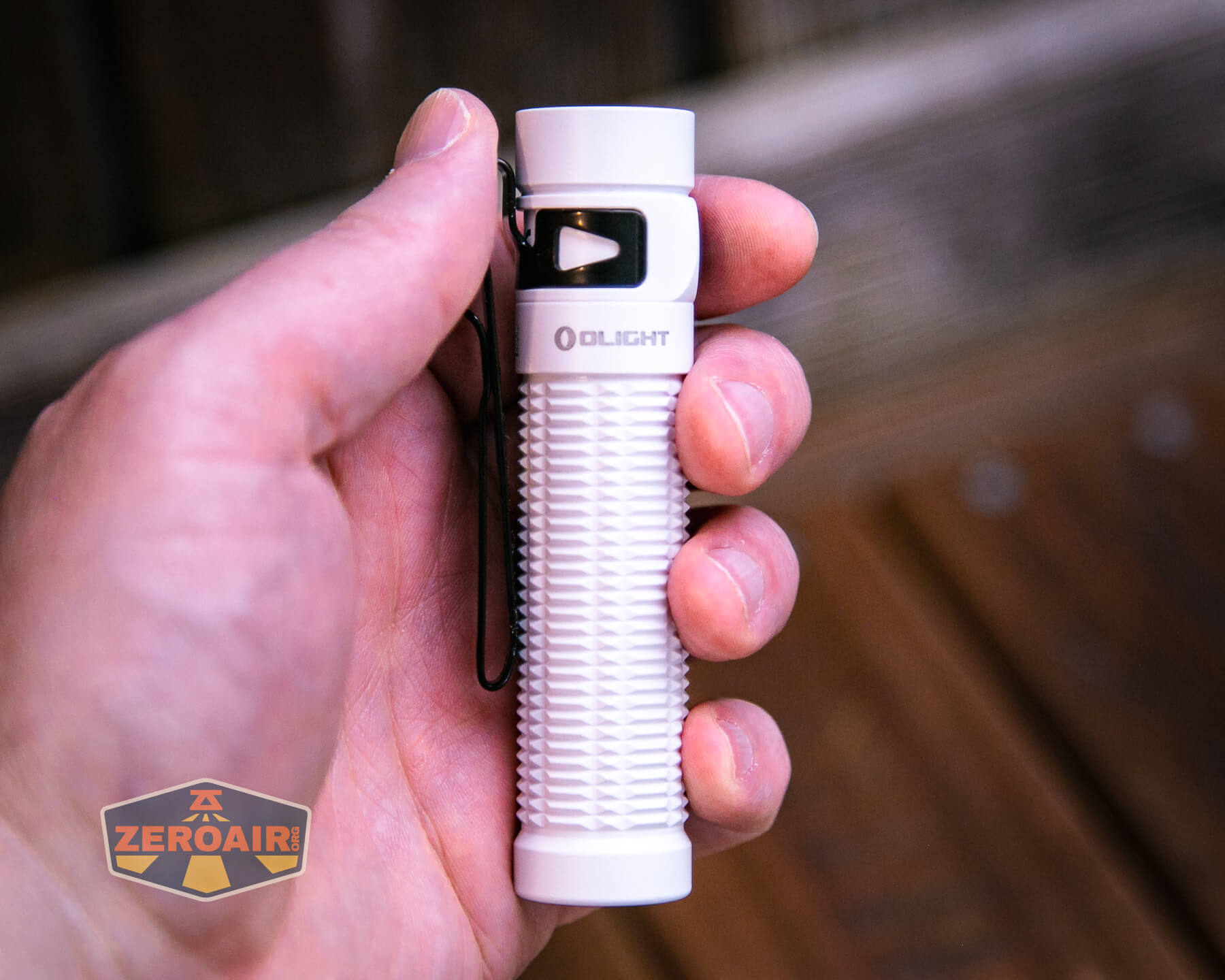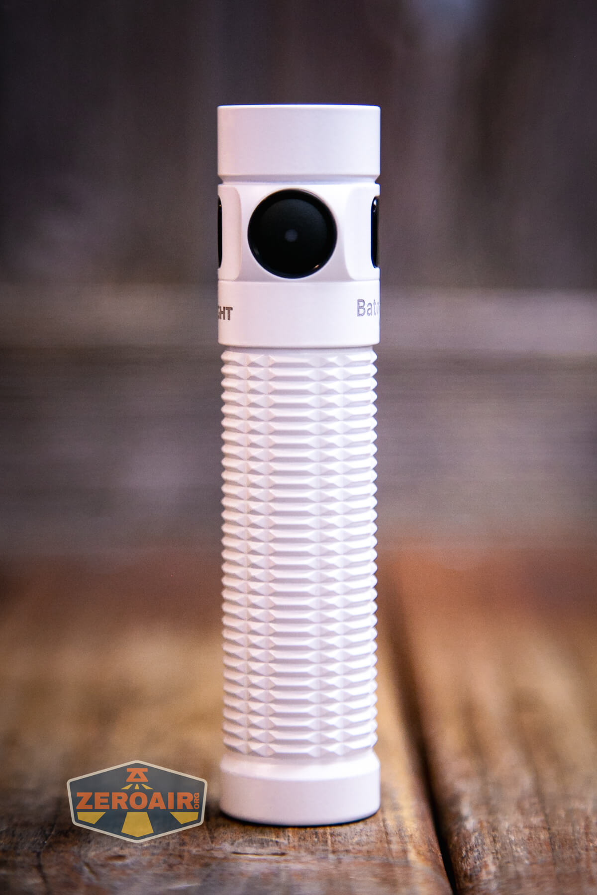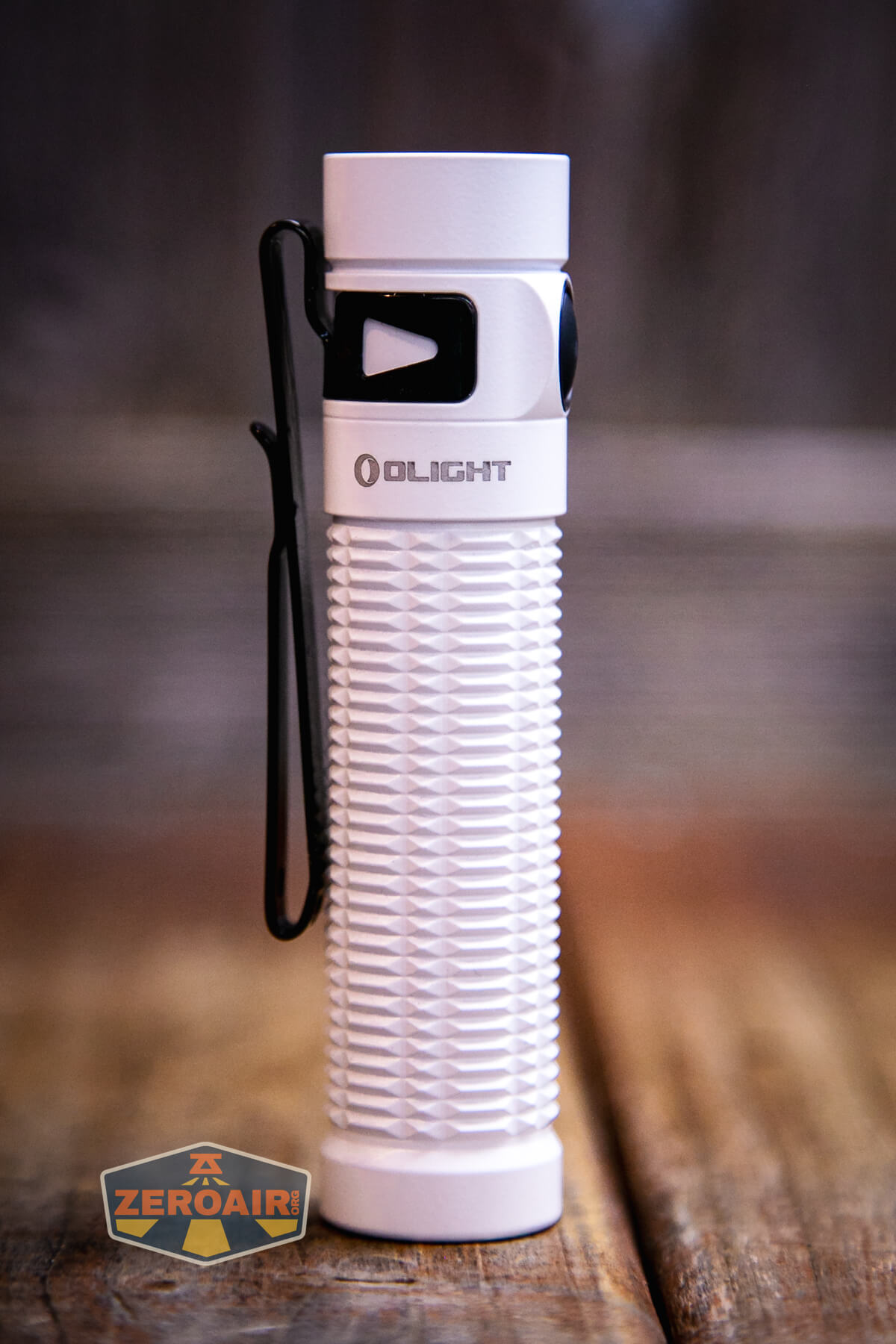 For lack of talking about the white finish anywhere else in the text, let me just do that right here. Between these two big ol’ galleries of this incredible white Olight Baton 3 Pro rechargeable flashlight. I had some concern when removing the cell from the light (which you might only ever have to do once, if you always use onboard charging!). I thought the black clip might mark up the white body. Two things: it really did not seem to do so (also you could protect the body with a credit card between the pieces if you wished.) And 2: the white really does not feel like you probably think it feels. It’s not matte and chalky feeling. It also doesn’t exactly feel like anodizing. Based on the lights I’ve handled, I’d say it feels closest to a powder coat finish! Those are very robust so if that’s what it is, then I’d call that a huge win. (Though since the price here is the same as other anodized models in this line up, I’d guess it’s not actually powder coat.) Whatever the case is, this white isn’t the type to pick up tons of fingerprints and soak up color from all things it touches. I don’t think it’s like the Convoy MAO white (but I haven’t had those, so I don’t really know.) I like this Olight Baton 3 Pro rechargeable flashlight in white much more than I expected to!