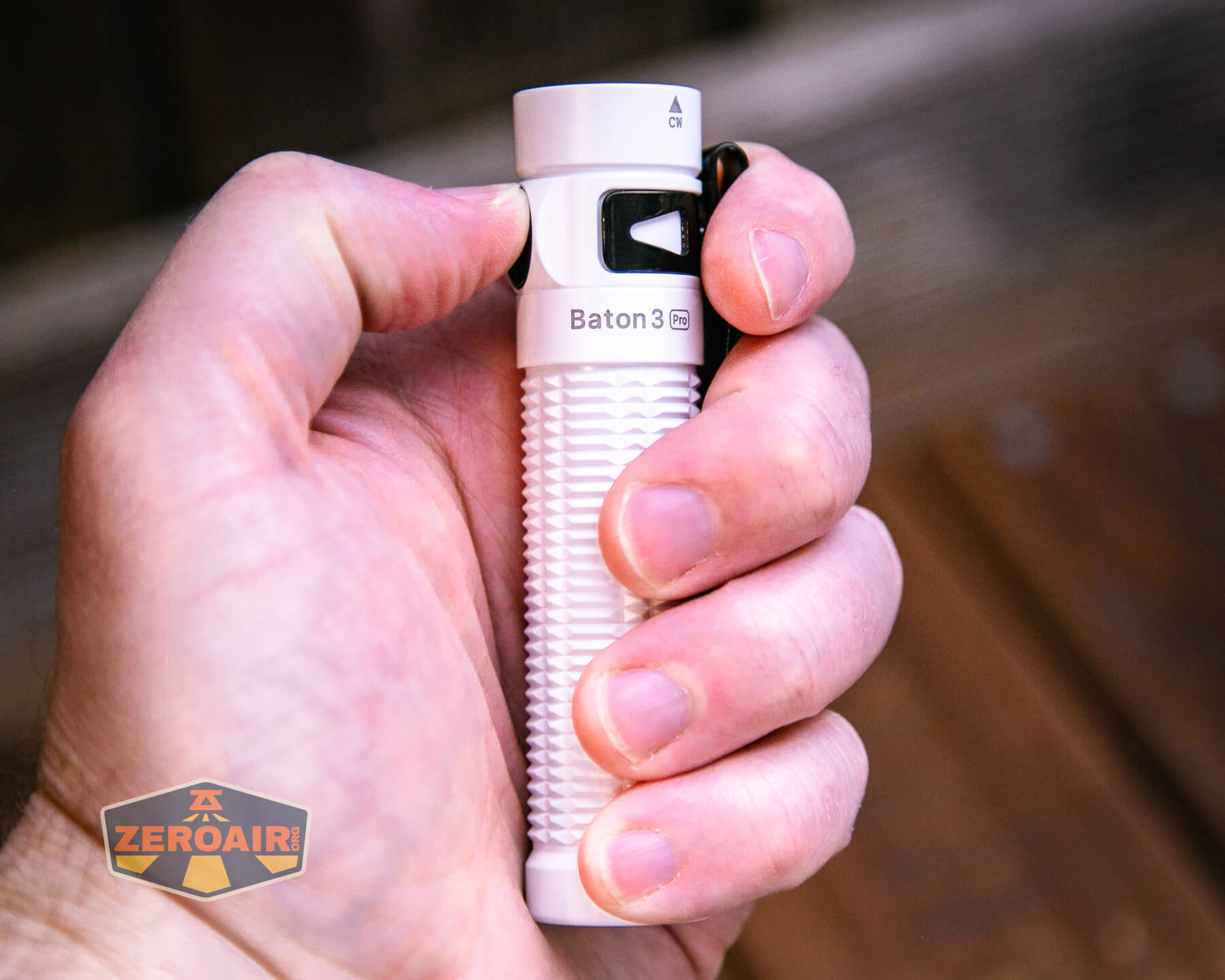 I couple of things right off the top here: I love the new switch cover offered on all these Baton 3 Pros. It’s bigger (comparatively really “much” bigger) and I love that. This increases usability greatly. Also, while I wouldn’t say that the clip change confers any difference in usability, but it somehow feels more solid.