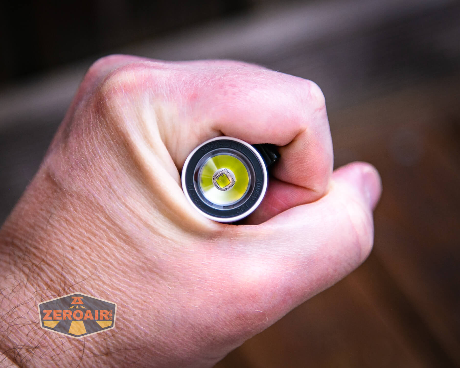 In this version of the Olight Baton 3 Pro flashlight is probably a Luminus SST-40 emitter, just like we saw on the S2R Baton II. But Olight doesn’t say. Either way, that emitter is coupled with a TIR and provides a very pleasant beam profile.