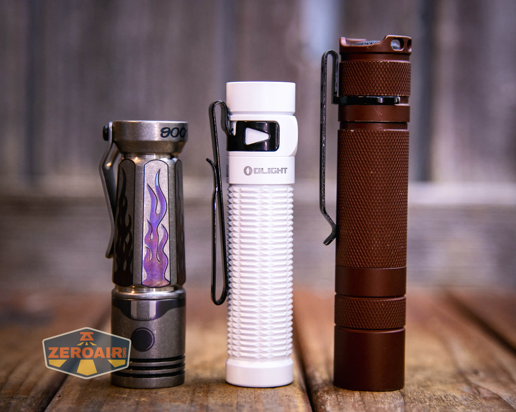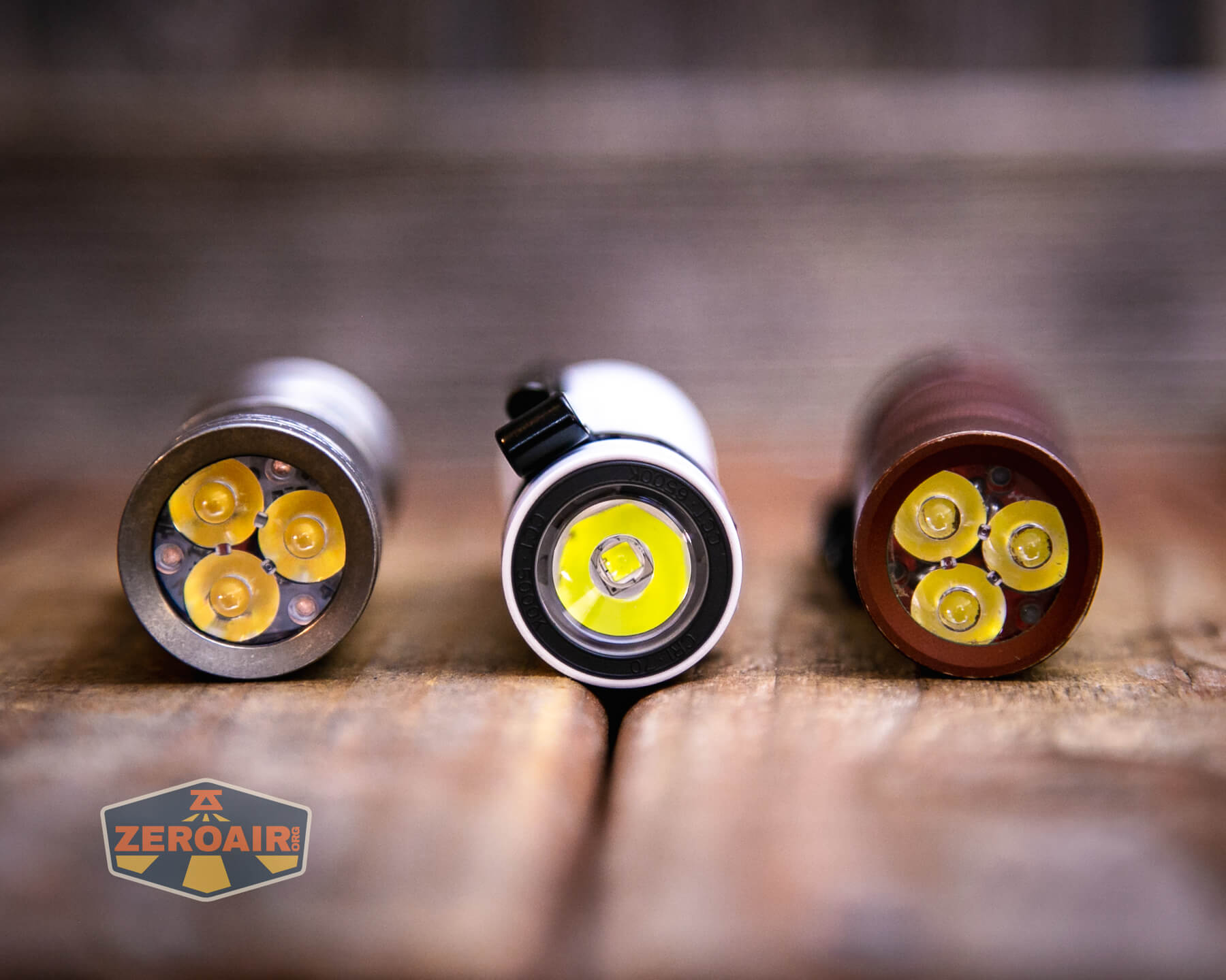 Also above on the left is a new feature light!! Laulima Metal Craft sent this titanium Todai for some size comparison photos like the ones above. Laulima has bunch of incredible items. I’ve tested one (the Laulima Metal Craft Hoku) (the official site for Hoku is here) that was a Friend Fund Friday review. I was impressed enough by that Hoku that I bought a Laulima Metal Craft Diamond Slim (also in tumbled aluminum) (review is upcoming!) These lights by Laulima have impeccable build quality and not only that, they’re quite configurable. There are some (great, actually) default configurations, but Joshua Dawson (of Laulima Metal Craft) is open to ideas and emitter options and the like. I haven’t reviewed this Todai, but I have to say, it feels absolutely fantastic and I love it thus far. (Notably, I love how warm and eggy those emitters look through the TIR.)