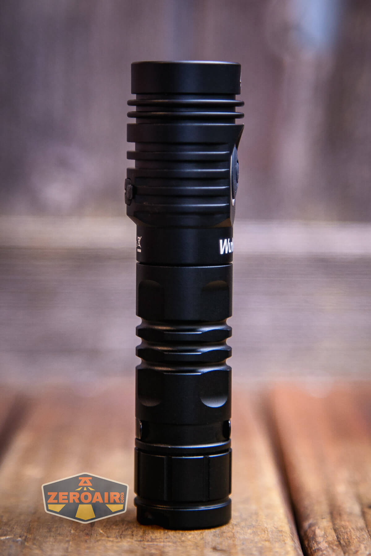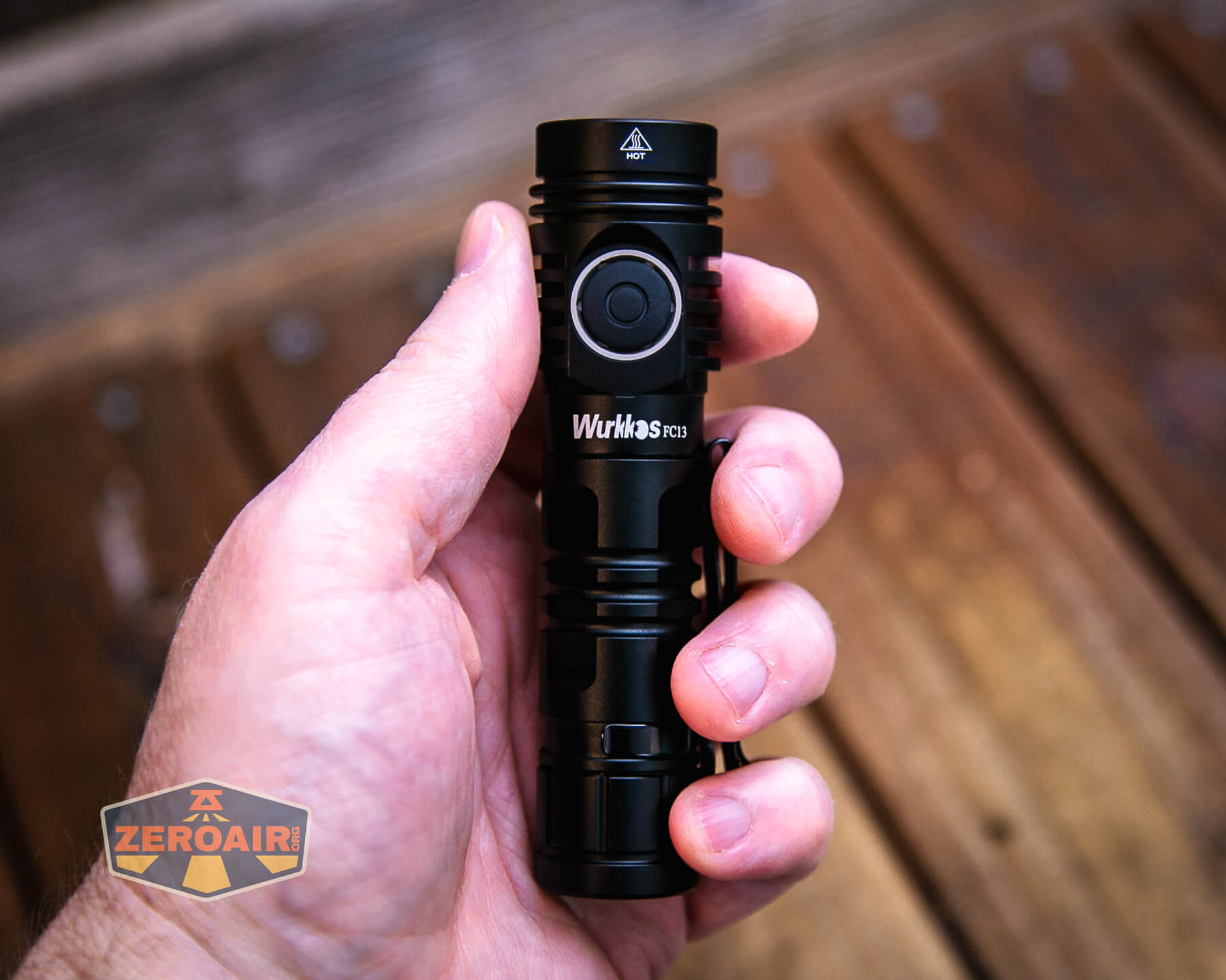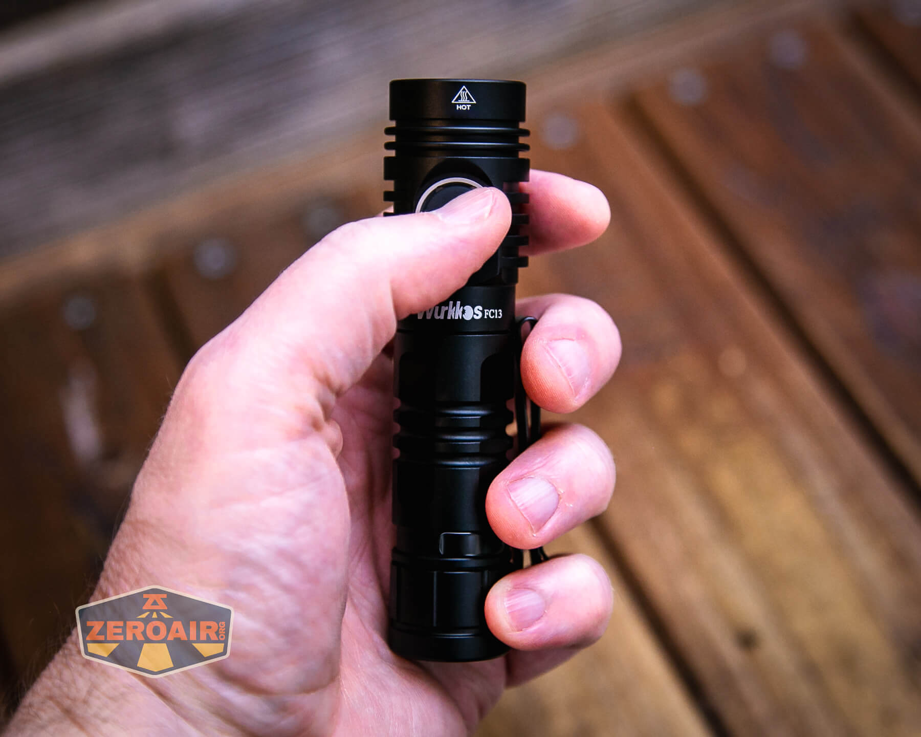 A black Wurkkos flashlight with a pocket clip rests on a wooden surface. The lens has an orange tint, and the ZeroAir logo is visible in the bottom left corner.