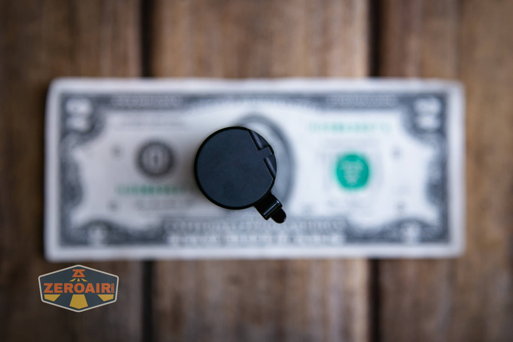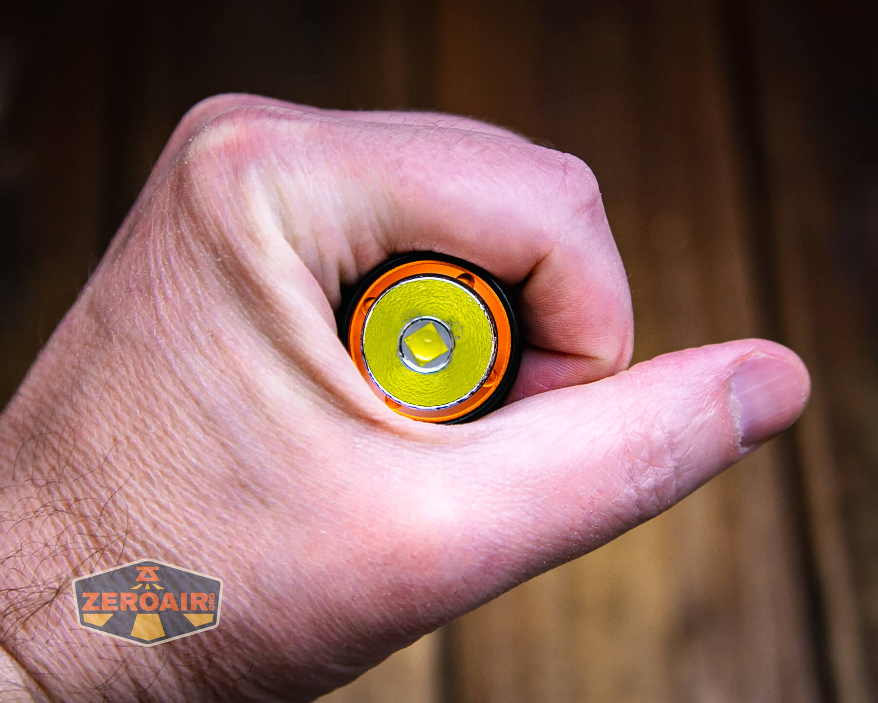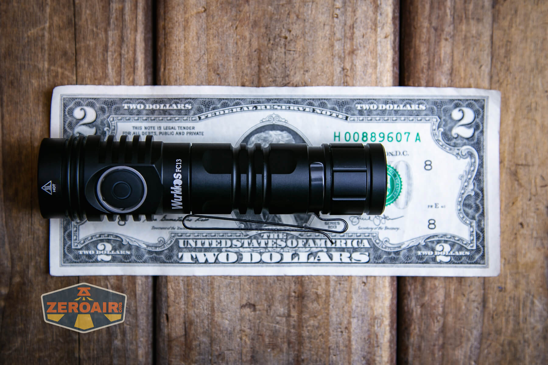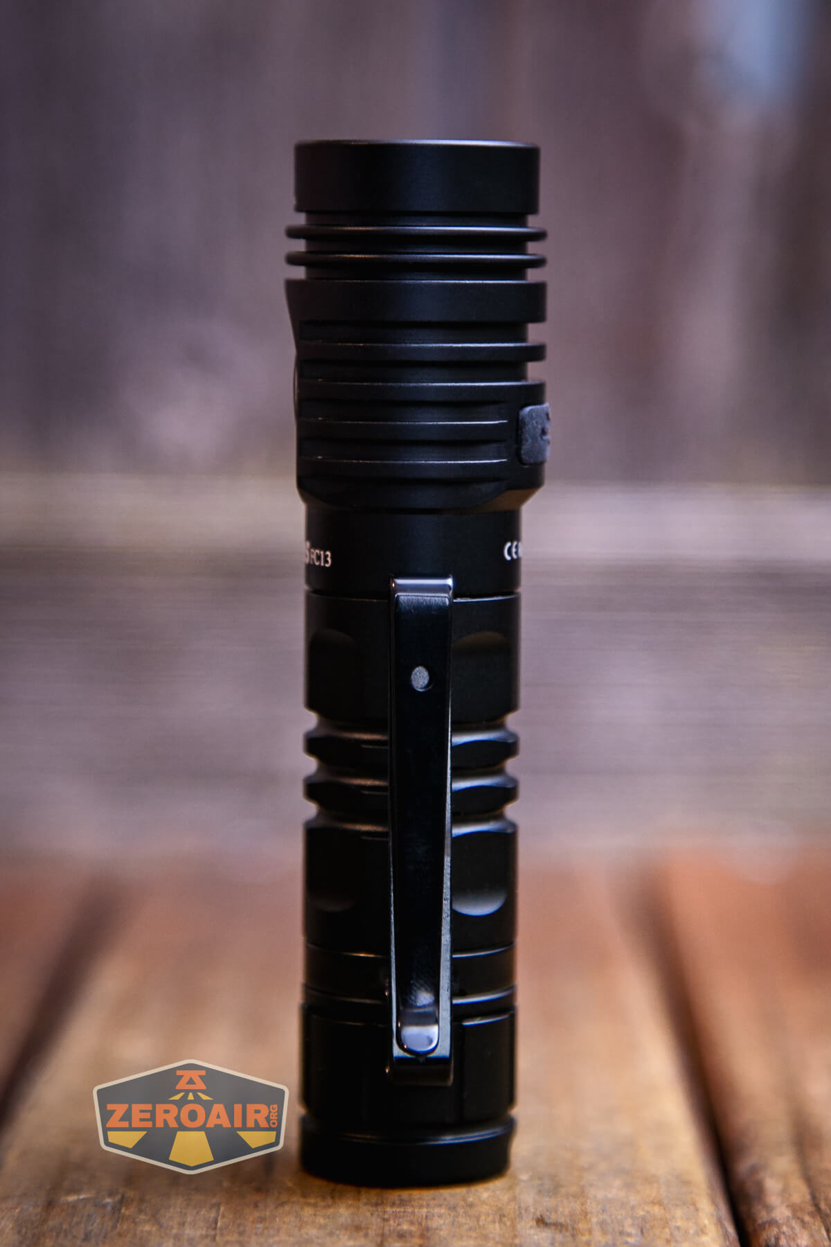 A black Wurkkos flashlight with a pocket clip rests on a wooden surface. The lens has an orange tint, and the ZeroAir logo is visible in the bottom left corner.