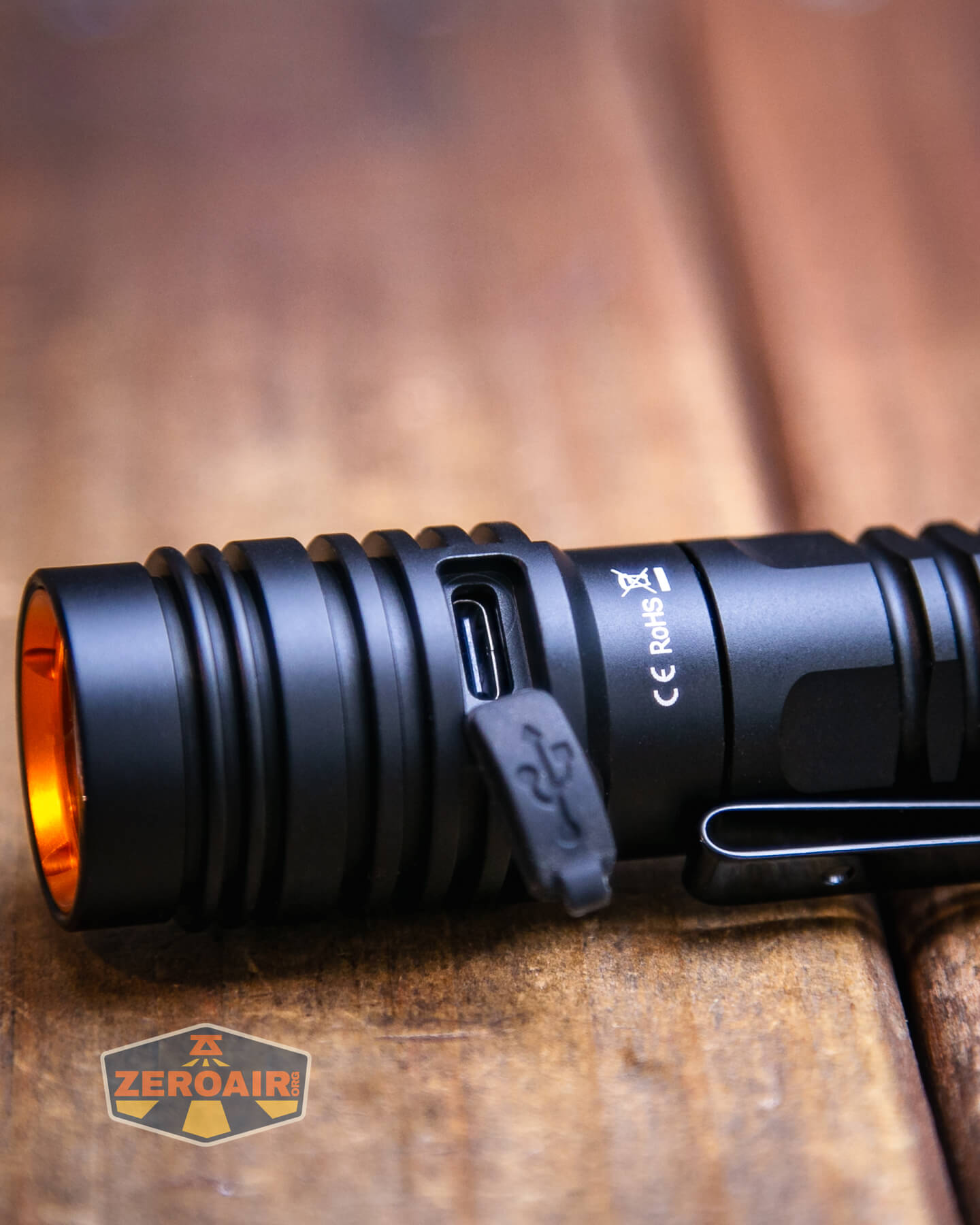 Another feature of the Wurkkos FC13 flashlight is built-in charging. There’s a USB-C port in the head, which has a press-in cover. This cover is quite thick, and when installed properly, very secure. It has a thick edge and must be pushed deliberately into the opening.